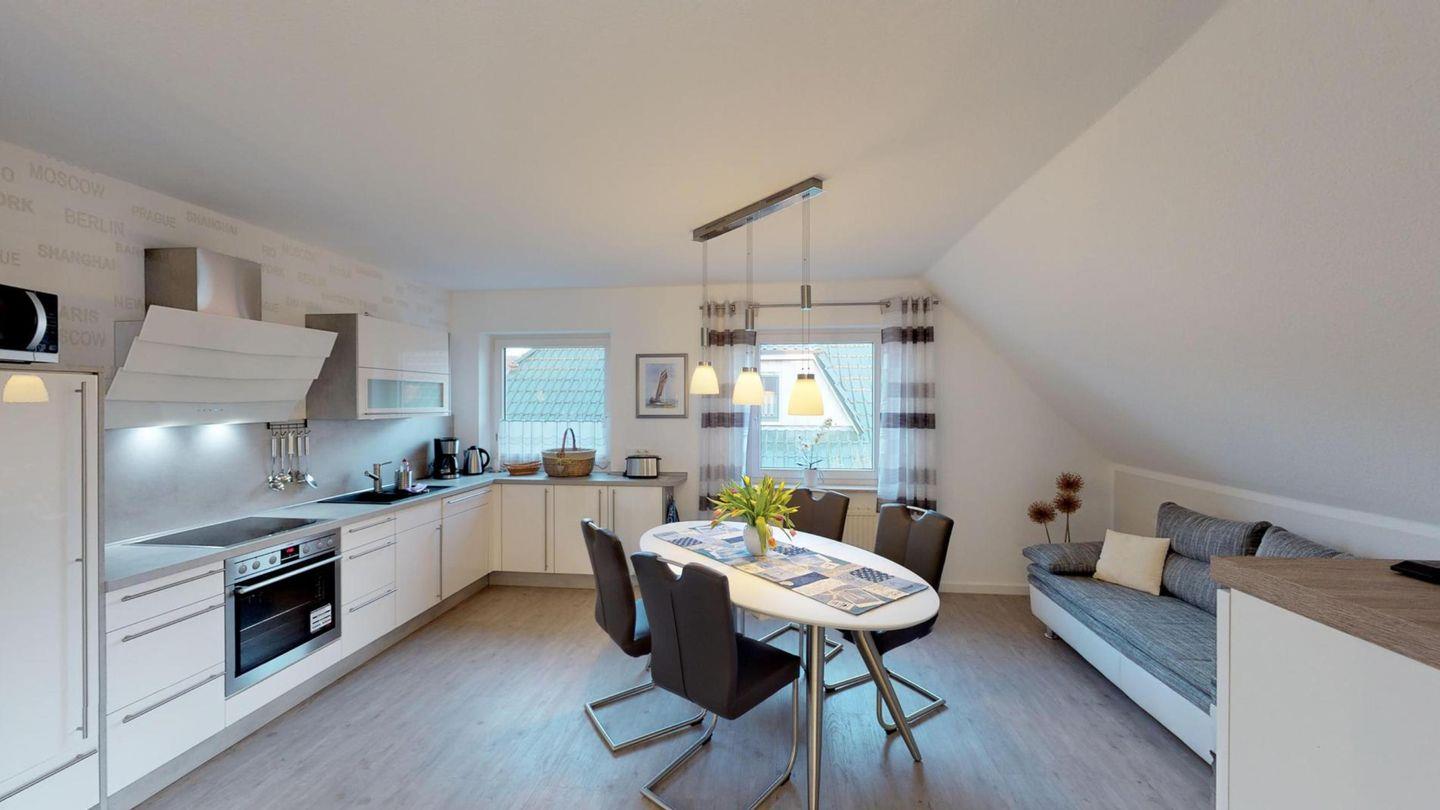 Das ca. 63 m² große, ruhig gelegene und liebevoll eingerichtete Feriendomizil für zwei Personen, ist im Zingster Zentrum zu finden. Der Strand und die Flaniermeile befinden sich in diesem Bereich des Ortes nur einen „Katzensprung“ entfernt. Bestehend aus einem lichtdurchfluteten Wohnraum mit einer integrierten Küche, lädt die Ferienwohnung zum Verweilen ein. Sonnenanbeter finden auf dem großzügigen Südbalkon viel Platz sich zu entfalten. Das Badezimmer ist mit einer ebenerdigen, komfortablen Dusche ausgestattet. Mitgebrachte Fahrräder finden in dem zur Wohnung gehörenden Fahrradschuppen Platz.