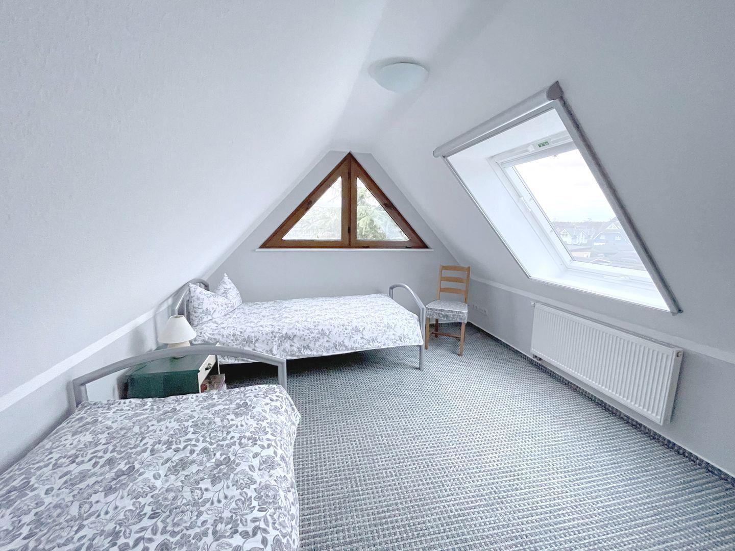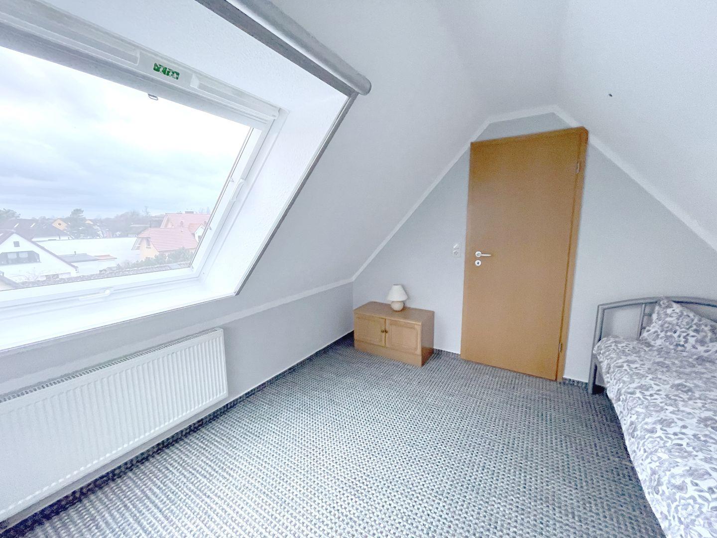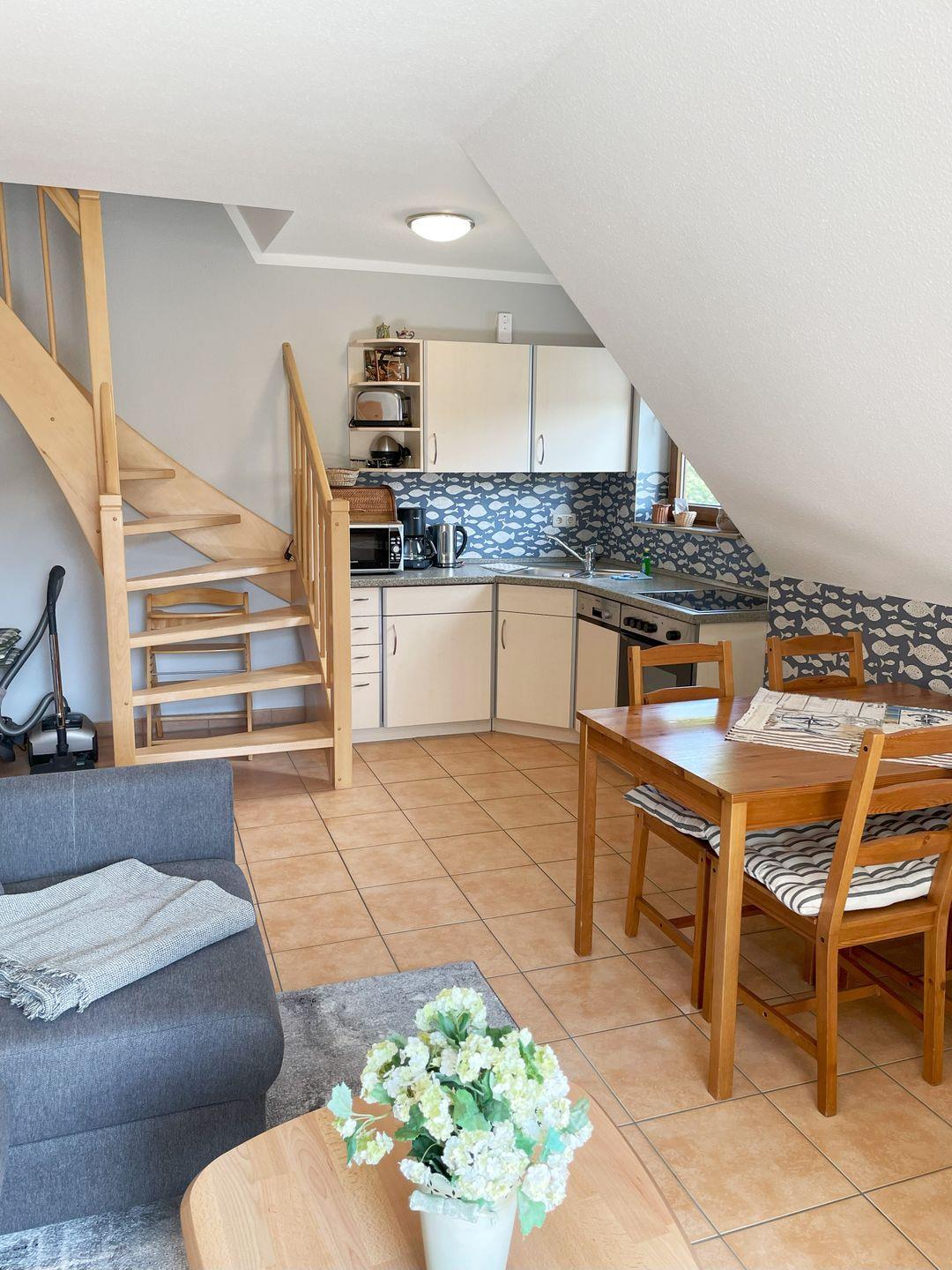 Die 50 m² große Maisonettewohnung wird bevorzugt an 2 Erwachsene und 2 Kinder vermietet. Der Wohnraum mit integrierter Küche und Essecke hat einen direkten Zugang zum Südbalkon. Das Bad mit Dusche und WC befindet sich auf der Wohnebene ebenso wie das Elternschlafzimmer mit Ehebett. Das 2. Schlafzimmer ist mit 2 Einzelbetten ausgestattet und liegt im Dachgeschoss. Die bezogenen Betten sowie das Wäschepaket sind in diesem Objekt inklusive. Ein kleiner Elektrogrill für den Balkon und ein Interzugang über W-LAN ergänzen die Ausstattung.