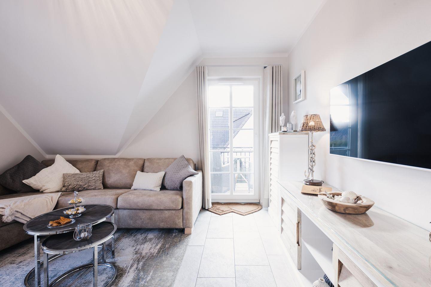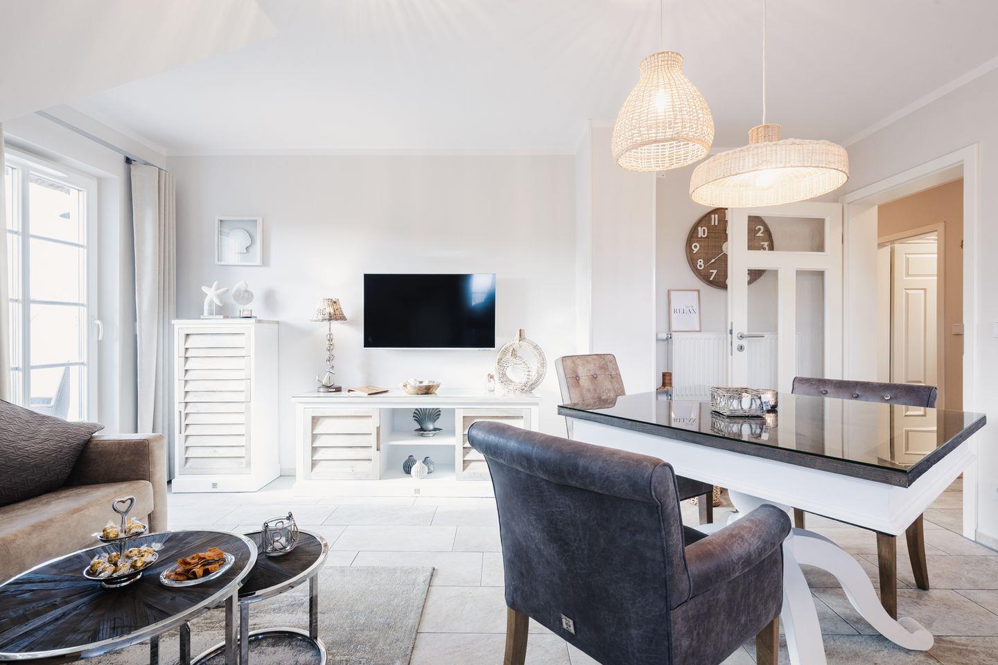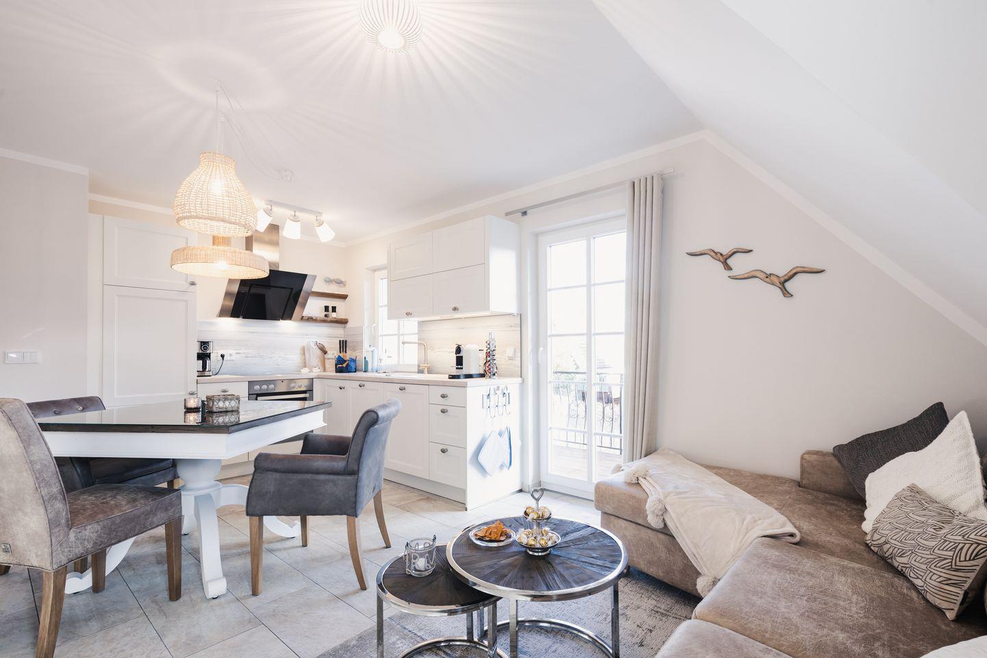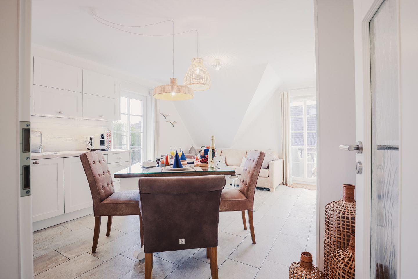 In der Diele befindet sich eine kleine Sitzbank mit Ablagemöglichkeiten für Ihre Schuhe sowie die Garderobe. Der helle Wohnraum ist mit einer gemütlichen Eckcouch mit TV-Board für gemütliche Abende ausgestattet und hat Zugang zum sonnendurchfluteten Südbalkon auf der einen und zum großen Ostbalkon auf der anderen Seite. Die Mitte des Raumes ist mit einem hochwertigen Esstisch und vier bequemen Stühlen ausgestattet und lädt zum Dinieren ein. Die integrierte Küche ist mit allem ausgestattet, was man zum Kochen benötigt.