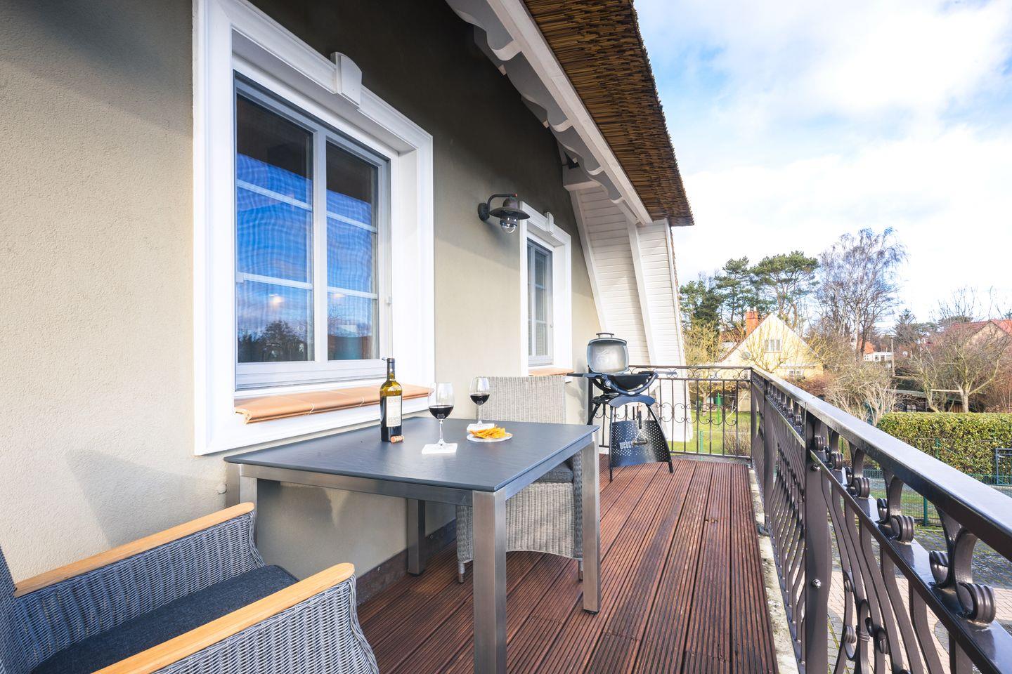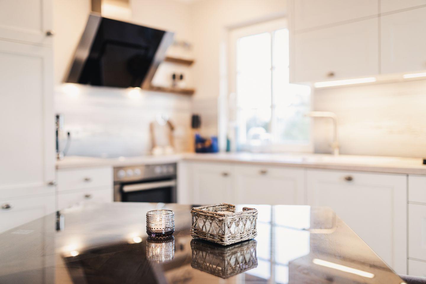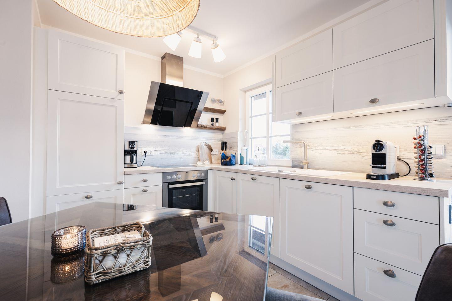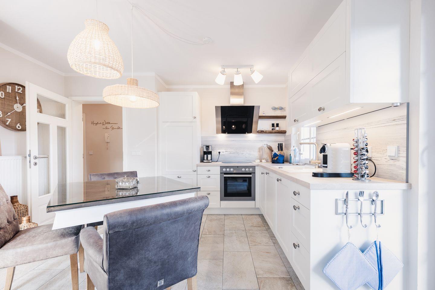 In der Diele befindet sich eine kleine Sitzbank mit Ablagemöglichkeiten für Ihre Schuhe sowie die Garderobe. Der helle Wohnraum ist mit einer gemütlichen Eckcouch mit TV-Board für gemütliche Abende ausgestattet und hat Zugang zum sonnendurchfluteten Südbalkon auf der einen und zum großen Ostbalkon auf der anderen Seite. Die Mitte des Raumes ist mit einem hochwertigen Esstisch und vier bequemen Stühlen ausgestattet und lädt zum Dinieren ein. Die integrierte Küche ist mit allem ausgestattet, was man zum Kochen benötigt.