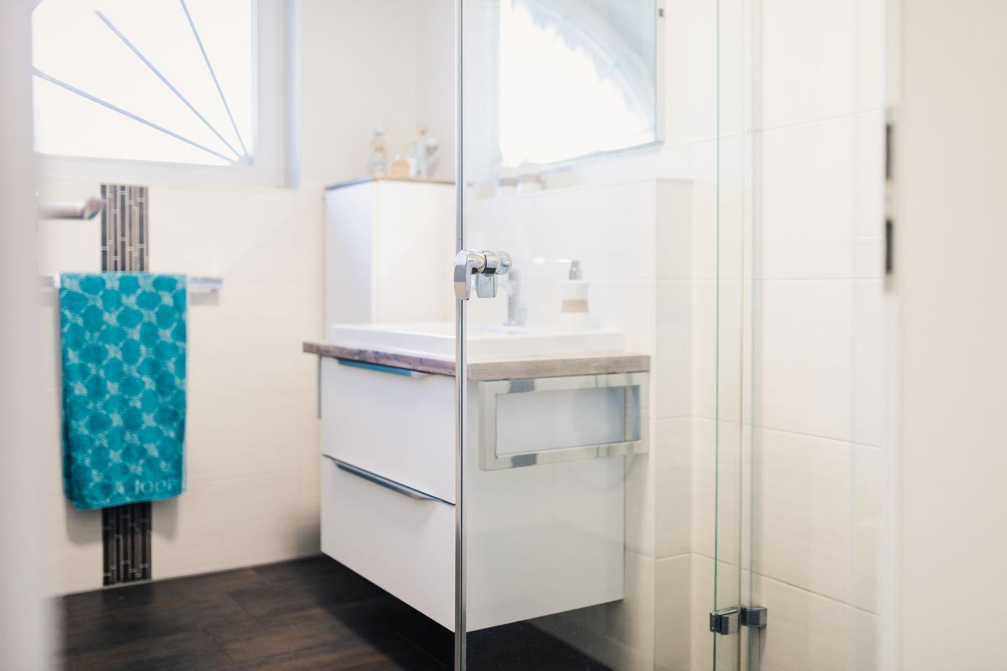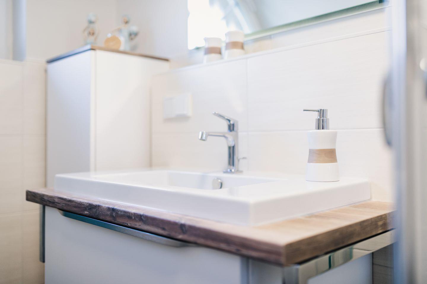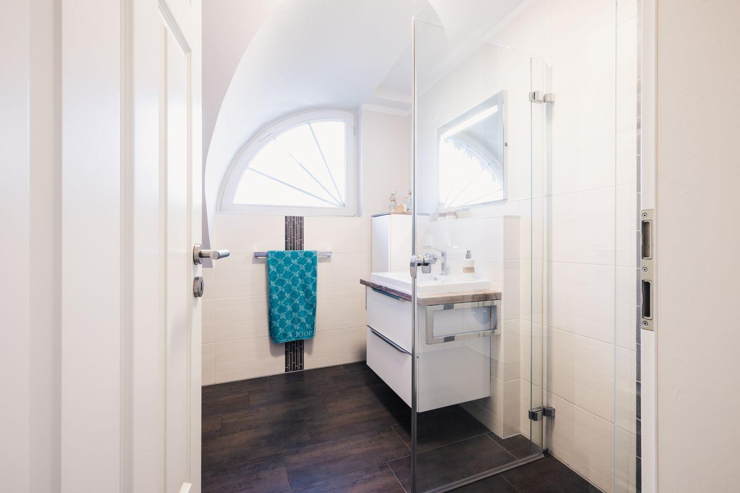 Das helle Tageslichtbadezimmer ist mit einer ebenerdigen Dusche ausgestattet, einem Handtuchheizkörper, einem Föhn sowie ausreichend Stauraum für Kosmetik- und Pflegeartikel und einer Waschmaschine ausgestattet.