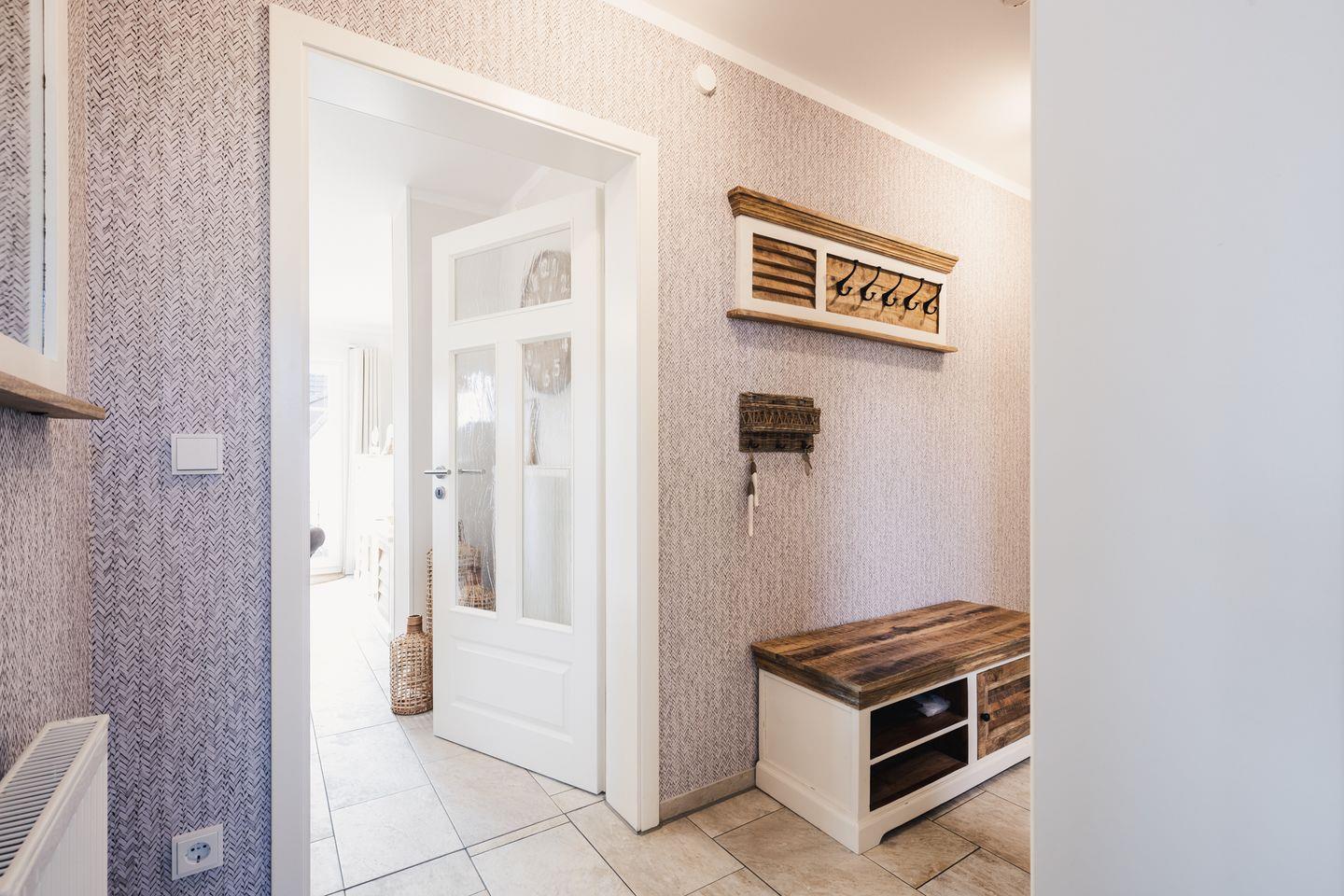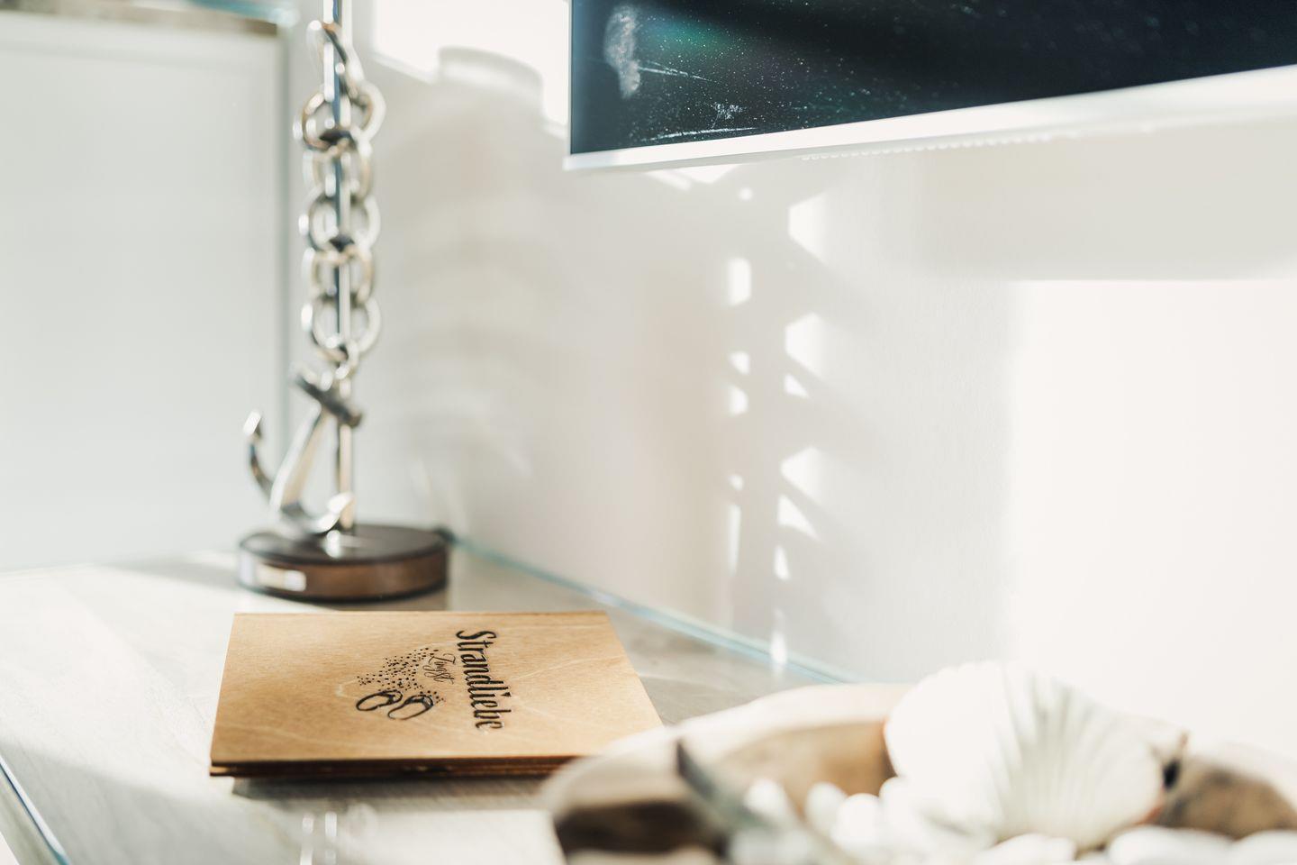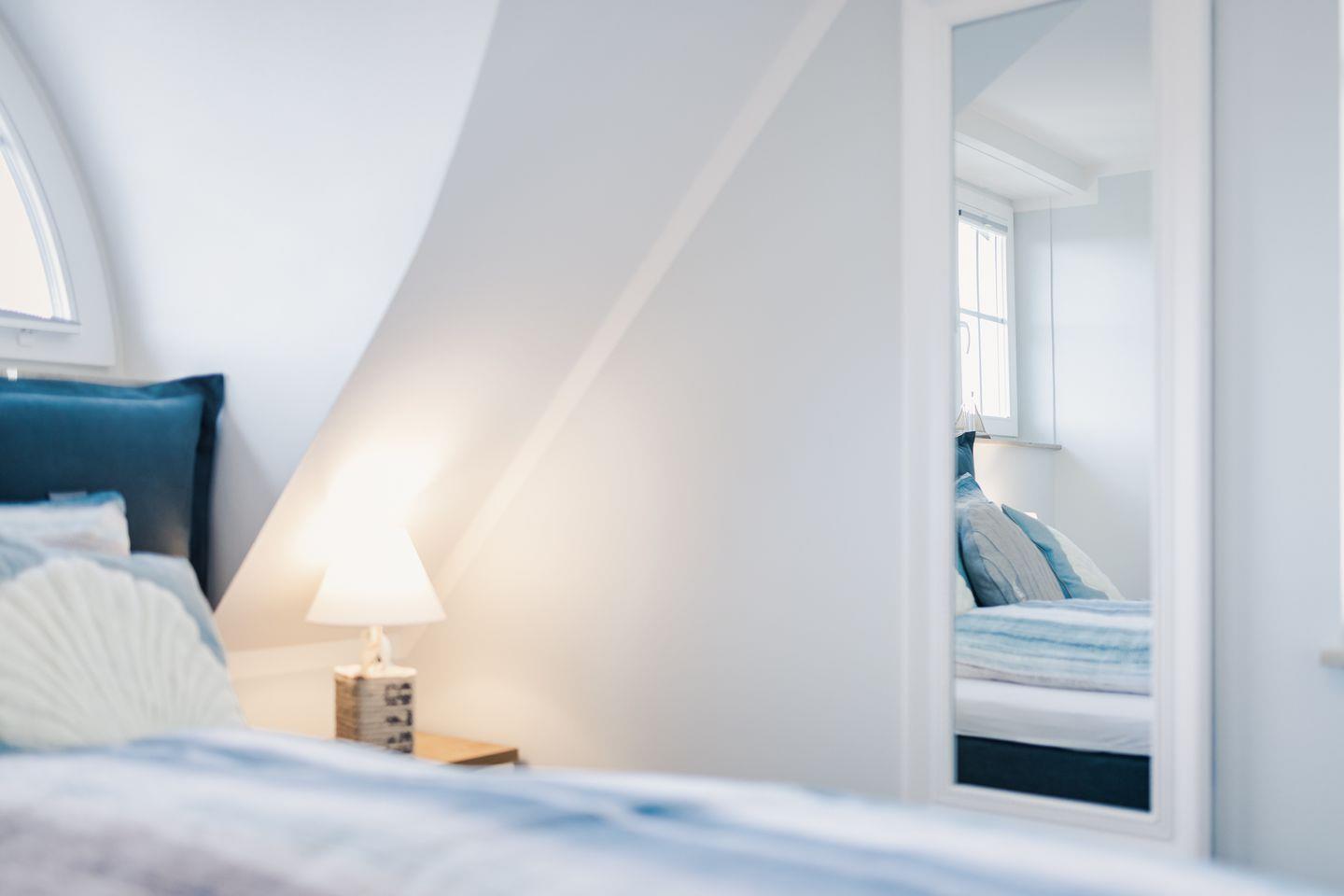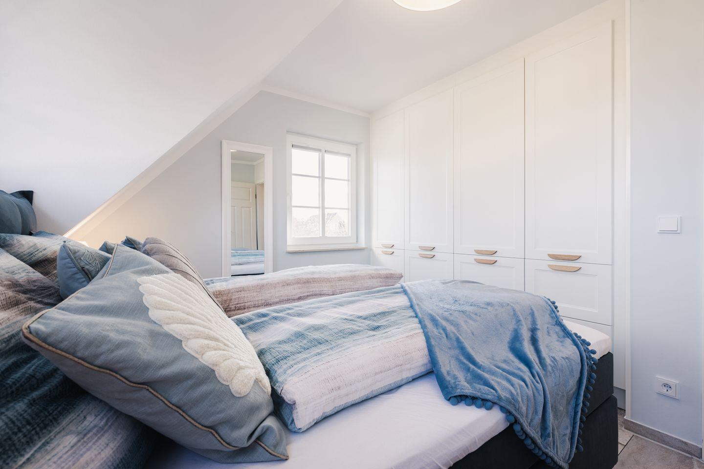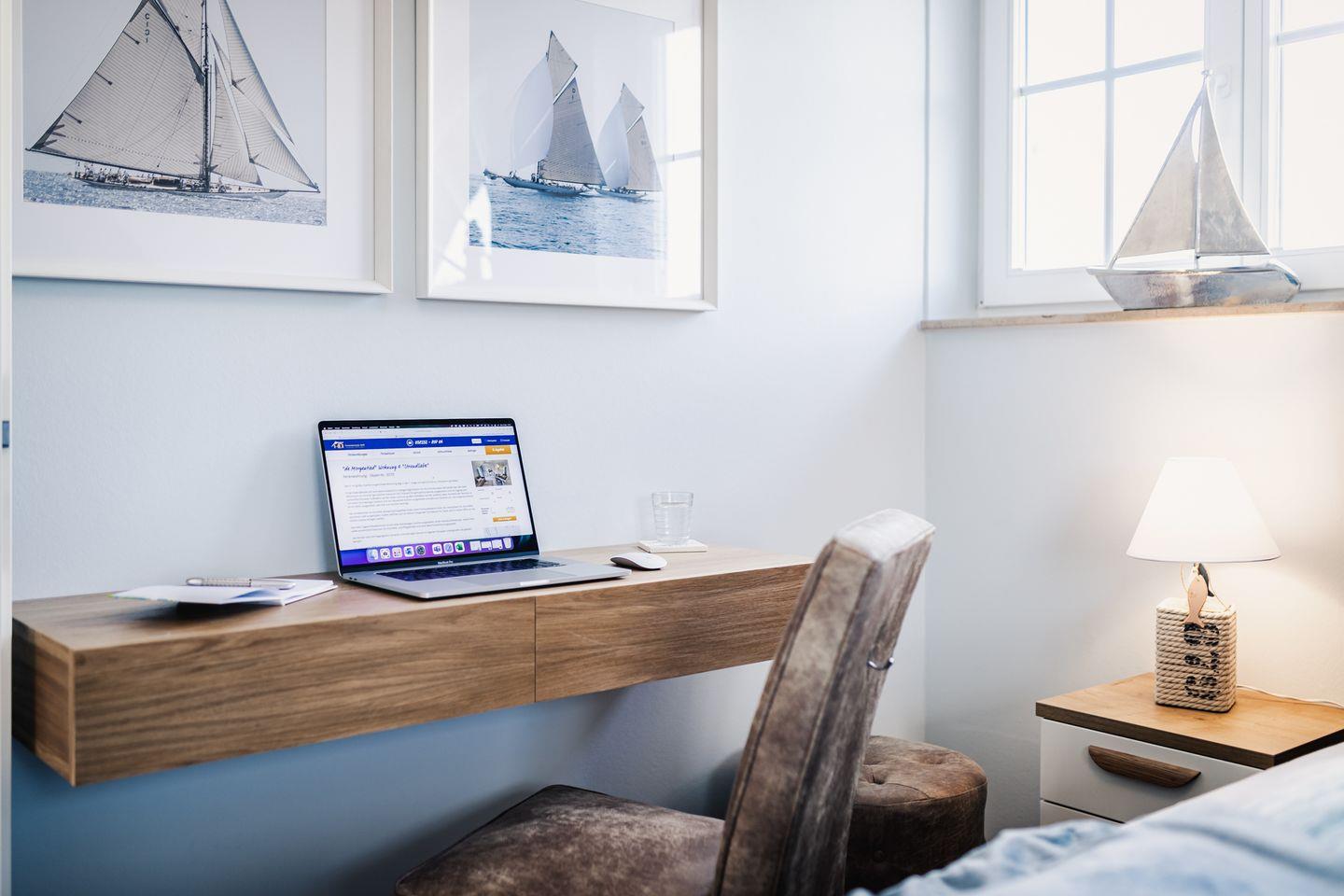 Das Schlafzimmer ist mit einem Boxspring-Doppelbett sowie einem Einbaukleiderschrank inkl. Verstaufach für Ihre Koffer und einem Safe ausgestattet. Zudem befindet sich ein kleiner hängender Schreibtisch für Gäste, die ihr Home-Office an die schöne Ostsee verlagern wollen. Die Betten sind bei Anreise für Sie frisch bezogen und Handtücher liegen bereit.