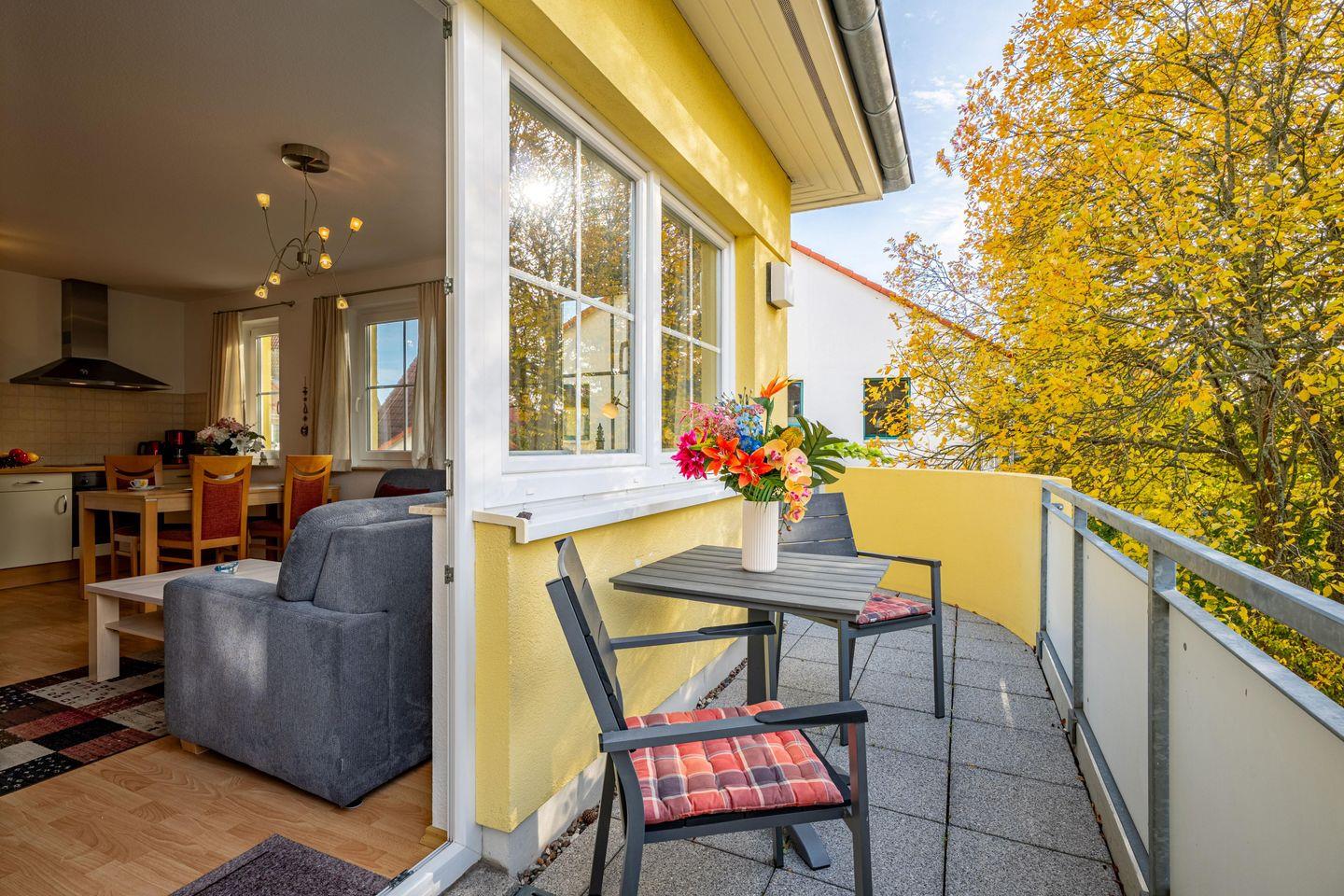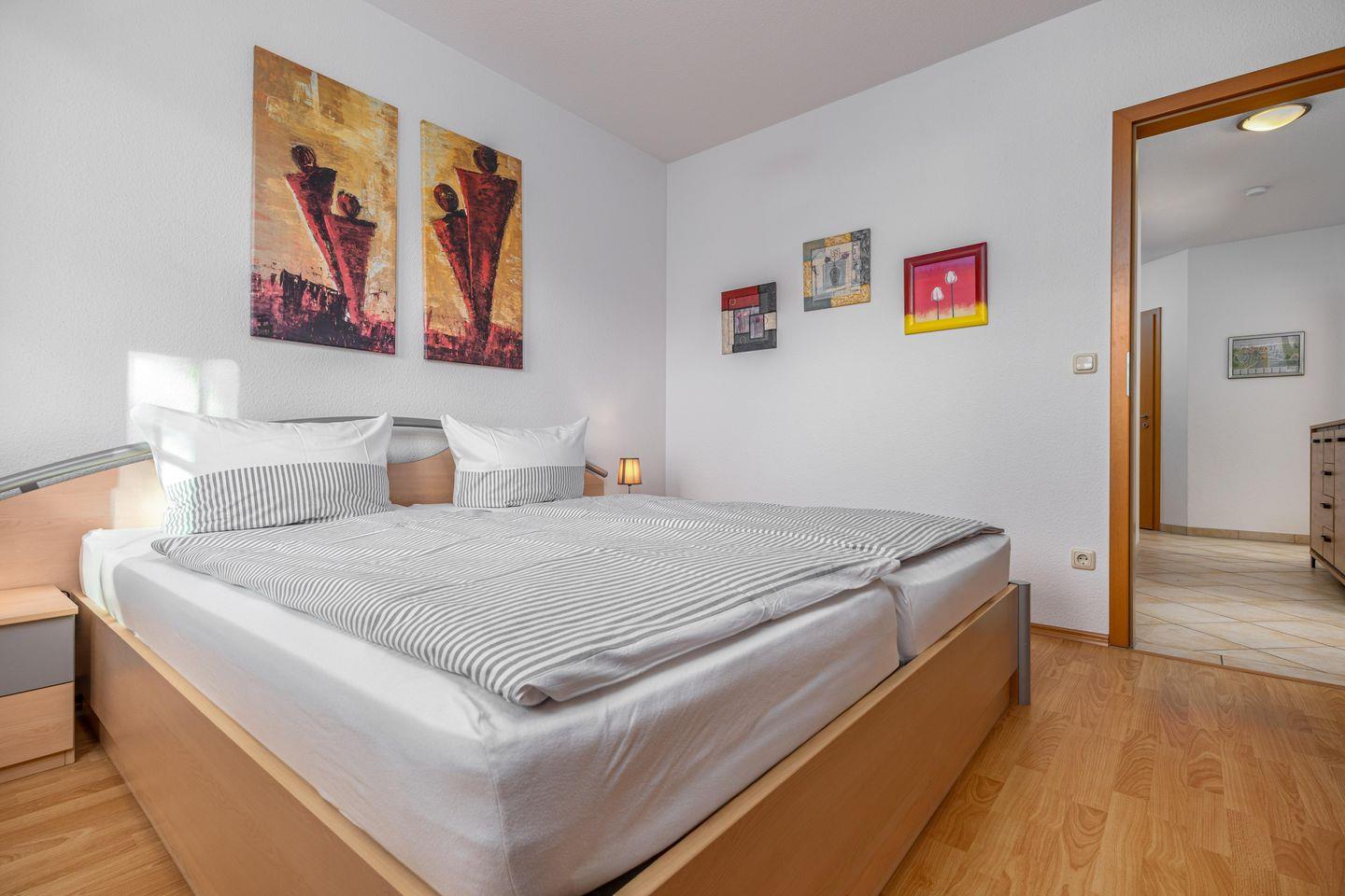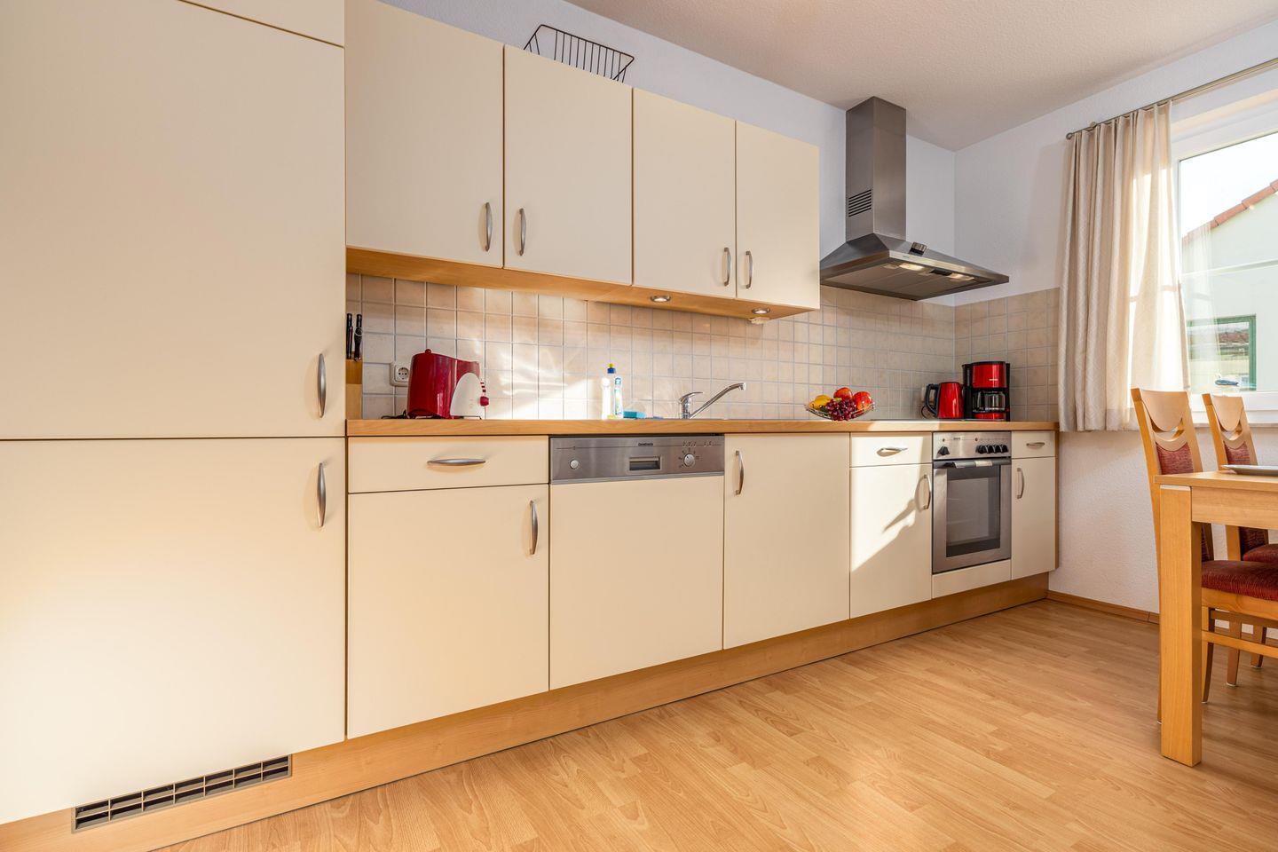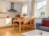 Die 60 m² große Wohnung liegt im 1. Obergeschoss und kann mit maximal 2 Erwachsenen + 2 Kindern angemietet werden. Der Wohnbereich ist aufgeteilt in die integrierte Küche und Essecke sowie einen großzügigen Sitzbereich, von hier aus erreichen Sie auch den Süd-Westbalkon. Es sind zwei Schlafzimmer vorhanden, eines ist mit einem Doppelbett und ein weiteres mit zwei Einzelbetten ausgestattet. Das Badezimmer verfügt über Dusche und WC. Für die Fahrräder steht ein Fahrradschuppen zur Verfügung.