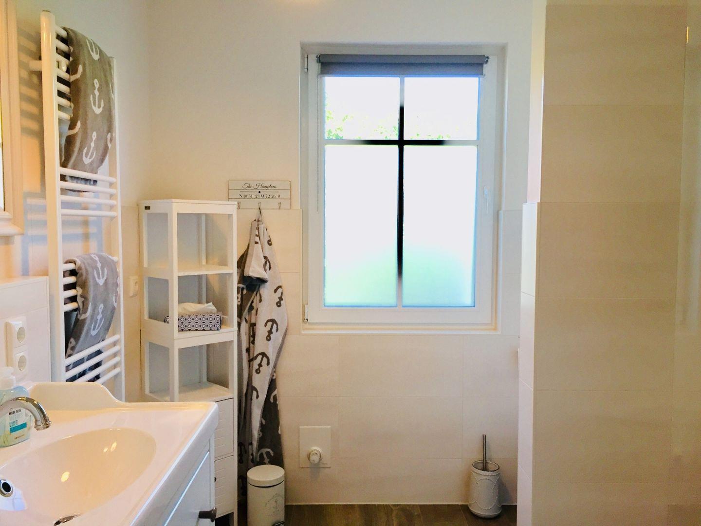 Das moderne Duschbad der Ferienwohnung ist mit einer ebenerdigen Dusche komfortabel eingerichtet. Ein Föhn komplettiert die Ausstattung des Bades. Das Bad ist gefliest. In der Wohnung ist Design-Belag verlegt.
