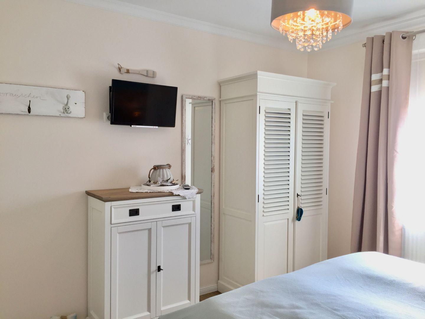 Im Schlafzimmer lädt Sie ein komfortables Boxspringbett (160 x 200 cm) zum erholsamen Schlaf ein. Auch auf einen Fernseher müssen Sie hier nicht verzichten. Der große Kleiderschrank bietet viel Stauraum für Ihre Sachen. Die Schlafcouch im Wohnbereich der Ferienwohnung wird im Handumdrehen zu einem behaglichen Schlafplatz für eine Person.