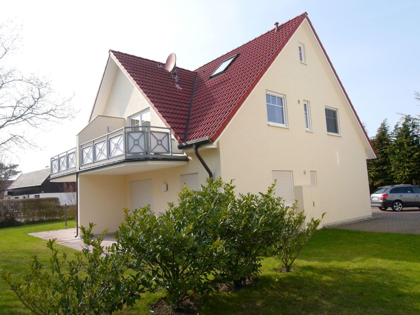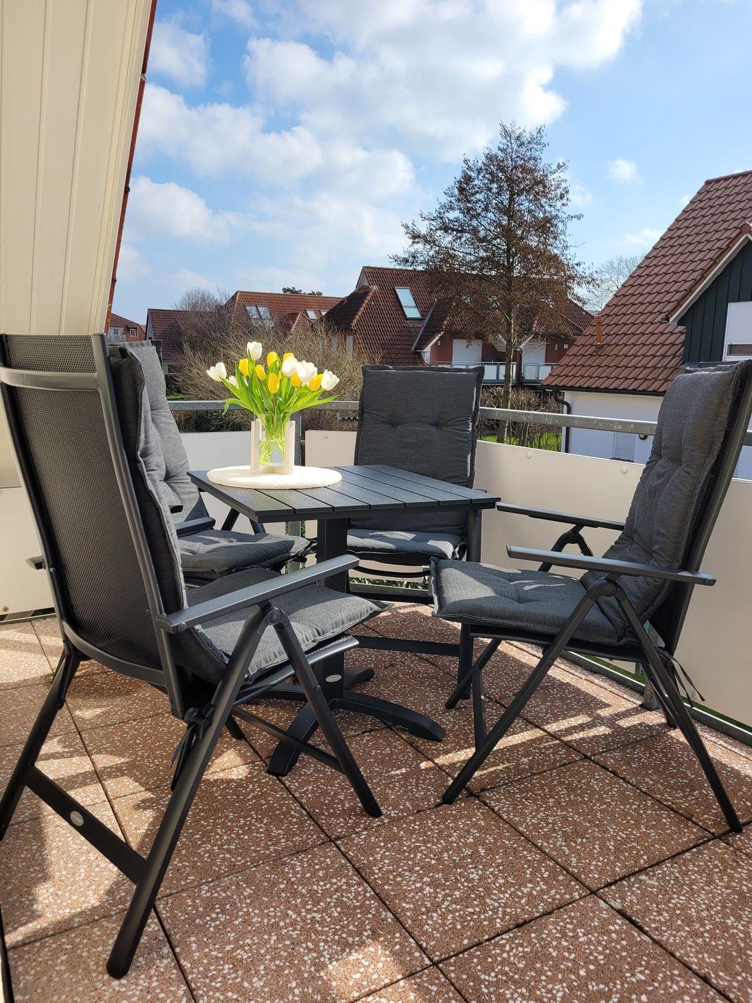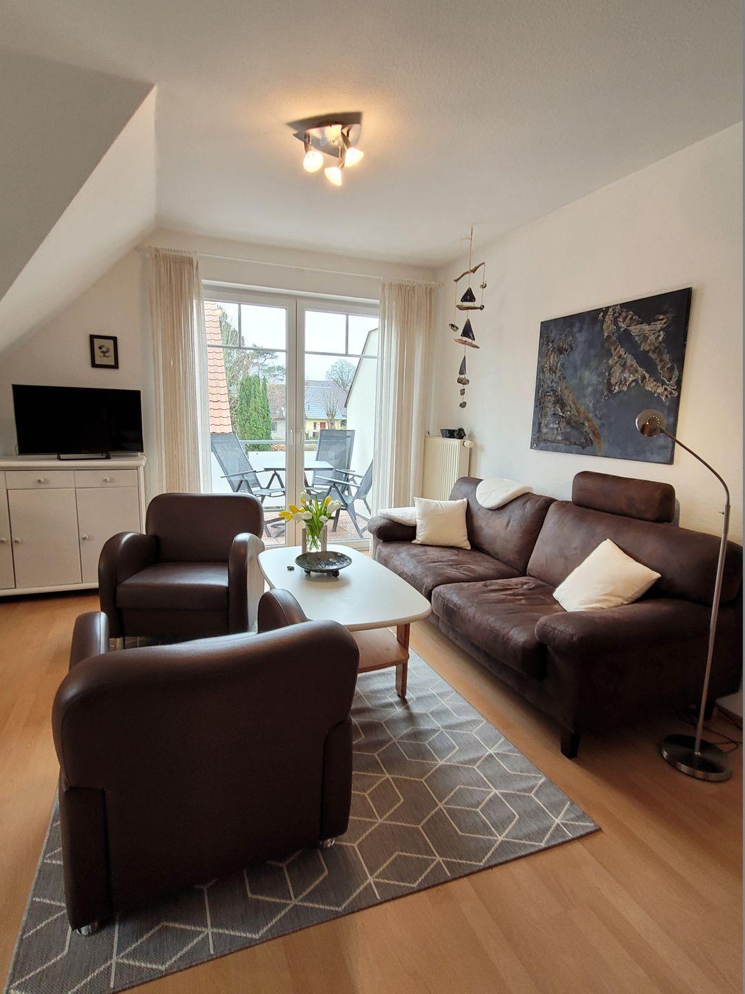 Die 50 m² große Maisonettewohnung kann mit maximal 4 Erwachsenen belegt werden. In den Wohnraum sind Küche und Essecke integriert, von hier gelangt man auch auf den Südbalkon. Ein Schlafzimmer mit Doppelbett (1,80m x 2,00m) und das Badezimmer mit Dusche befinden sich auf der Wohnebene, ebenso wie ein kleiner Hauswirtschaftsraum vor der Wohnung in dem die Münzwaschmaschine zu finden ist. Im Dachgeschoss befindet sich dann das zweite Schlafzimmer mit zwei einzelnen Betten.