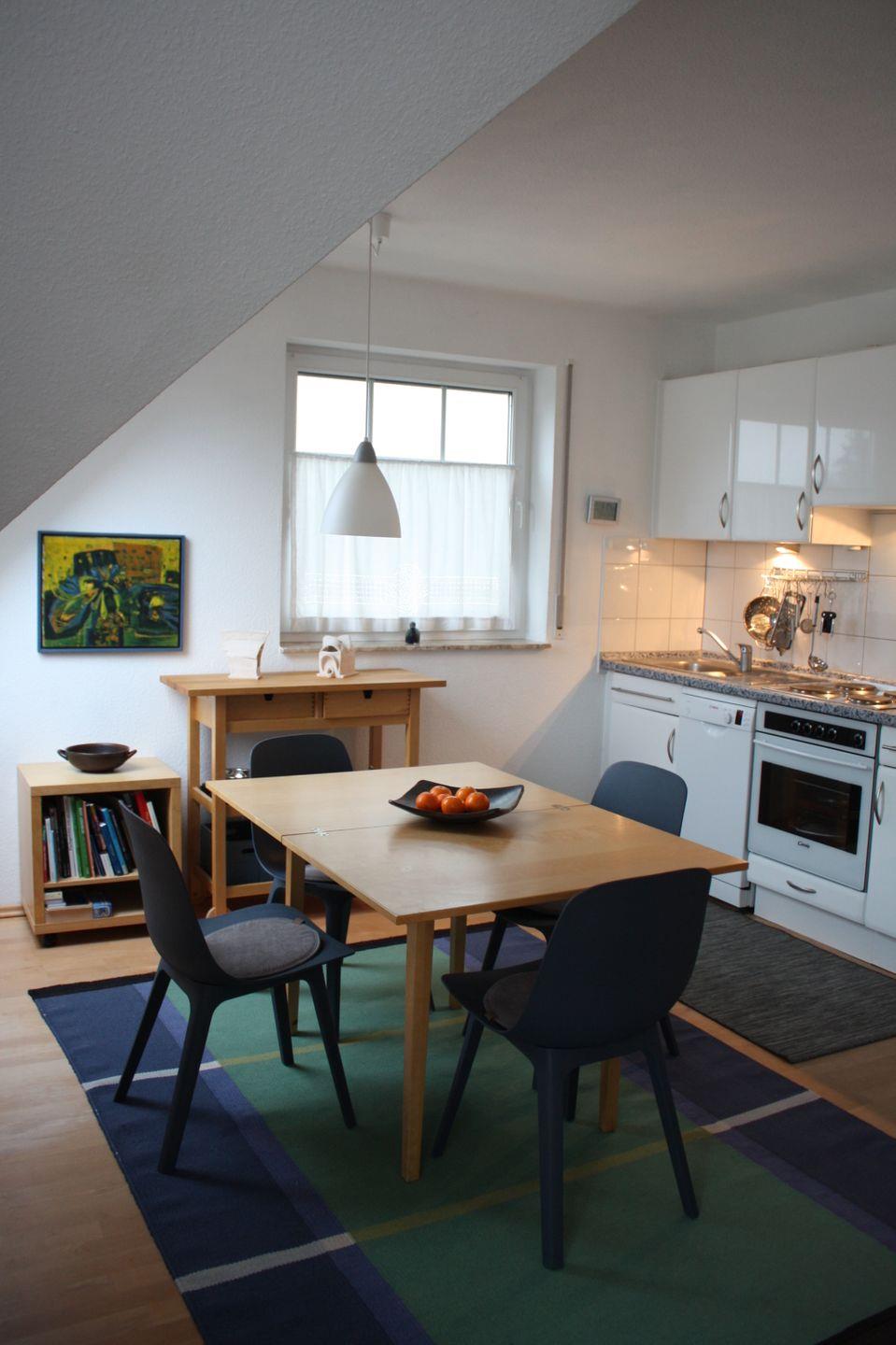 In den Wohnraum sind Küche und Essecke integriert, von hier gelangt man auch auf den großzügigen Balkon, der zum Essen, Lesen und Sonnen einlädt.