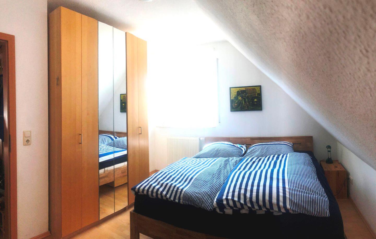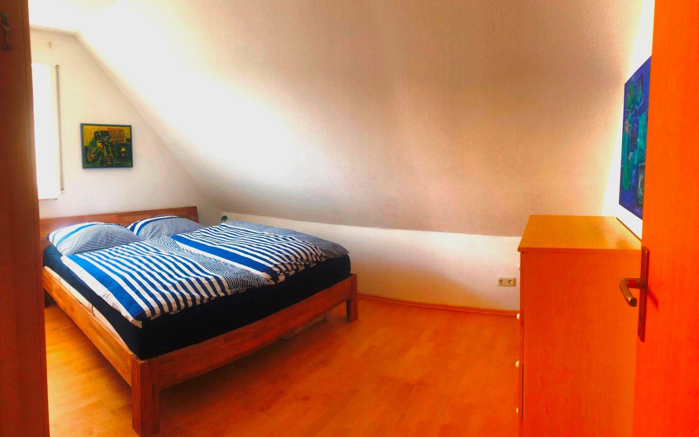 In der für eine Ferienwoche gut ausgestatteten Küche befinden sich Backofen plus Mikrowelle, Handküchengerät, Backformen und Auflaufformen. Wir lieben Kaffee, deswegen haben Sie die Wahl zwischen einer Espressomaschine von Delonghi und einer Filterkaffeemaschine. Das 1,80 m breite Doppelbett im Schlafzimmer ist gerade erneuert worden, mit verstellbarem Lattenrost und einer weichen und einer harten Seite bei den Matratzen, sodass jeder seine Seite auf seine Ergonomie einstellen kann. Auf der unteren Ebene befinden sich auch das helle Badezimmer mit Aussenfenster und der gemeinschaftliche Hauswirtschaftsraum mit Waschmaschine. Auf der oberen Ebene ist das zweite Schlafzimmer mit zwei Einzelbetten und zwei Schreib-und Maltischen. Zahlreiche Bücher, Filme und Spiele für Erwachsene und Kinder können zu gemütlichen Stunden auch im Winter beitragen.