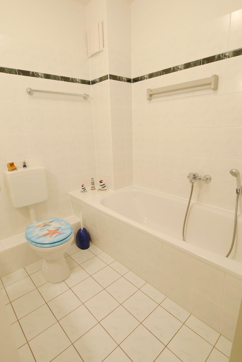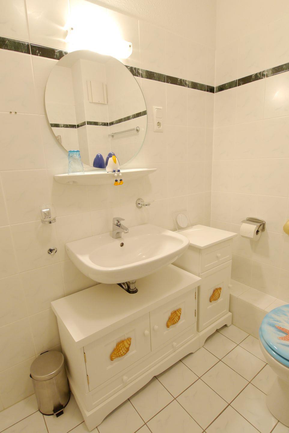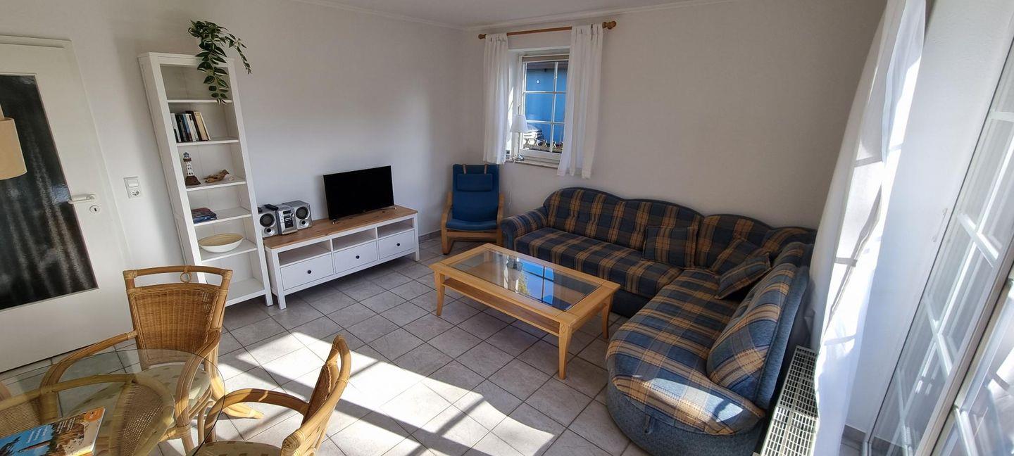 Die 57 m² große Erdgeschosswohnung wird für bis zu 2 Erwachsene und 2 Kinder vermietet. Das Wohnzimmer ist gemütlich mit warmen Farben eingerichtet, eine Westterrasse mit Zugang zum Fahrradraum schließt sich an. Die Wohnung verfügt über eine separate Küche und ein Badezimmer mit einer Badewanne, die auch zum Duschen genutzt werden kann. Im größeren Schlafzimmer befindet sich ein Doppelbett und im kleineren ist ein Ausziehbett, mit einer weiteren niedrigeren Liegefläche, vorhanden.