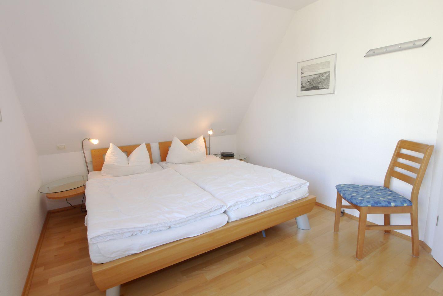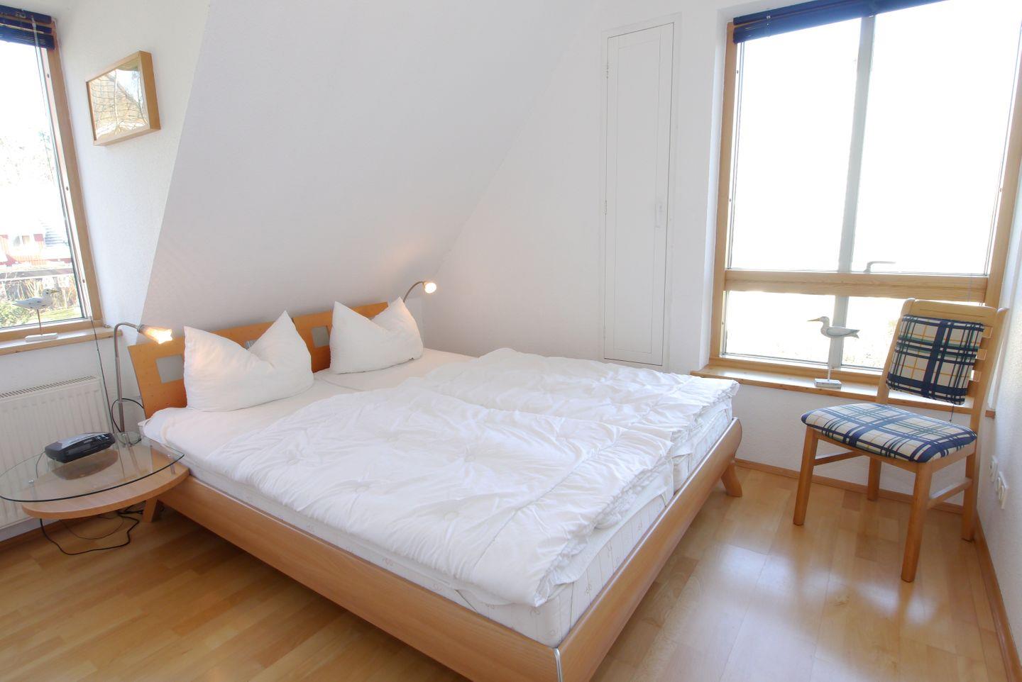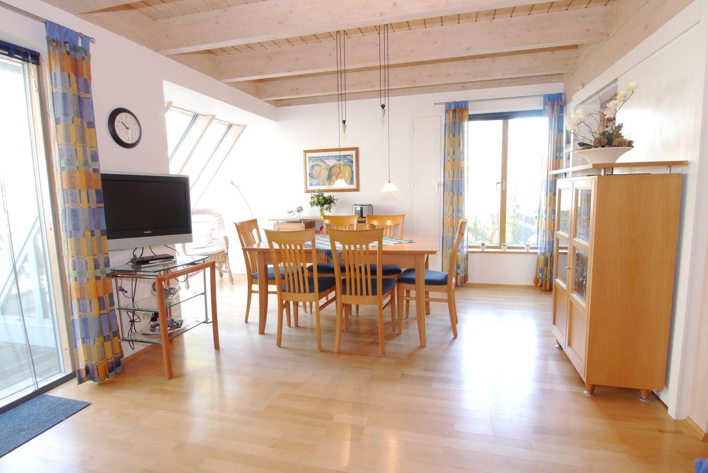 Nur wenige Minuten hinter dem Ostseedeich liegt diese schöne Haushälfte. Das Haus wird für max. 6 Personen vermietet. Unten sind das Wohnzimmer mit Essbereich und Zugang zur Westterrasse, die separate Küche und ein Bad mit Dusche und WC. Oben befinden sich drei Schlafzimmer mit jeweils einem Ehebett und ein weiteres Bad mit Dusche und WC. Vorhanden sind auch eine Sauna sowie eine Waschmaschine mit Trockner.