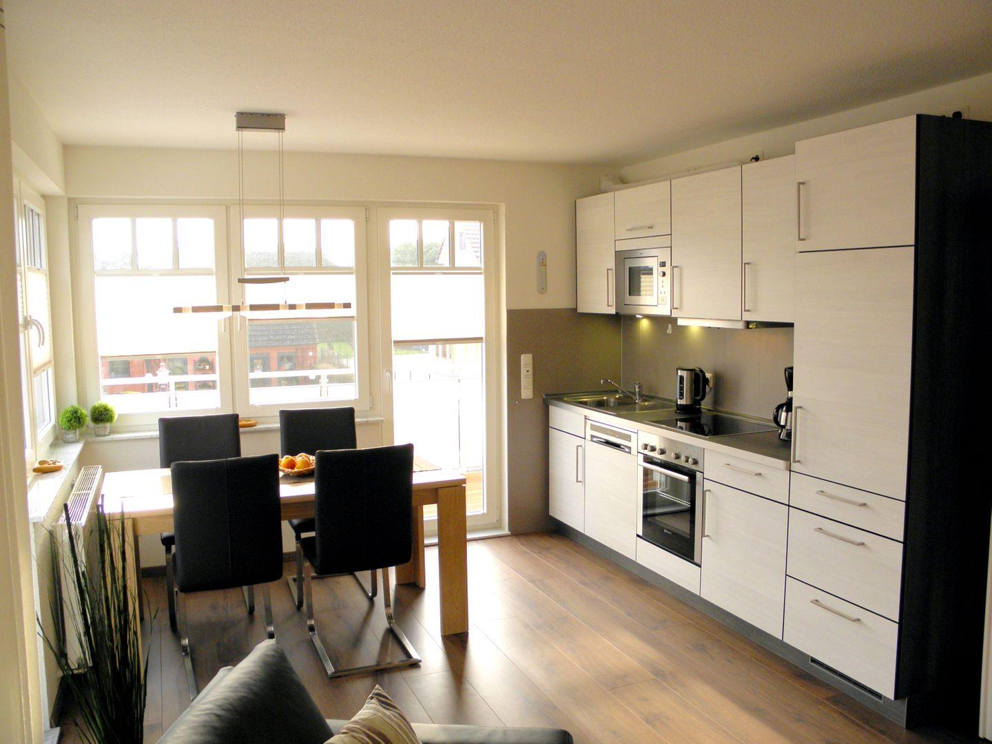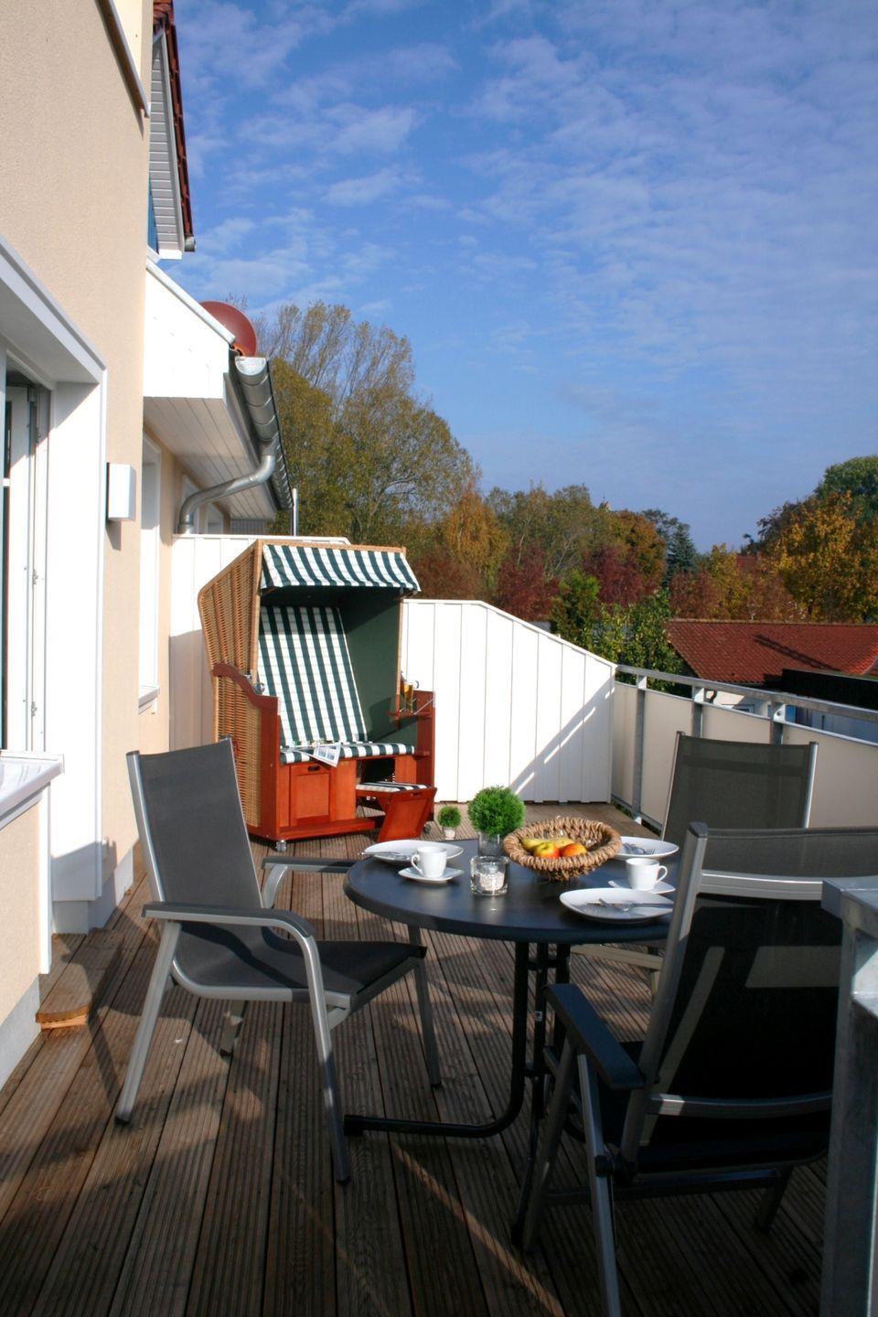 Die 49 m² große Wohnung liegt in der 1. Etage und kann mit maximal 2 Personen angemietet werden. Der Aufenthaltsbereich ist aufgeteilt in die integrierte Küche mit Essecke und Wohnbereich, von hier gelangen Sie auch auf den 30m² großen Süd-Ostbalkon mit Strandkorb. Im Schlafzimmer befindet sich ein Doppelbett und ein 2. TV-Gerät. Das Badezimmer ist mit Dusche und WC ausgestattet. Fliegengitter an den Fenstern runden die Ausstattung ab. Ein Fahrradraum steht für Ihre Fahrräder zur Verfügung. Ihr PKW parkt im eigenen Carport.