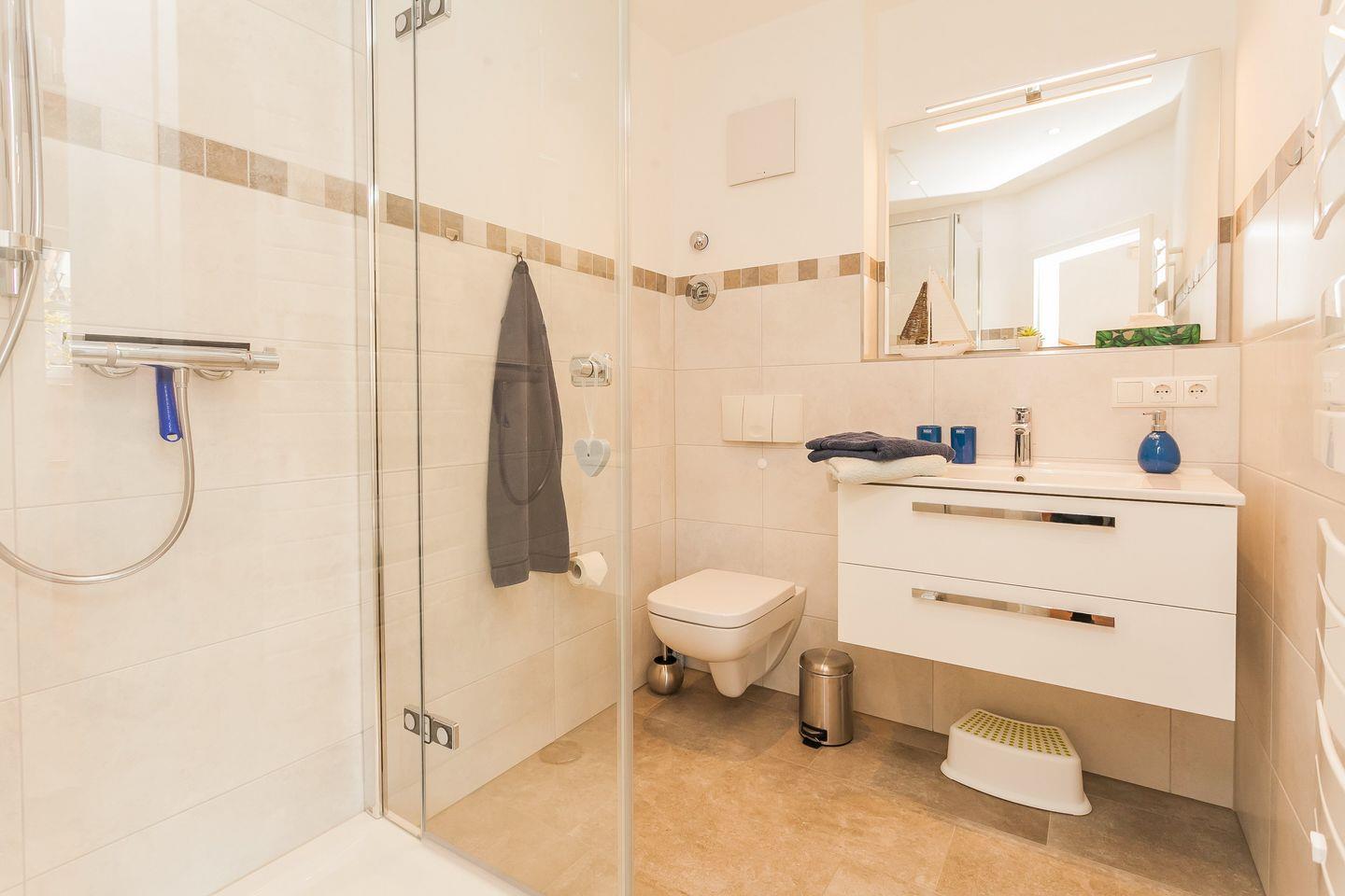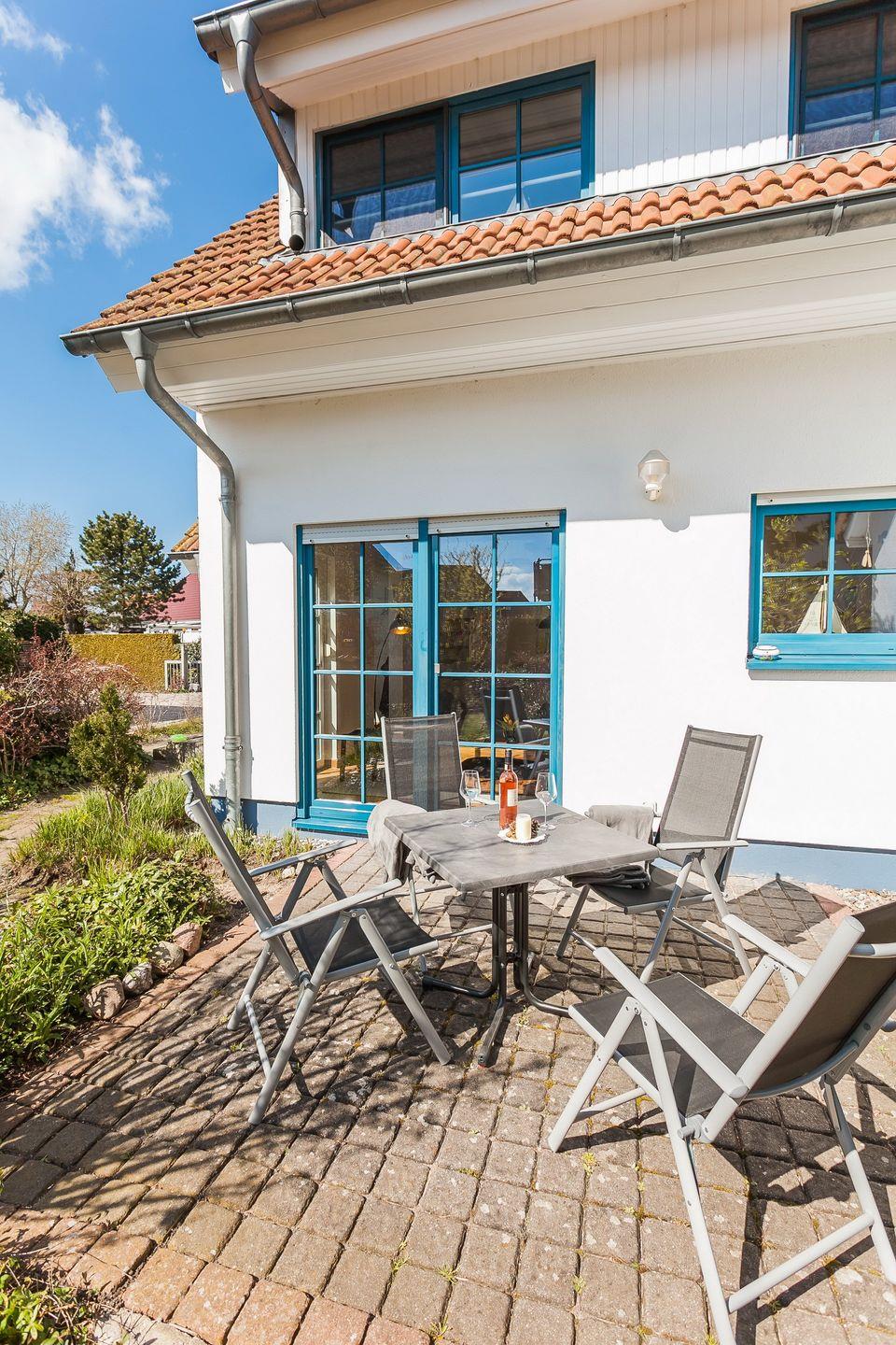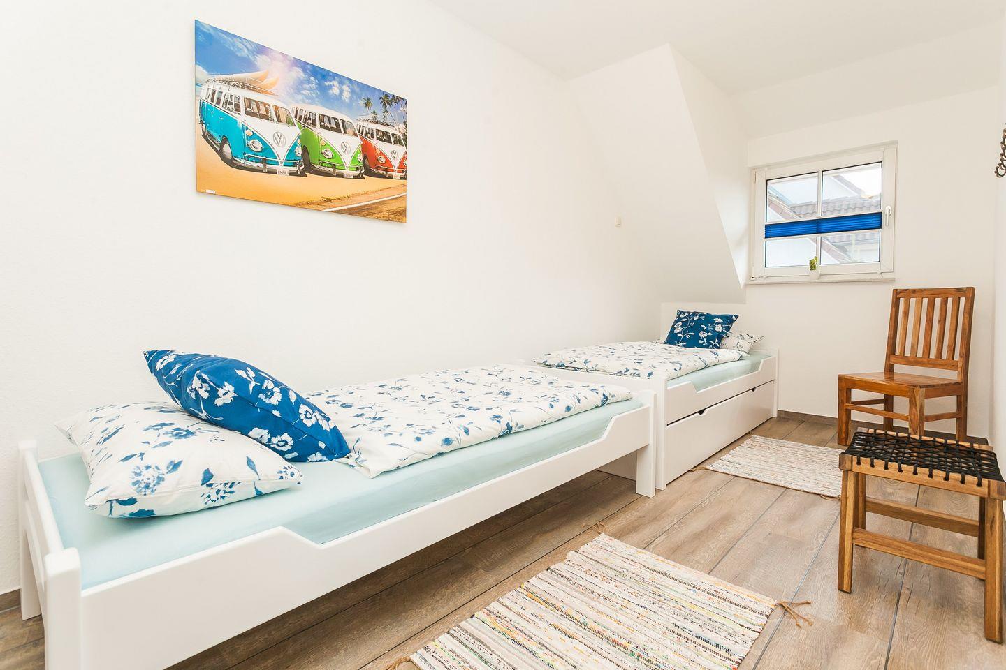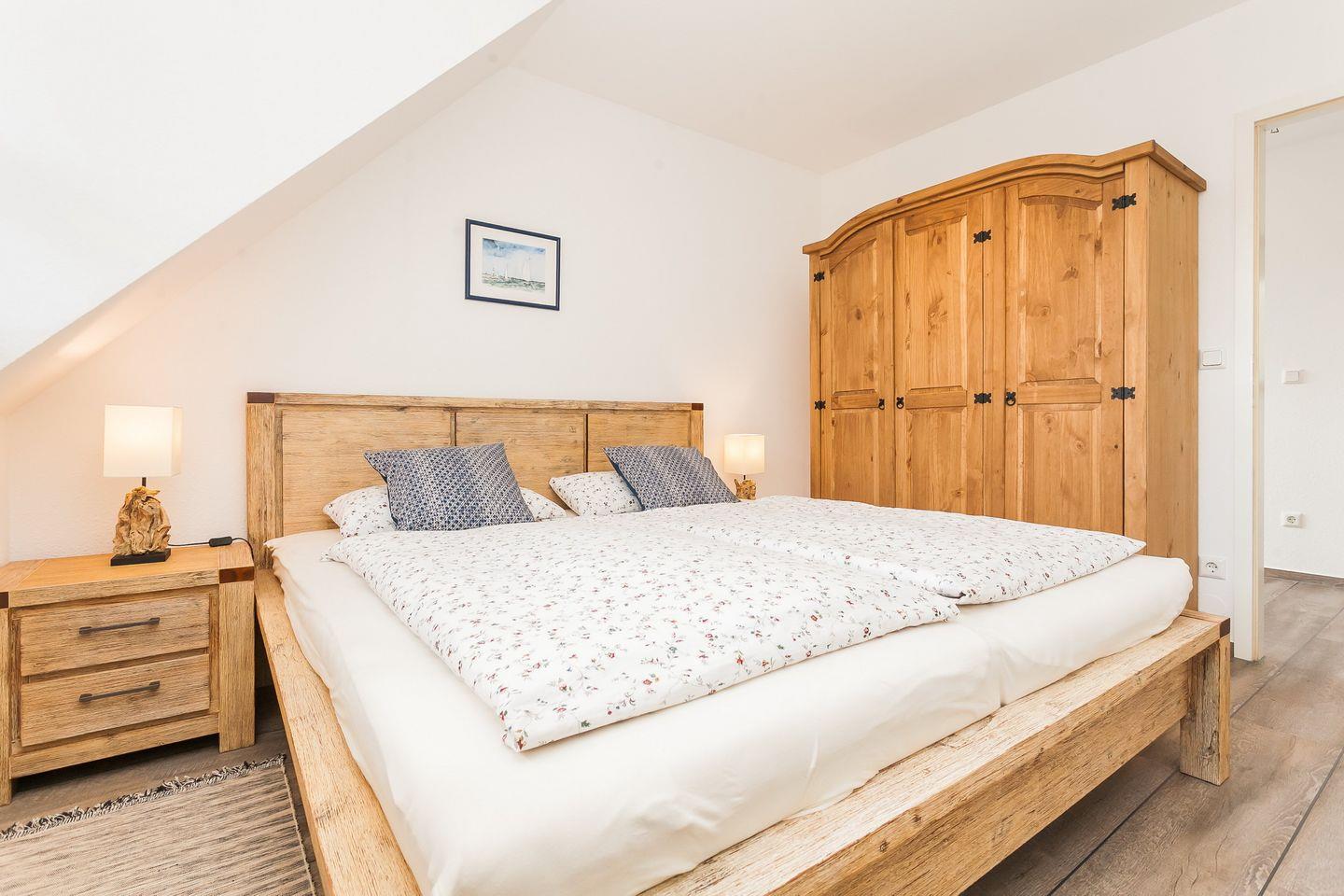 Die helle, 60 qm große Wohnung erstreckt sich auf Erdgeschoss und 1. Obergeschoss. Max. 2 Erwachsene und 2 Kinder können hier erholsame Urlaubstage verbringen. Über den Eingangsbereich mit Garderobe gelangen Sie in den gemütlichen Wohnbereich mit Essecke und dem Zugang zur Süd-Westterrasse, der durch eine Glastür getrennt ist. Die moderne und vollausgestattete Küche schließt sich an den Wohnbereich an. Eines der beiden Schlafzimmer im Obergeschoss ist mit einem Doppelbett, ein weiteres Schlafzimmer mit zwei Einzelbetten ausgestattet. Im Badezimmer finden Sie eine Glasdusche und WC. Einen Stellplatz für Ihren Pkw finden Sie direkt am Haus. Bis zum Strand sind es ca. 7 Minuten Fußweg.