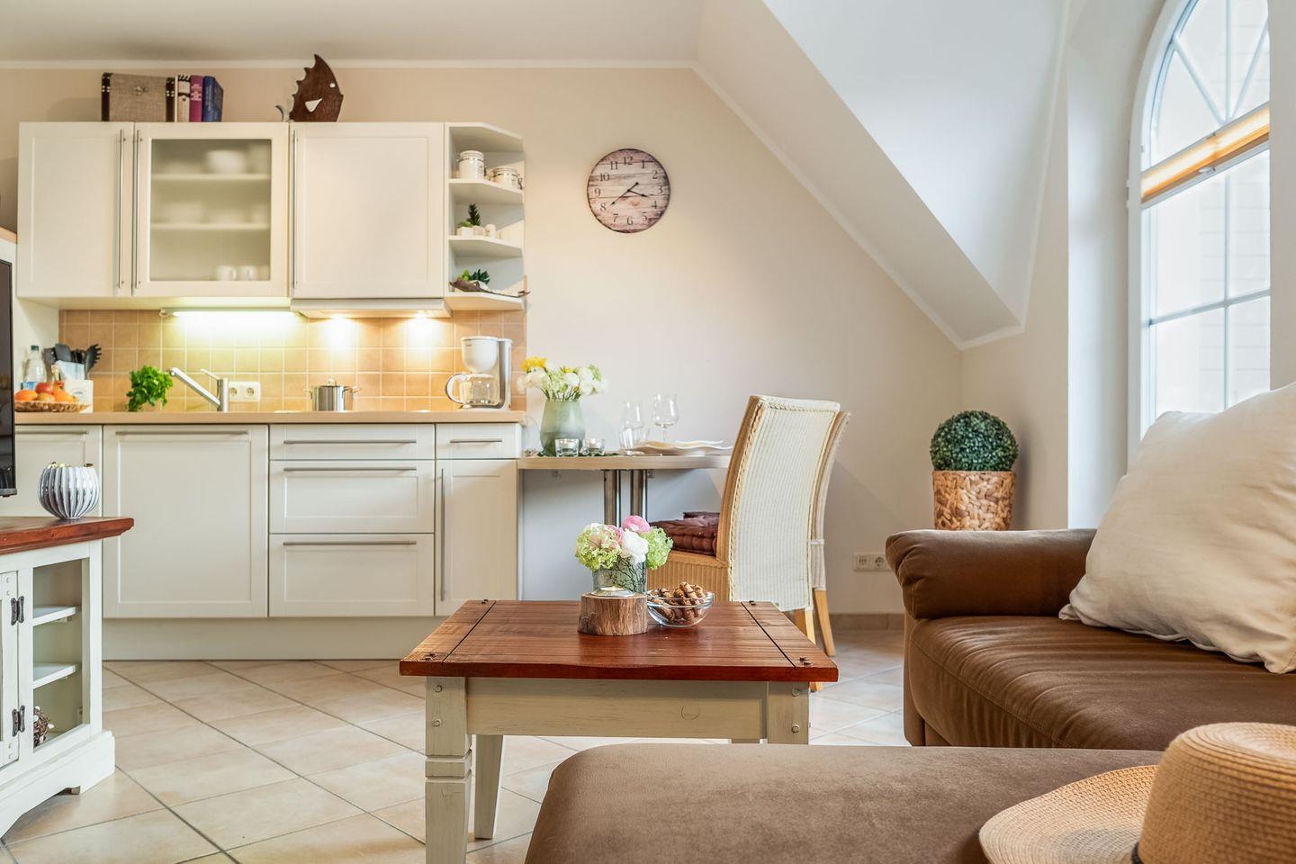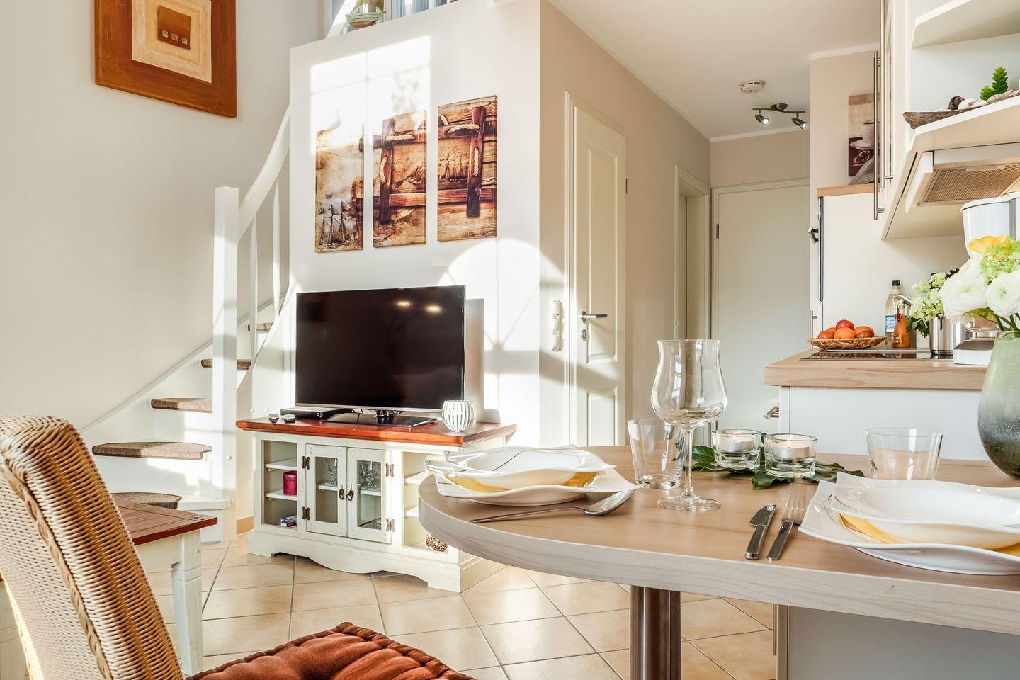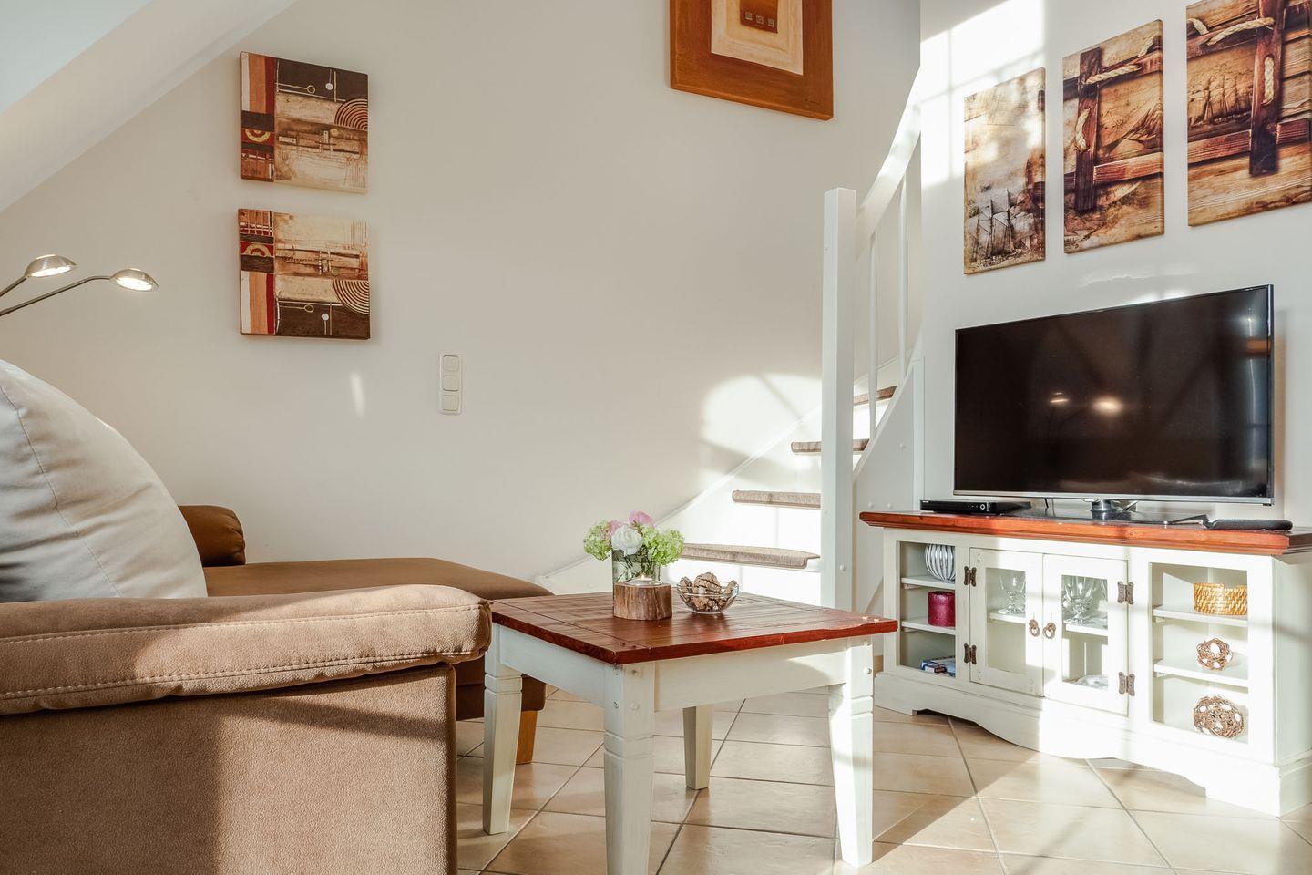 Die 35 qm große Maisonettwohnung liegt nur wenige 100 m vom Strand entfernt. Einkaufsmöglichkeiten und das Zentrum erreichen Sie in ca. 5-10 Minuten zu Fuß. Die Obergeschosswohnung wird für max. 2 Personen vermietet und ist mit einem Wohnessbereich mit Zugang zum Süd-Westbalkon sowie einer Küchenzeile ausgestattet. Das Schlafzimmer mit Ehebett befindet sich im 2. OG. Im Haus sind eine Gemeinschaftssauna sowie eine Münzwaschmaschine und ein Fahrradschuppen für alle Mieter vorhanden.