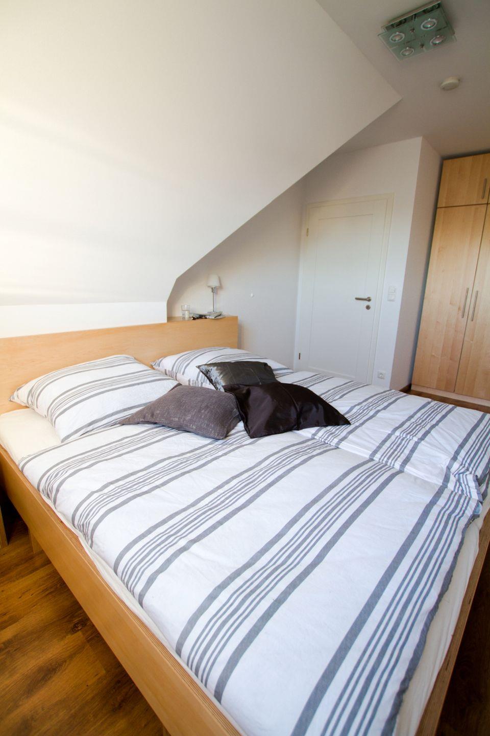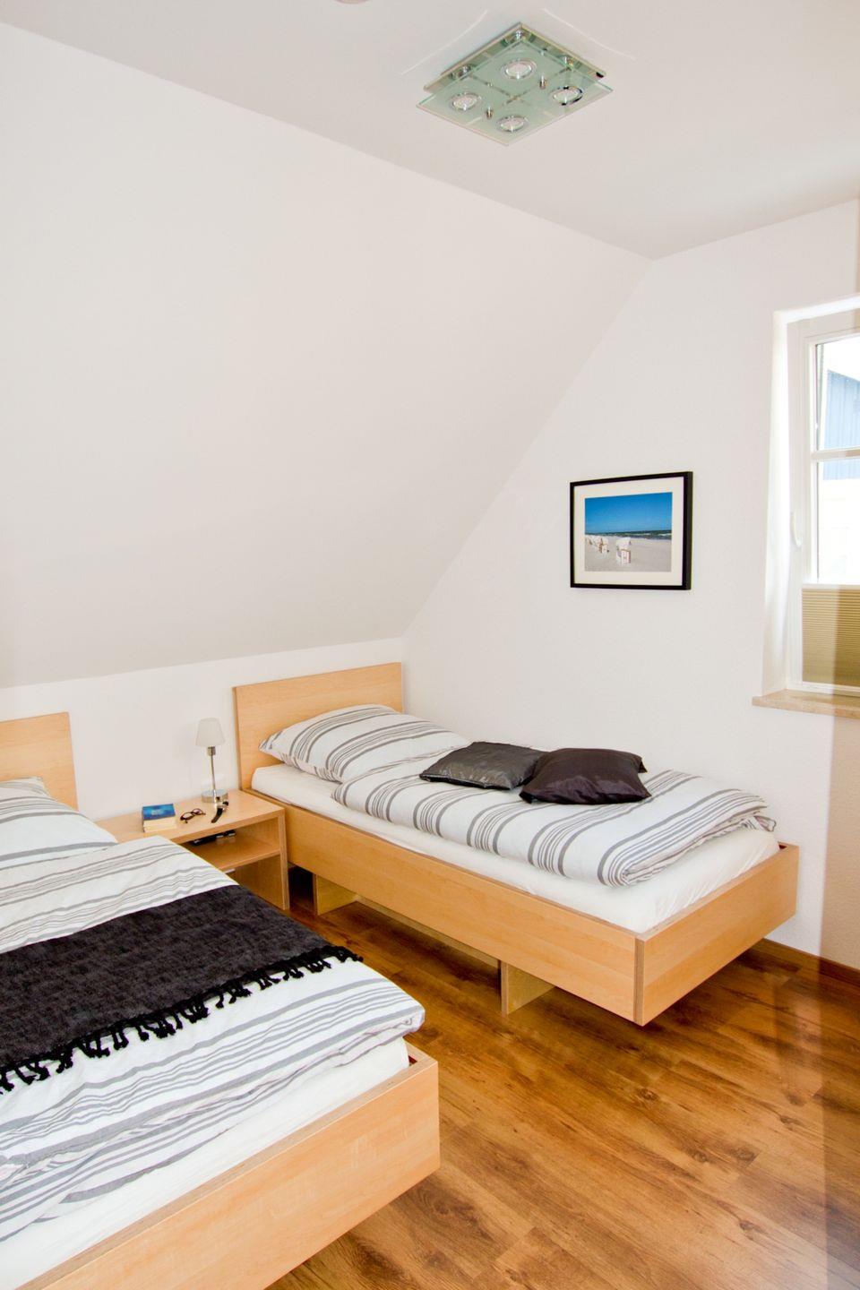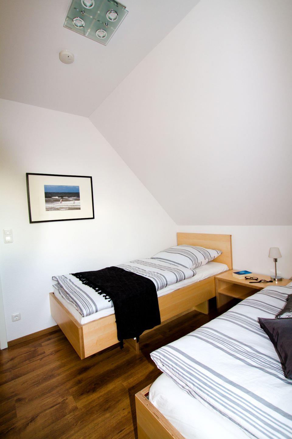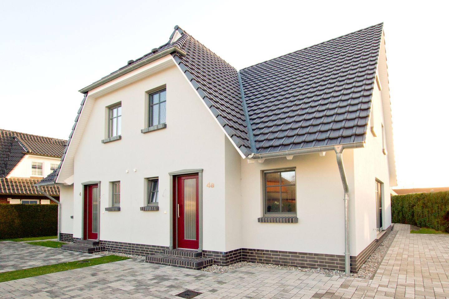 Diese 117 qm große Doppelhaushälfte kann mit maximal 6 Erwachsenen und 2 Kindern angemietet werden. Im Erdgeschoss sind das große Wohnzimmer mit Kaminofen und Zugang zur Südterrasse, die integrierte Küche mit Essbereich und ein Badezimmer mit Dusche zu finden. In der 1. Etage sind drei Schlafzimmer, zwei mit Doppelbett und das dritte mit zwei Einzelbetten, sowie ein weiteres Badezimmer mit Dusche und Münzsauna untergebracht. Auf der offenen Galerie kann auf den beiden Schlafsesseln je eine Person übernachten.