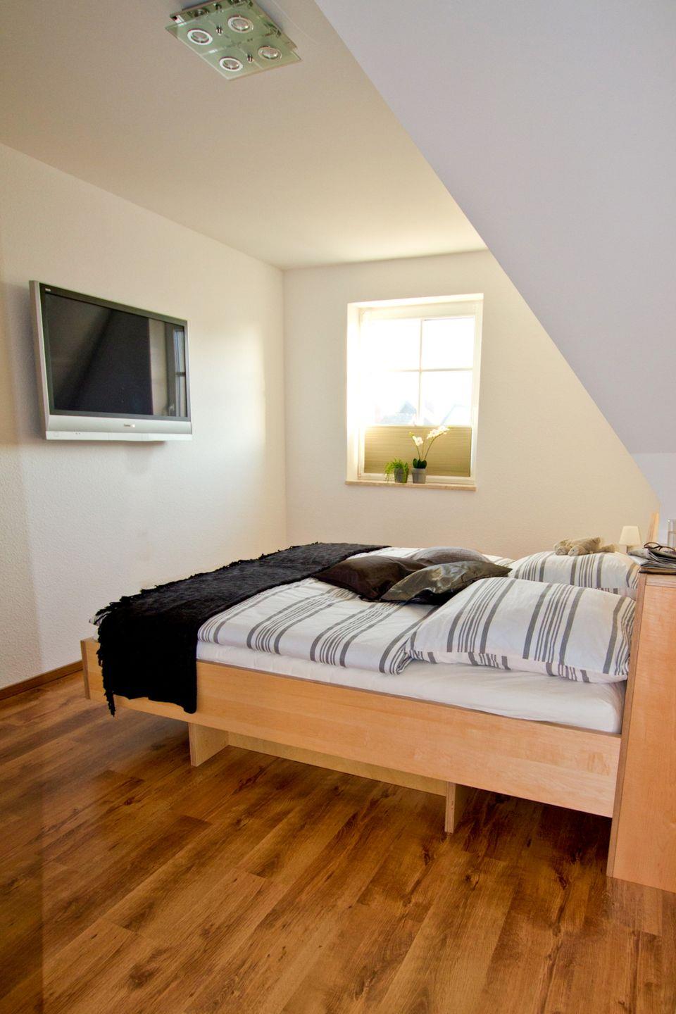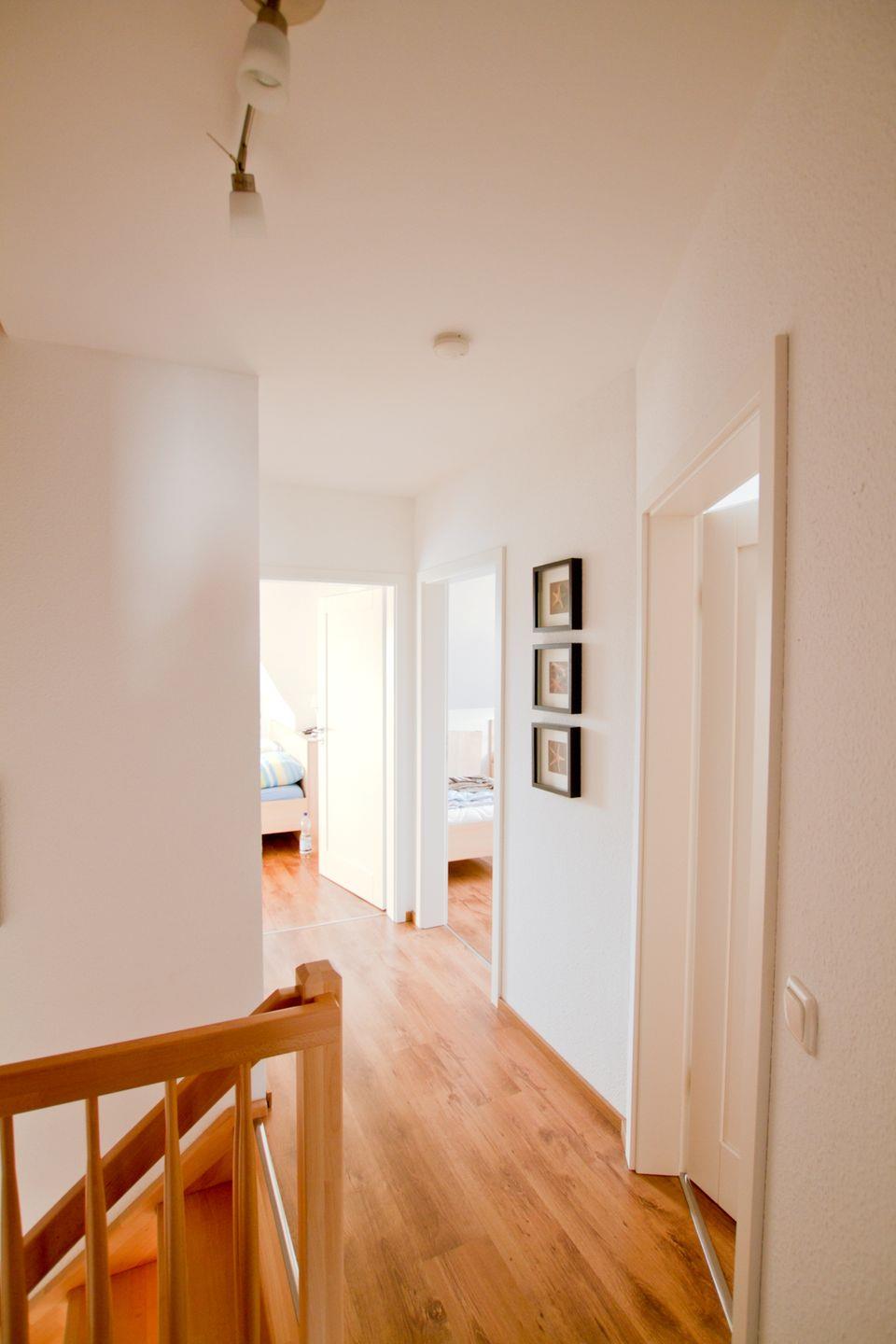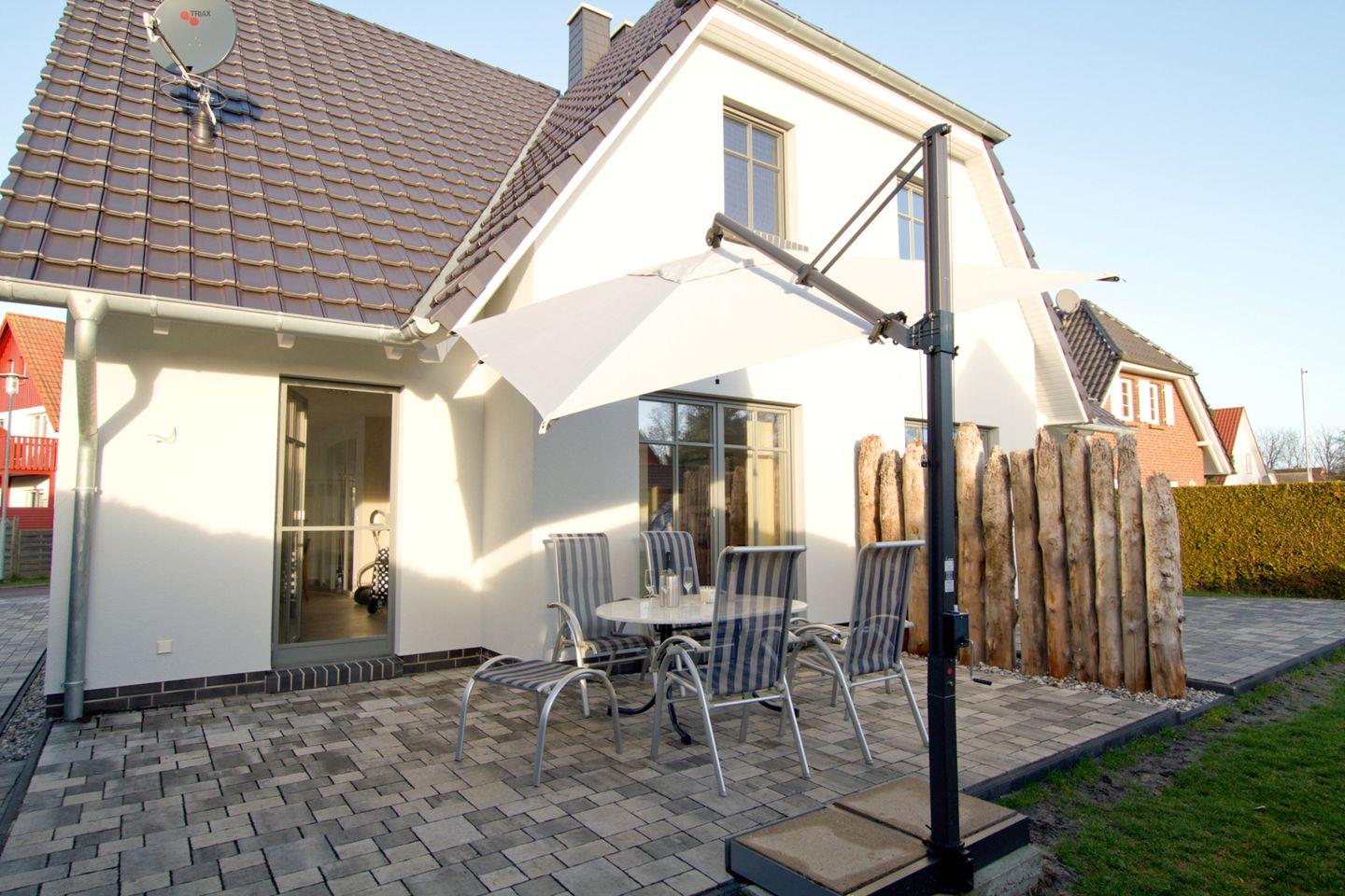 Diese 117 qm große Doppelhaushälfte kann mit maximal 6 Erwachsenen und 2 Kindern angemietet werden. Im Erdgeschoss sind das große Wohnzimmer mit Kaminofen und Zugang zur Südterrasse, die integrierte Küche mit Essbereich und ein Badezimmer mit Dusche zu finden. In der 1. Etage sind drei Schlafzimmer, zwei mit Doppelbett und das dritte mit zwei Einzelbetten, sowie ein weiteres Badezimmer mit Dusche und Münzsauna untergebracht. Auf der offenen Galerie kann auf den beiden Schlafsesseln je eine Person übernachten.