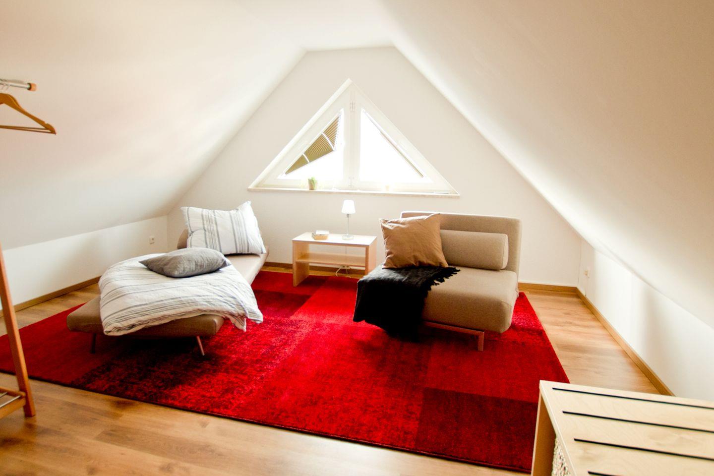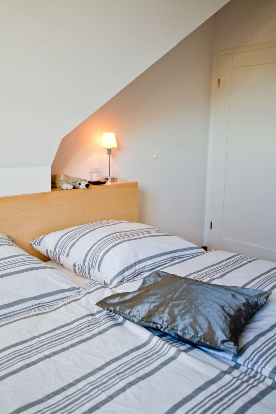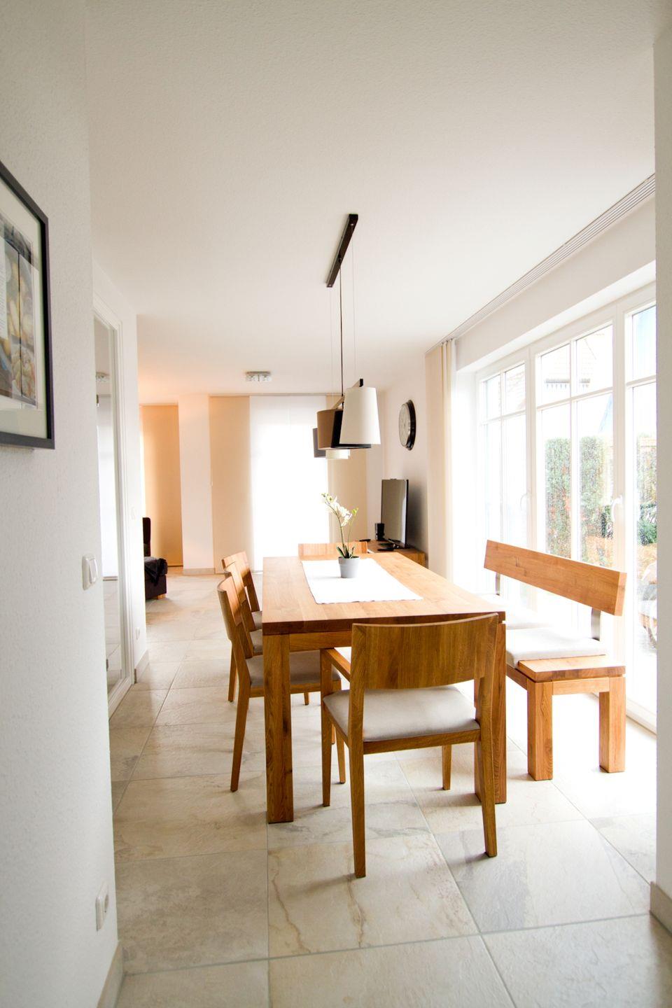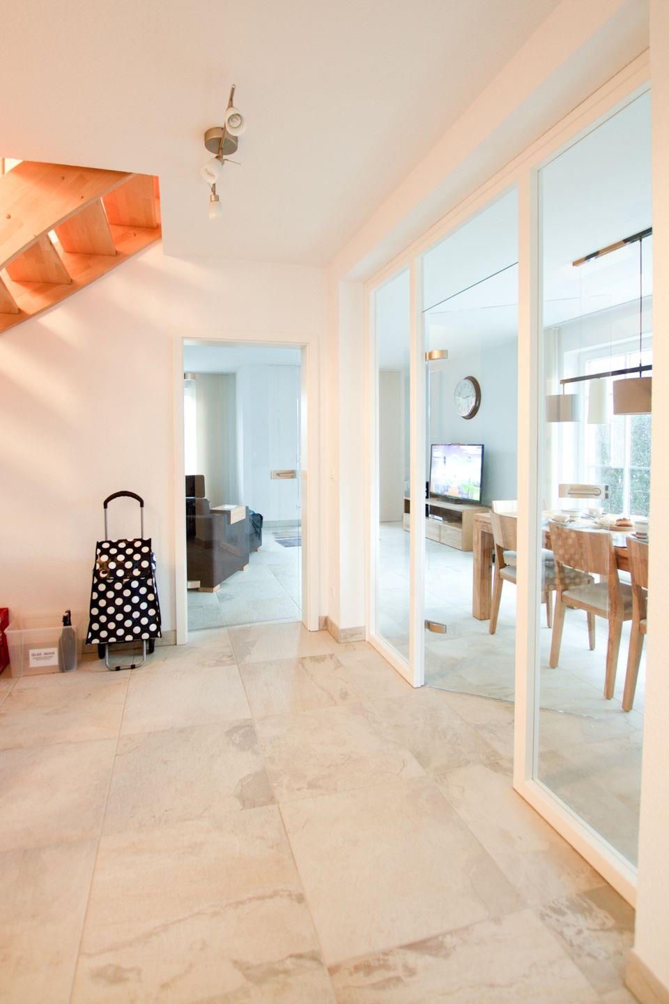 Diese 117 qm große Doppelhaushälfte kann mit maximal 6 Erwachsenen und 2 Kindern angemietet werden. Im Erdgeschoss sind das große Wohnzimmer mit Kaminofen und Zugang zur Südterrasse, die integrierte Küche mit Essbereich und ein Badezimmer mit Dusche zu finden. In der 1. Etage sind drei Schlafzimmer, zwei mit Doppelbett und das dritte mit zwei Einzelbetten, sowie ein weiteres Badezimmer mit Dusche und Münzsauna untergebracht. Auf der offenen Galerie kann auf den beiden Schlafsesseln je eine Person übernachten.