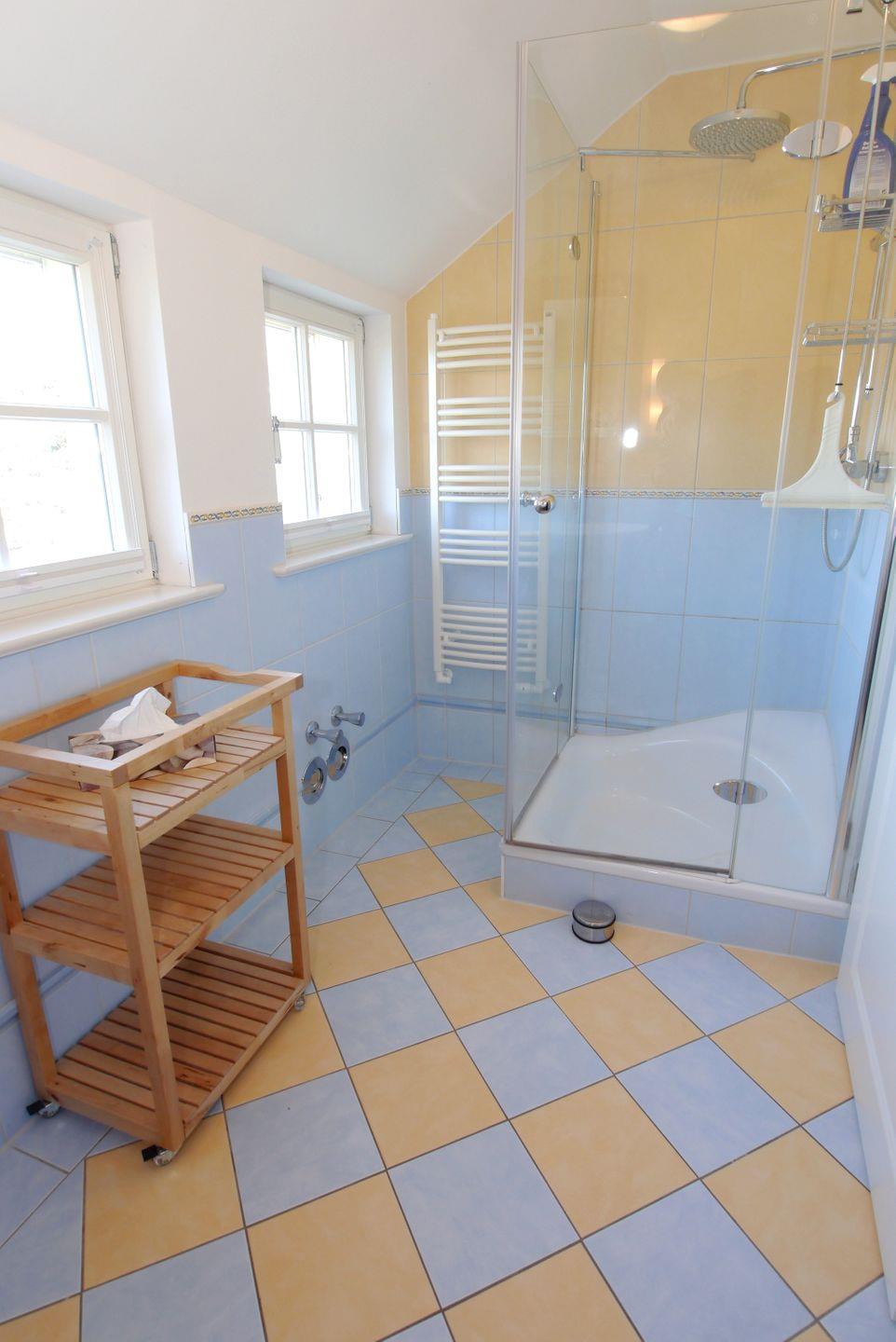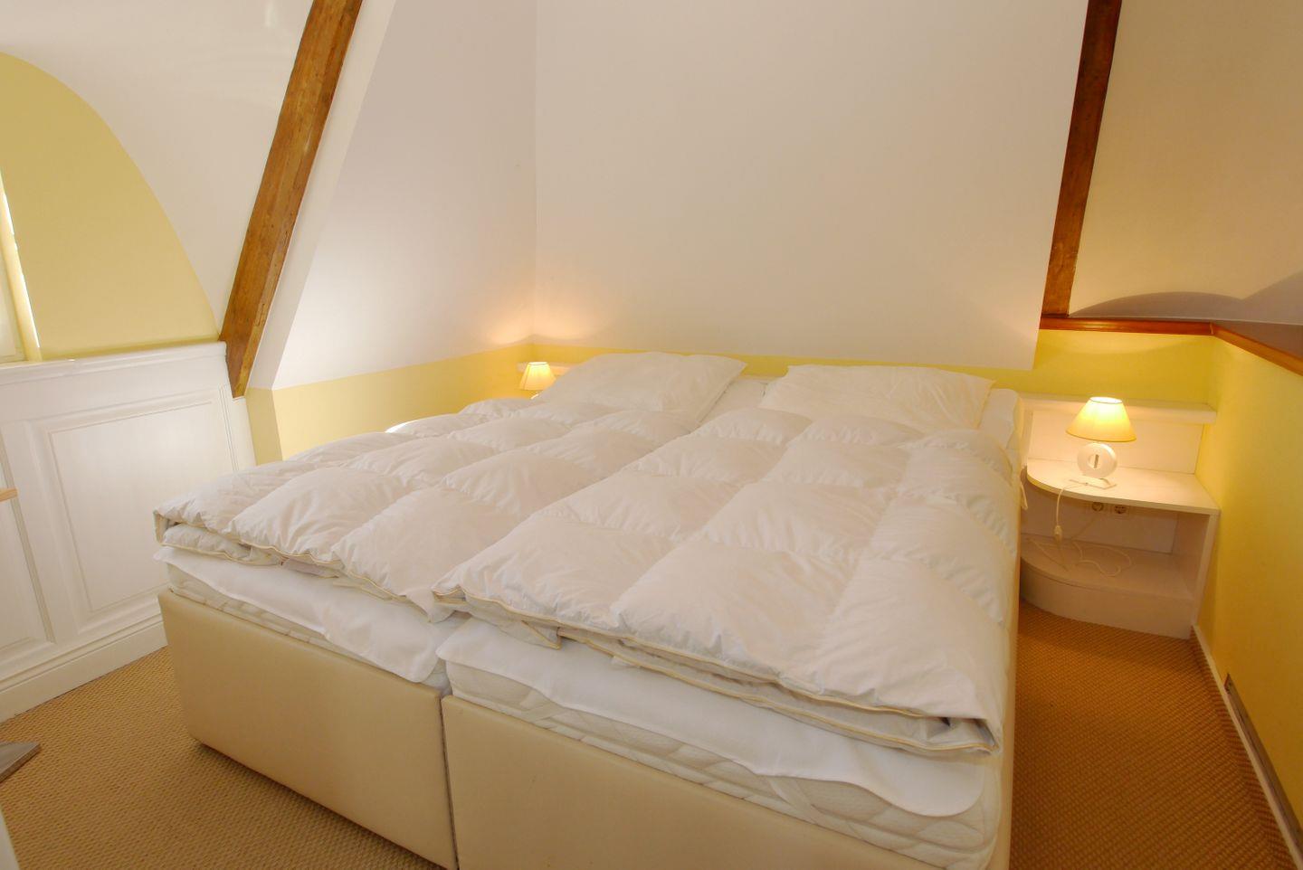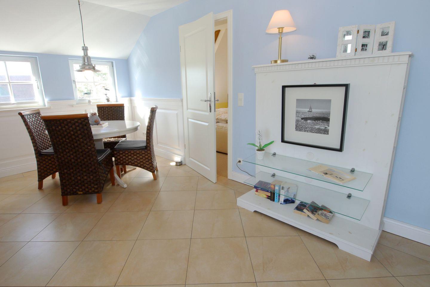 Die 55 qm große Obergeschosswohnung kann mit maximal 2 Personen belegt werden. Über den Flur gelangt man in das große Wohnzimmer mit integrierter Küchenzeile und Essecke sowie Zugang zur möblierten Dachterrasse. Das Schlafzimmer ist mit einem Doppelbett ausgestattet und das Badezimmer verfügt über eine Glasdusche und WC. Vom Wohnbereich führt eine Treppe auf die offene Galerie, hier befindet sich ein kleines Relaxzimmer mit einer Liege. Ein Fahrradschuppen und eine Waschmaschine ergänzen die Einrichtung.