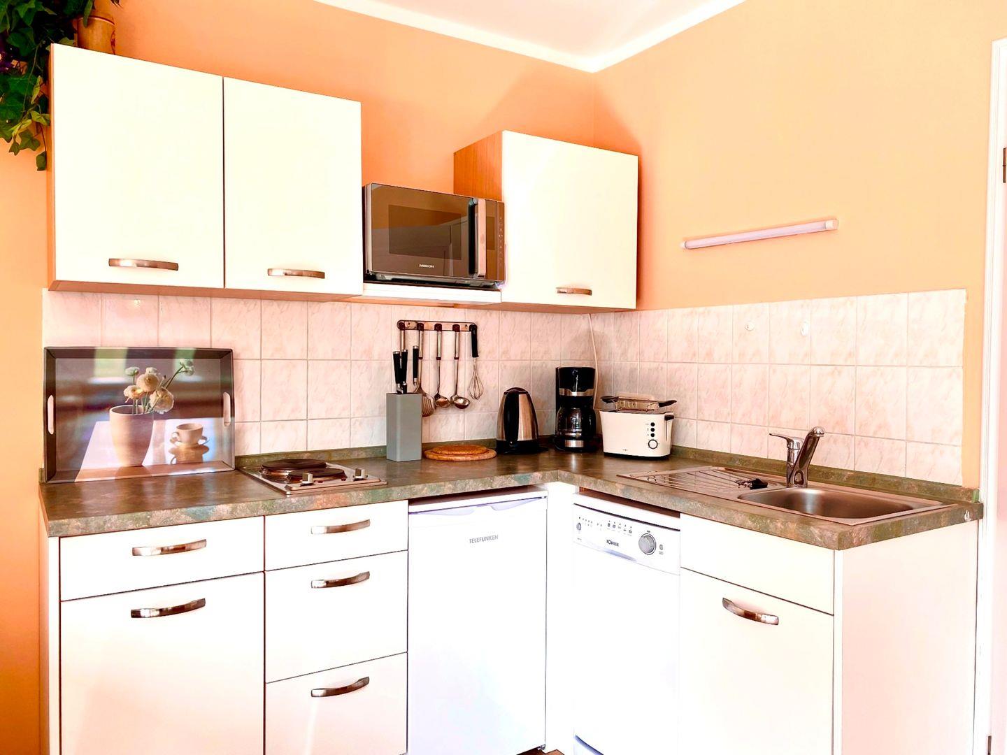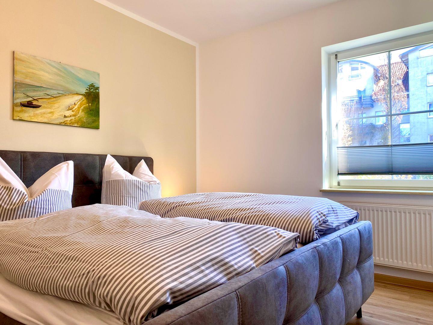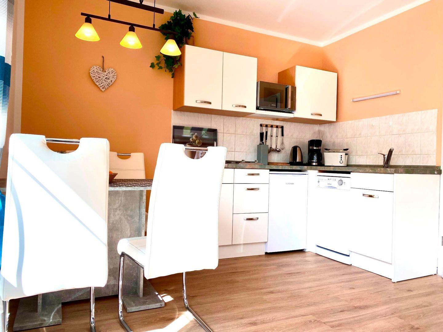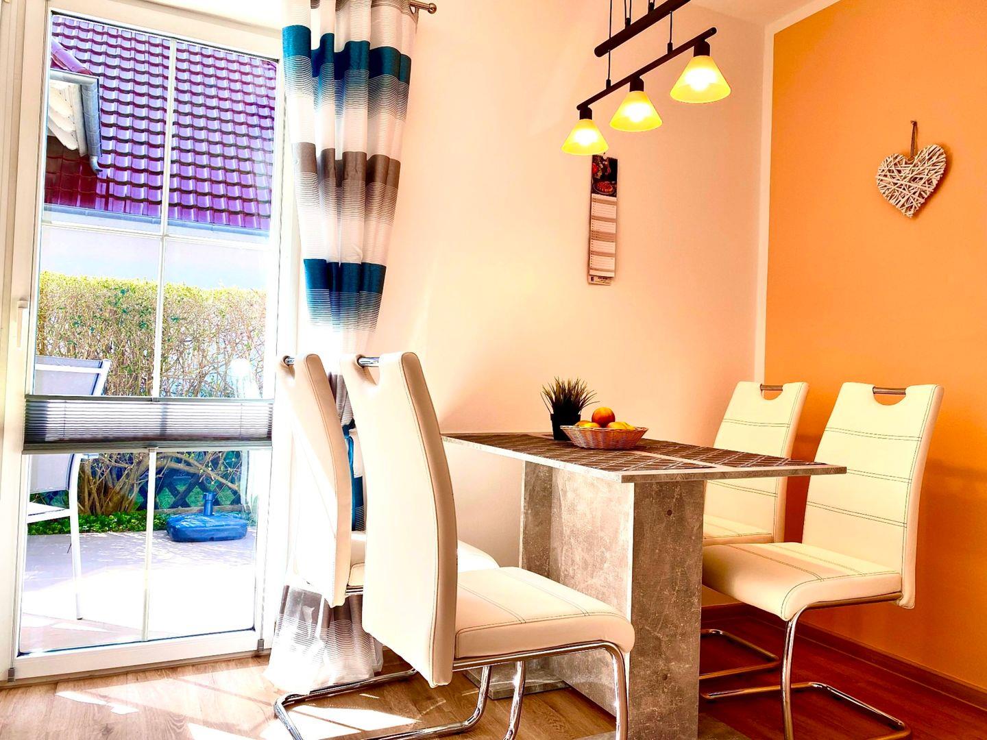 In einem schönen Garten befindet sich das Haus Windrose mit der Ferienwohnung "Nordwind". Diese ca. 45 qm große Ferienwohnung liegt im Erdgeschoss und wird für maximal zwei Erwachsene und ein Kind angeboten. Im Wohnzimmer befinden sich eine integrierte Küche und eine Essecke. Von hier gelangen Sie auf eine große Terrasse, die nach Süden ausgerichtet ist. Ihnen steht ein Schlafzimmer mit Doppelbett und eine Schlafcouch im Wohnzimmer zur Verfügung. Das Bad hat ein Fenster und ist mit einer neuen Glasdusche und WC sowie Handtuchtrockner ausgestattet. In der Ferienwohnung ist in jedem Zimmer mindestens ein Fenster mit Fliegengitter vorhanden.