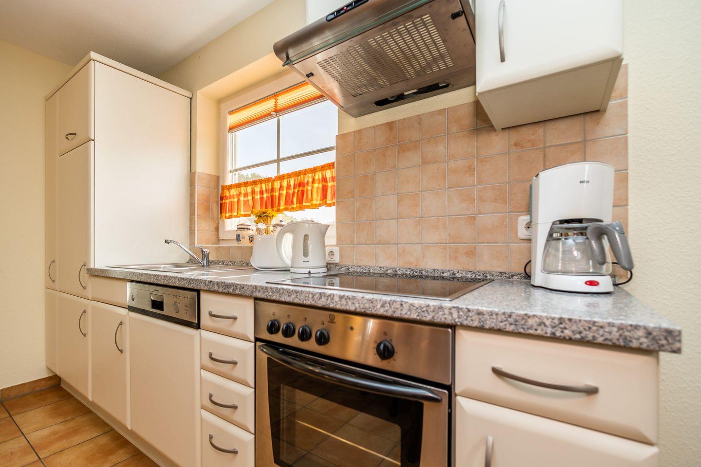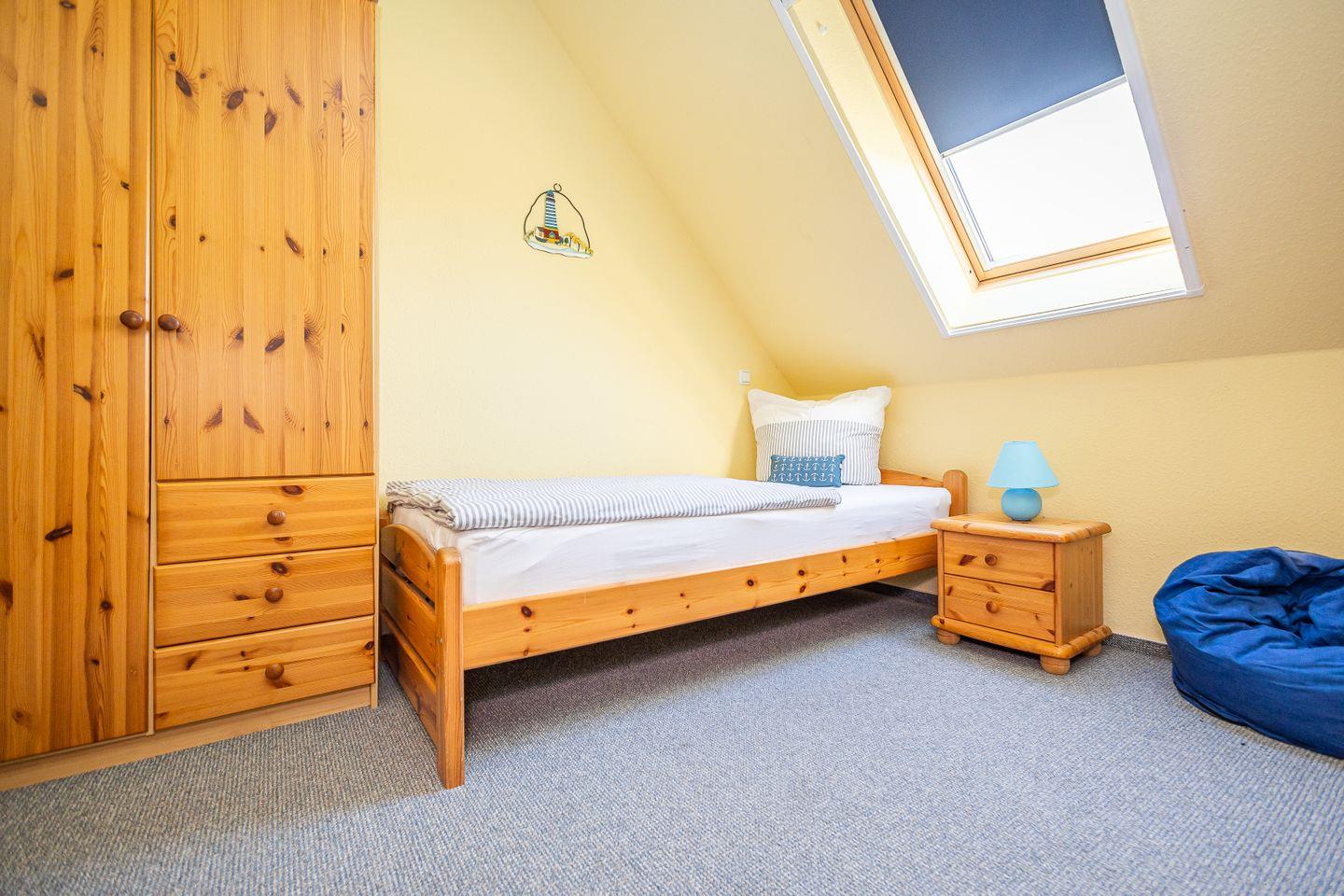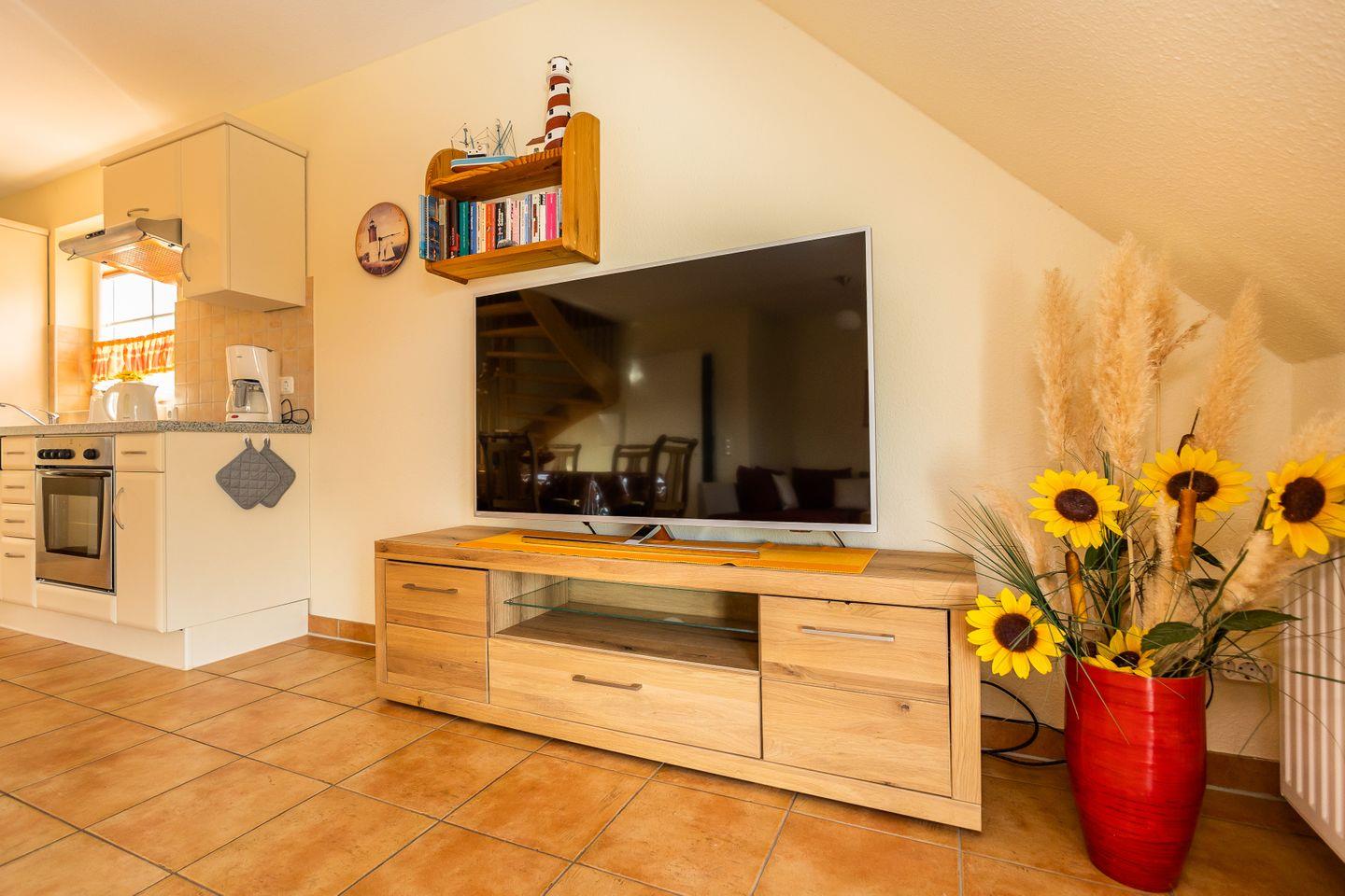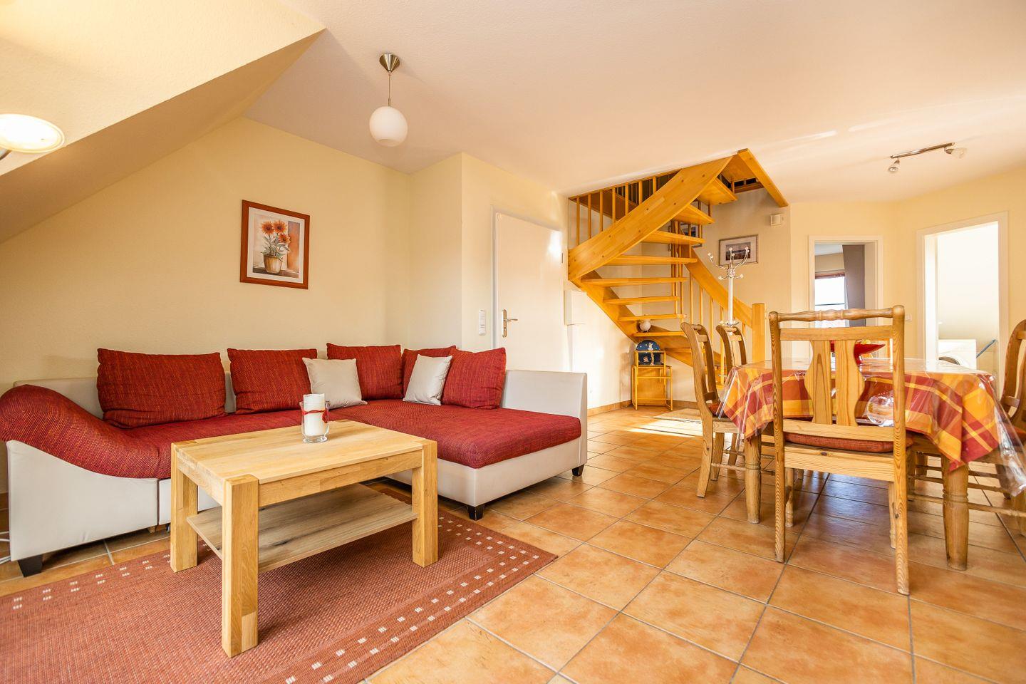 Die 60 m² große Maisonettewohnung wird für bis zu 2 Erwachsenen + 2 Kindern vermietet. Im 1. Obergeschoss befindet sich das Wohnzimmer mit integrierter Küche und Zugang zum möblierten Westbalkon. Das Schlafzimmer ist mit einem Ehebett ausgestattet und das Badezimmer mit einer Dusche. Auf der offenen Galerie gibt es noch mal zwei einzelstehende Betten sowie ein weiteres TV-Gerät. Eine Waschmaschine und ein Gemeinschaftsschuppen für Fahrräder gehören ebenfalls zur Einrichtung.