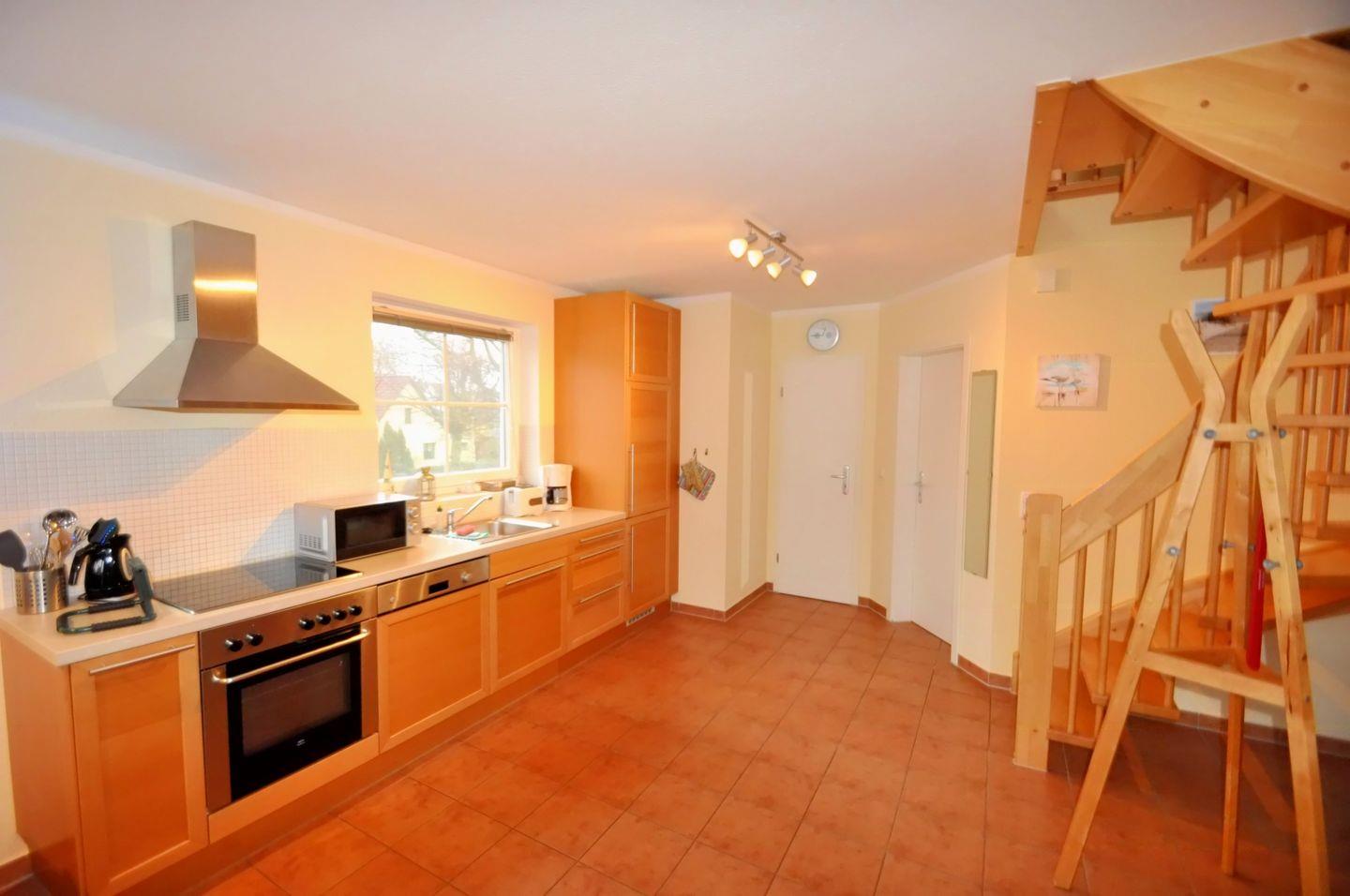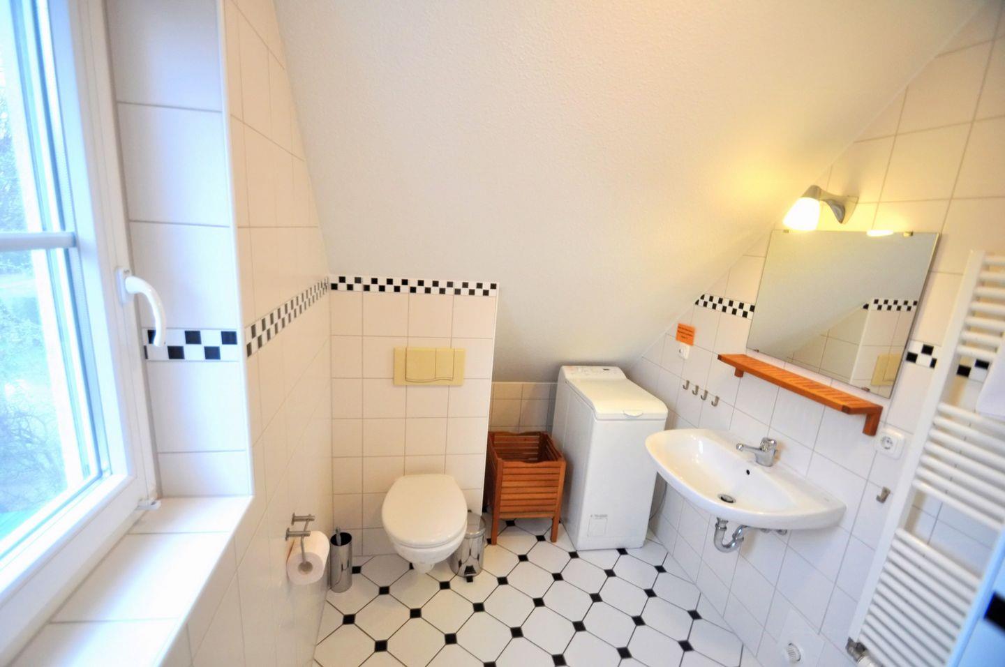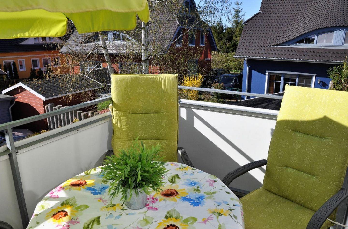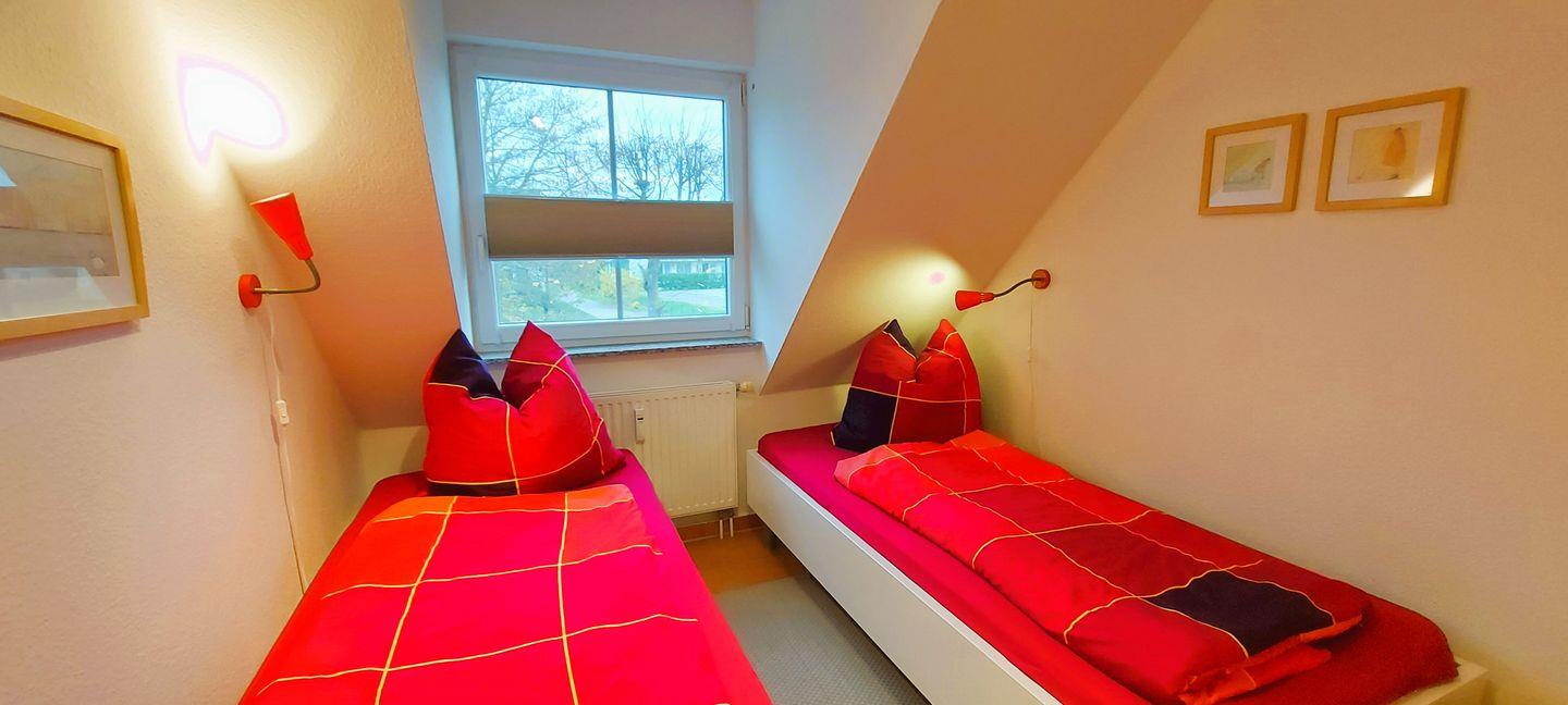 Die 60 m² große Maisonettewohnung liegt in der 1. Etage und kann mit bis zu 4 Erwachsenen belegt werden. Im Wohnzimmer sind Küche und Essbereich integriert. Von hier gelangen Sie auf den Westbalkon und können in der Abendsonne den Tag ausklingen lassen. Das kleine Schlafzimmer mit zwei einzelnen Betten und das Badezimmer mit der Dusche und der Waschmaschine sind ebenfalls auf dieser Ebene zu finden. Vom Wohnbereich führt eine Treppe ins Dachgeschoss, auf die offene Galerie mit dem Doppelbett. Ein Gemeinschaftsschuppen bietet Platz für Fahrräder. Zu dieser Wohnung gehört ebenfalls ein PKW-Stellplatz, der Platz für ein Fahrzeug bietet.