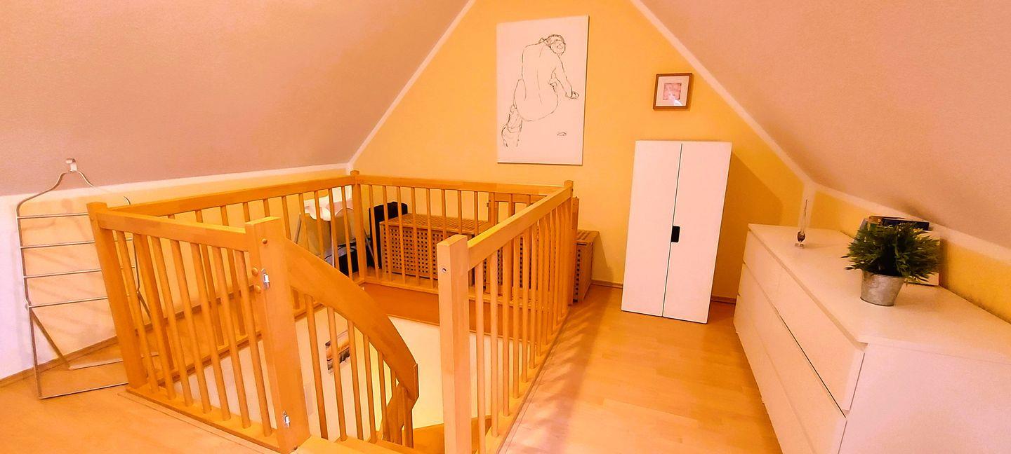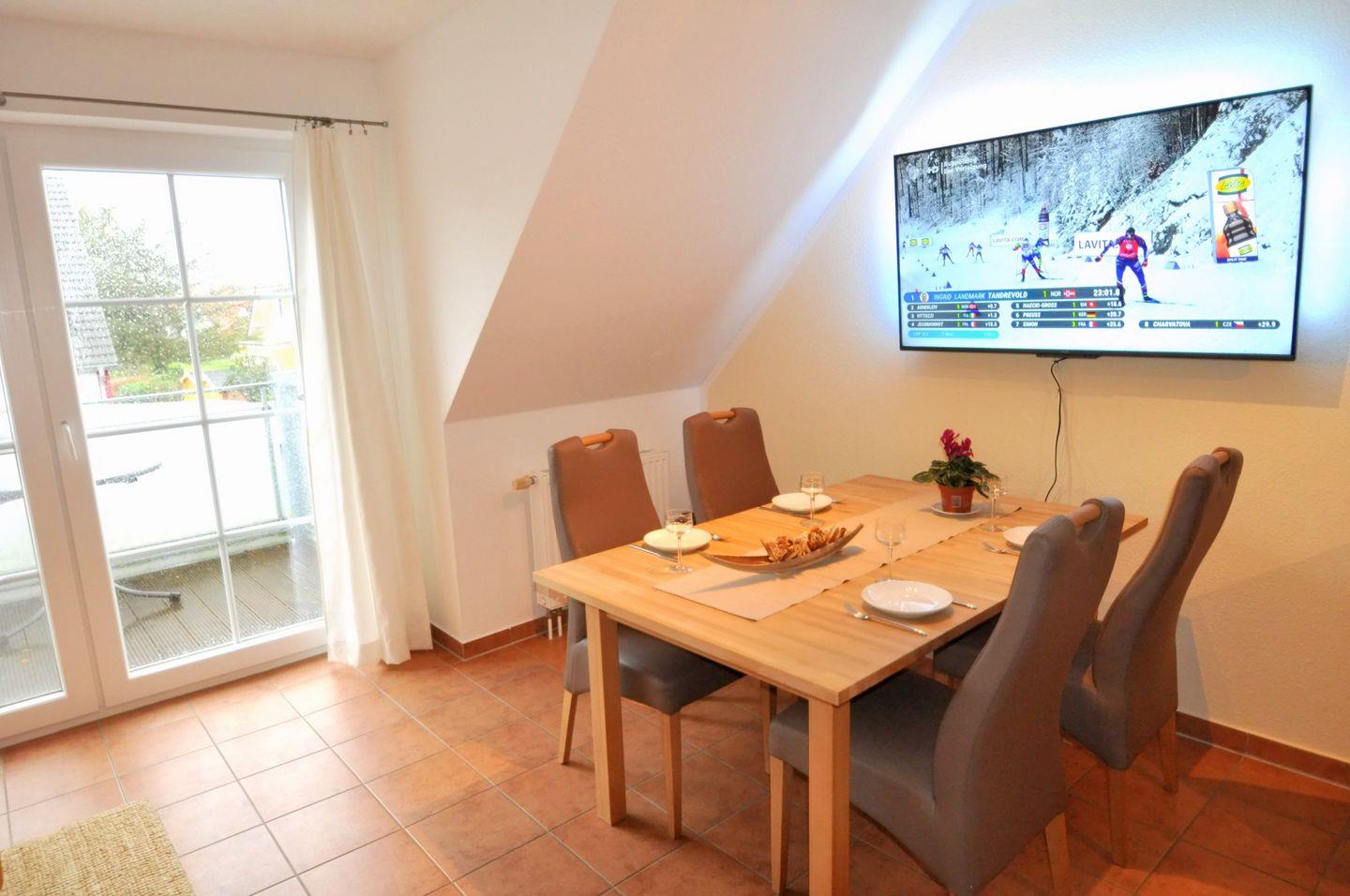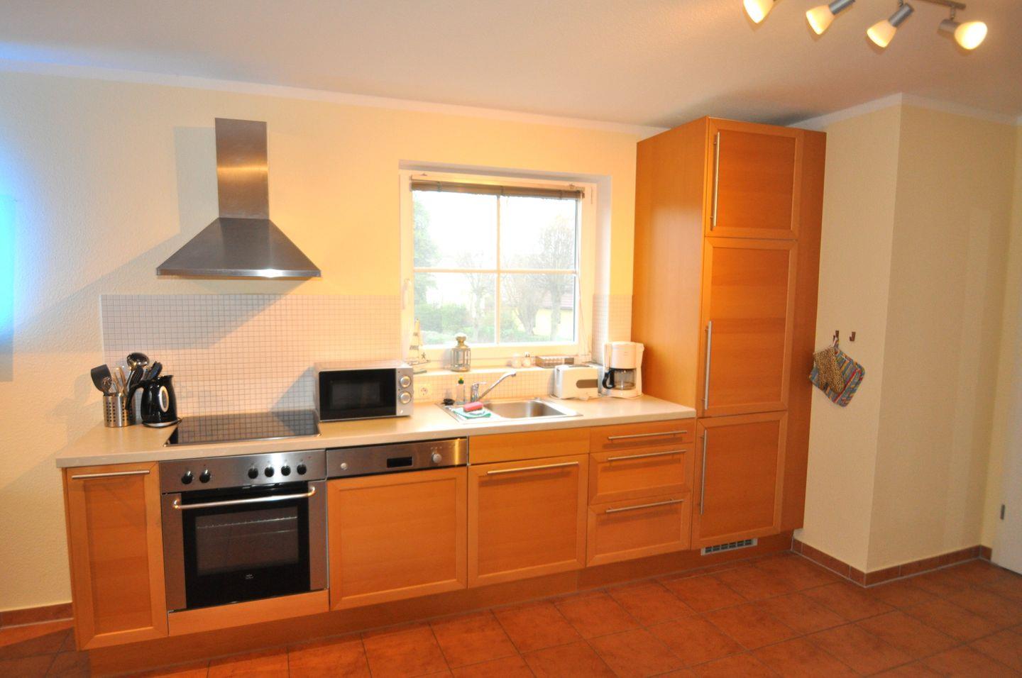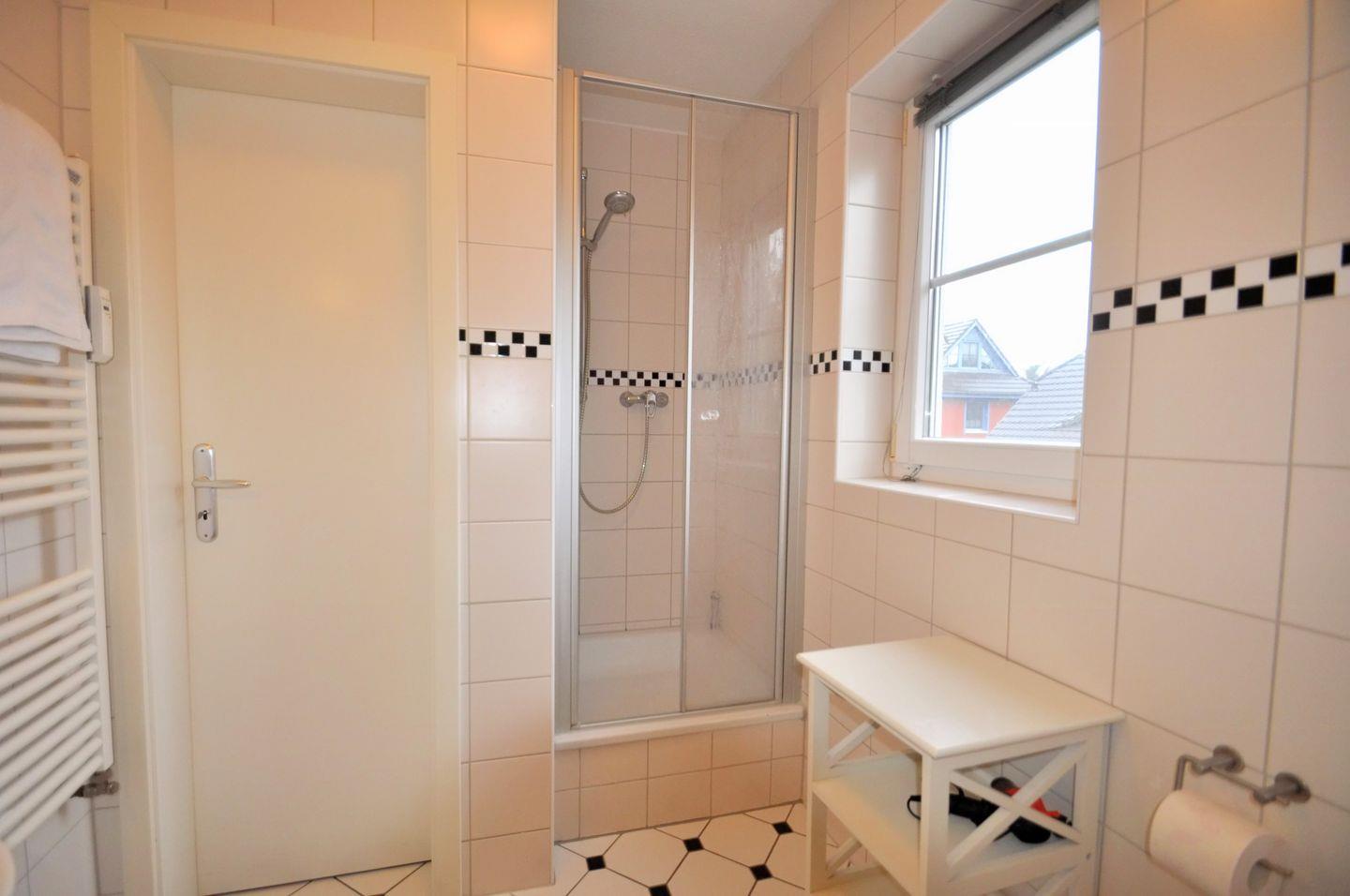 Die 60 m² große Maisonettewohnung liegt in der 1. Etage und kann mit bis zu 4 Erwachsenen belegt werden. Im Wohnzimmer sind Küche und Essbereich integriert. Von hier gelangen Sie auf den Westbalkon und können in der Abendsonne den Tag ausklingen lassen. Das kleine Schlafzimmer mit zwei einzelnen Betten und das Badezimmer mit der Dusche und der Waschmaschine sind ebenfalls auf dieser Ebene zu finden. Vom Wohnbereich führt eine Treppe ins Dachgeschoss, auf die offene Galerie mit dem Doppelbett. Ein Gemeinschaftsschuppen bietet Platz für Fahrräder. Zu dieser Wohnung gehört ebenfalls ein PKW-Stellplatz, der Platz für ein Fahrzeug bietet.
