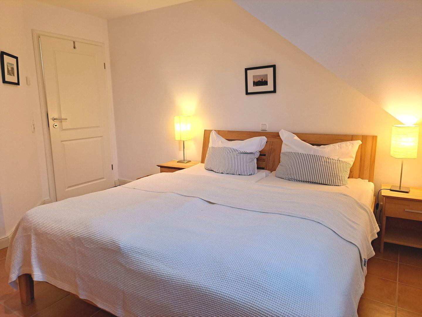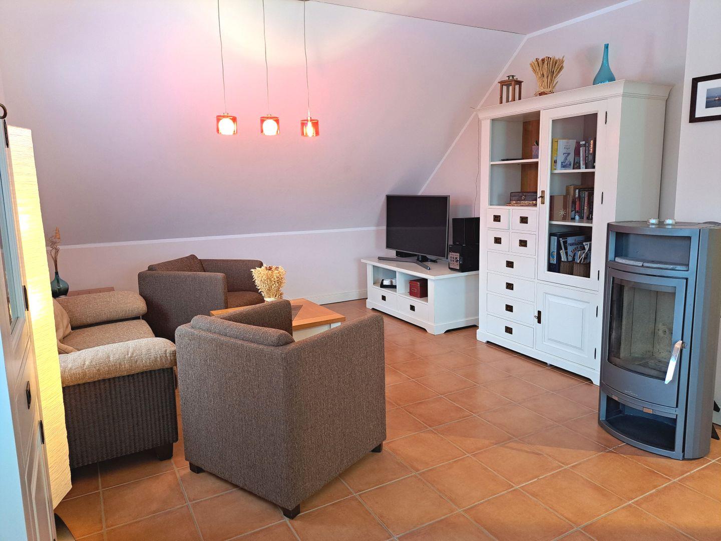 Die 85 m² große Maisonettewohnung befindet sich im 1. OG und wird für bis zu 4 Erwachsene vermietet. Der große Wohnraum mit Kaminofen schliesst auch die Essecke und die hochwertig ausgestattete Küche ein, der Zugang zum Balkon erfolgt ebenfalls von hier. Im unteren Bereich der Wohnung finden Sie ein Schlafzimmer mit einem Doppelbett sowie ein großzügiges Bad mit Dusche und WC. Über eine Holztreppe gelangen Sie in die obere Etage. Hier stehen Ihnen dann ein weiteres Schlafzimmer mit Doppelbett und ein Gäste-WC zur Verfügung.