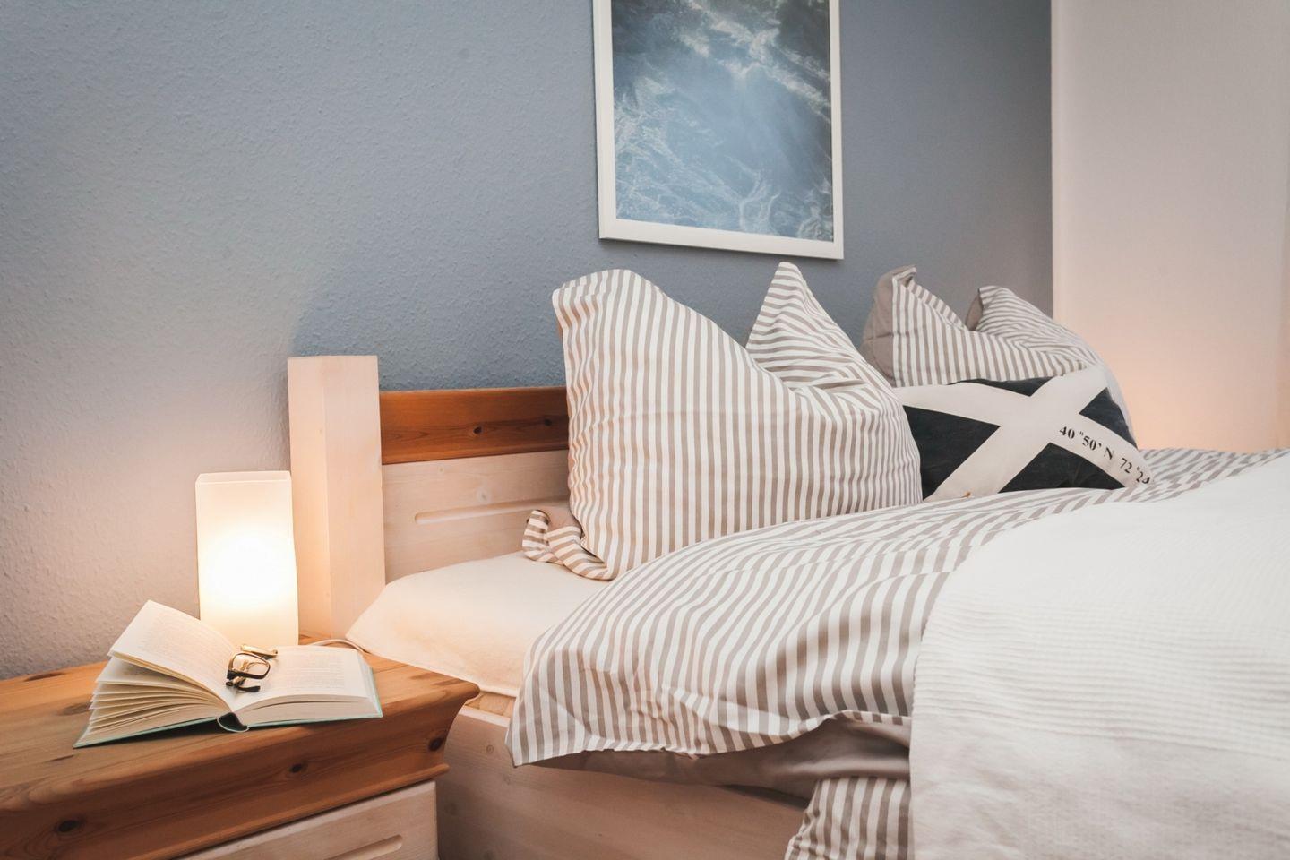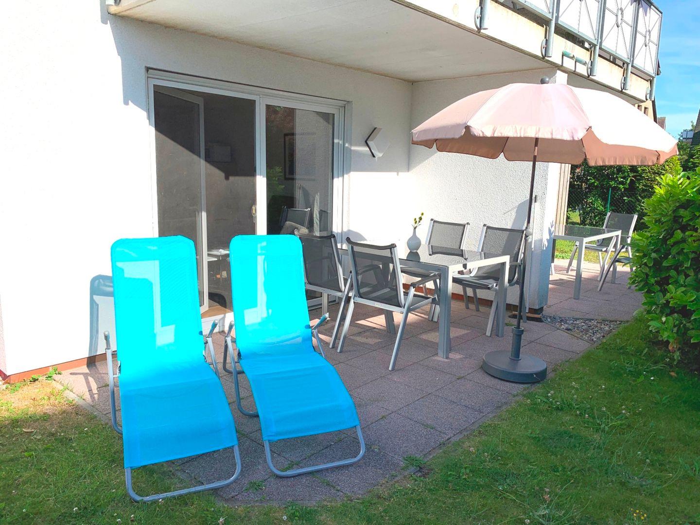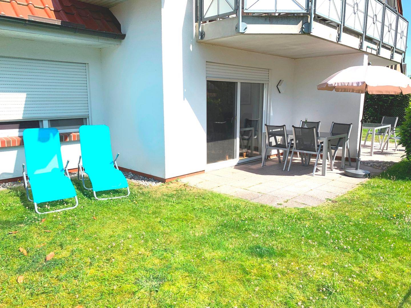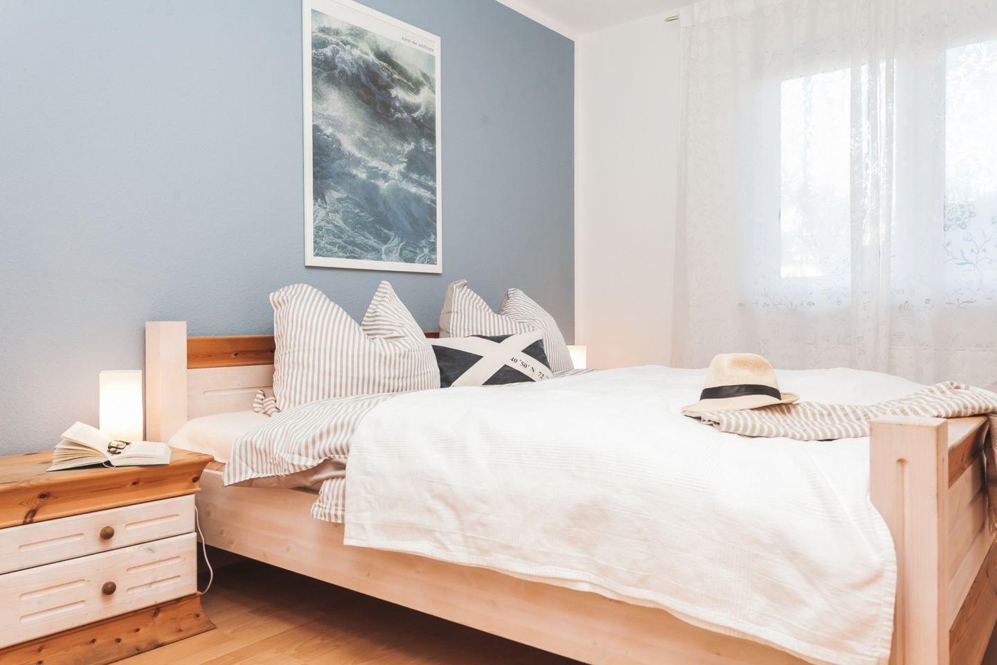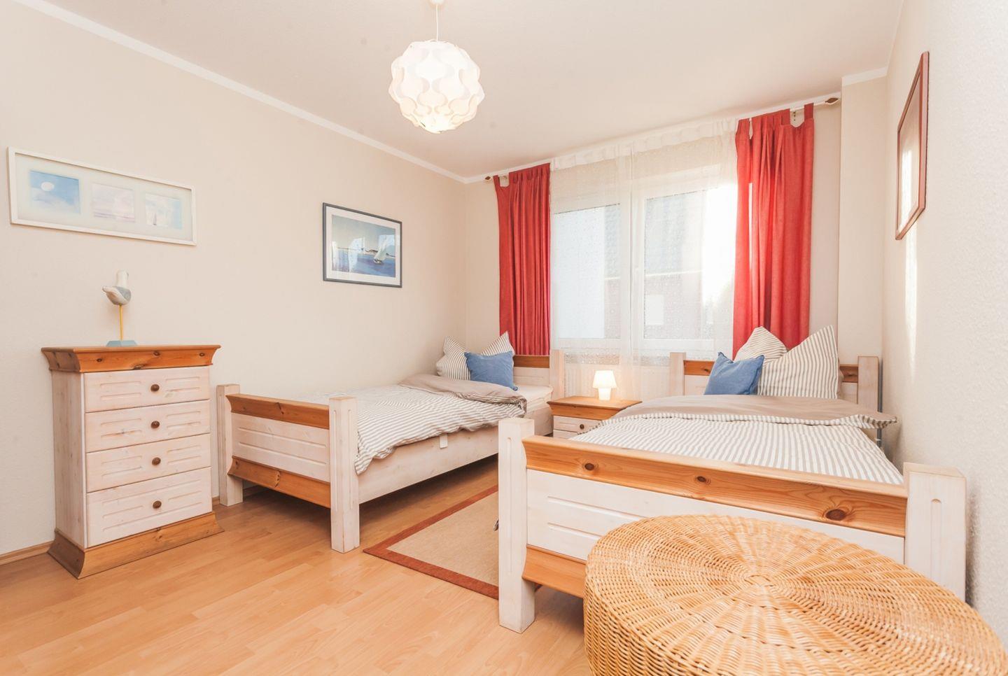 Die schöne, 65 m² große Erdgeschosswohnung liegt nur 400 Meter oder etwa 5 Gehminuten vom Strand bei der beliebten zentralen Seebrücke entfernt. Sie kann mit bis zu 4 Personen angemietet werden und ist ohne Absätze erreichbar. In das behagliche Wohnzimmer mit Zugang zur möblierten Westterrasse ist die Küche integriert und auch eine Essecke mit ausziehbarem Esstisch gehört zur Ausstattung. Eines der Schlafzimmer ist mit einem Doppelbett eingerichtet, im anderen stehen zwei einzelne Betten zur Verfügung. Im geräumigen, 2020 renovierten Badezimmer mit moderner Regendusche ist auch die Waschmaschine zu finden, Fliegengitter an den Fenstern und Aussenrollos ergänzen die Einrichtung.