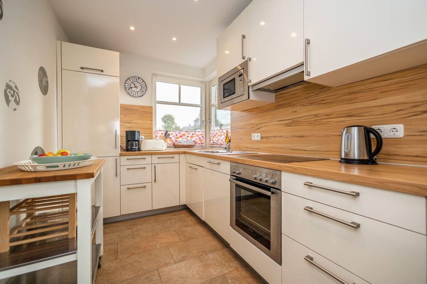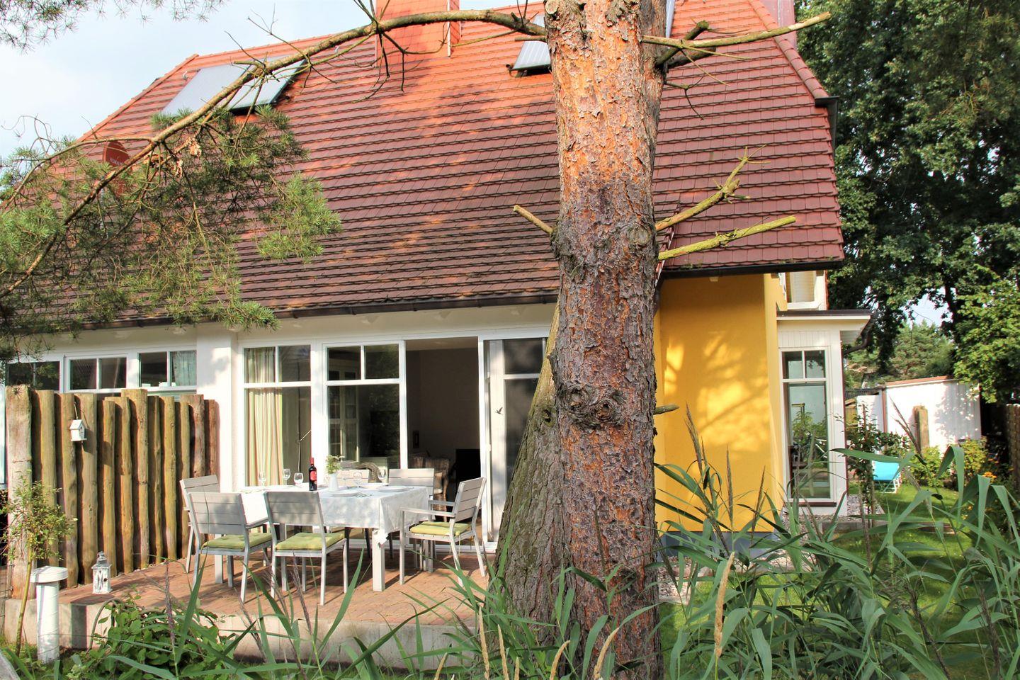 Die 111 qm große Doppelhaushälfte wird für max. 4 Erwachsene und 2 Kinder vermietet und liegt nur wenige Minuten Fußweg von der Ostsee entfernt. Das Erdgeschoss ist aufgeteilt in den Wohnbereich mit Kaminofen, Essecke und integrierter Küche sowie ein Bad mit Dusche und WC. Im 1. OG sind zwei Schlafzimmer jeweils mit einem Ehebett und ein weiteres Bad mit Dusche/WC und Sauna. Im 2. OG gibt es ein drittes Schlafzimmer mit 2 Einzelbetten. Das Haus hat eine Süd-Westterrasse. Eine Waschmaschine mit Trockner ist vorhanden. Am Haus gibt es 2 PKW-Stellplätze. Eine Besonderheit ist die kostenlos nutzbare E-Bike Ladestation im abschließbaren Fahrradschuppen.