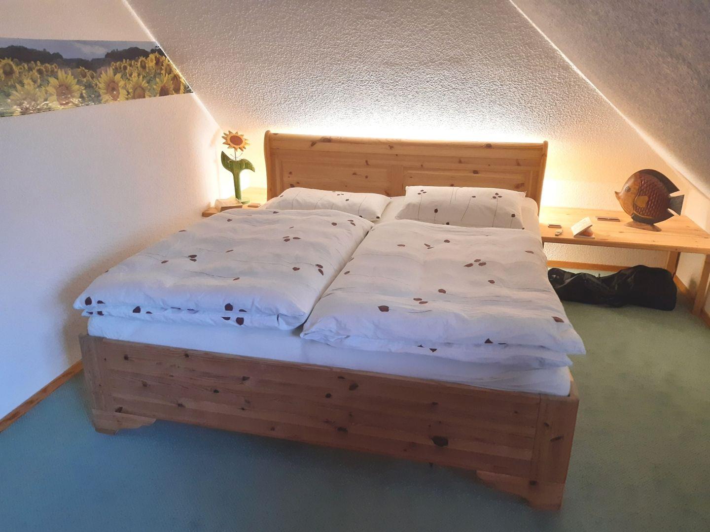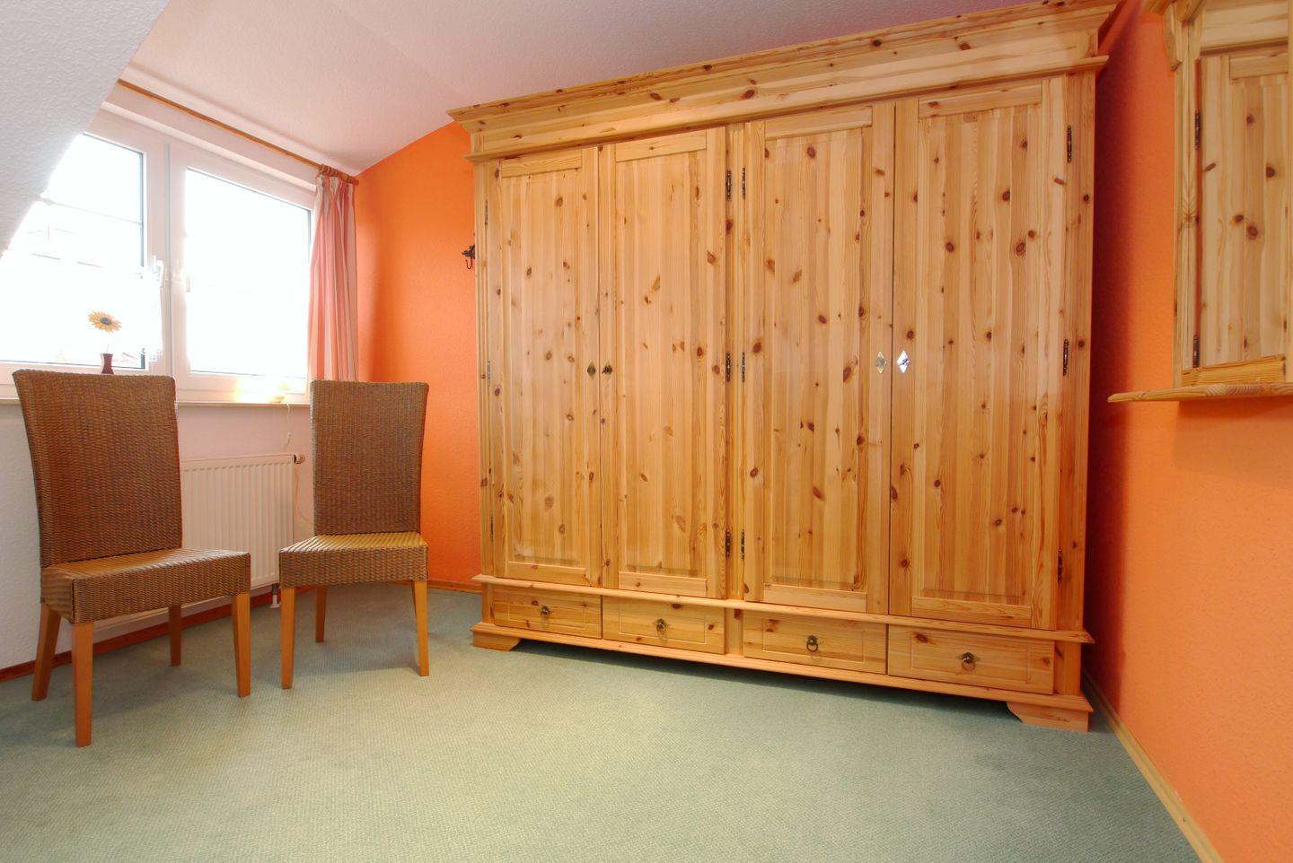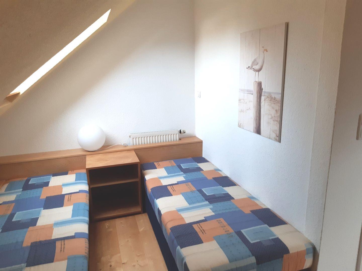 Diese 84 m² große Doppelhaushälfte kann mit bis zu 4 Erwachsenen und 1 Kind angemietet werden. Im Erdgeschoss ist das Wohnzimmer mit einem Elektrokamin und Essecke zu finden, von hier erfolgt auch der Zugang zur Südterrasse. Das Haus verfügt über eine separate Küche in der auch die Waschmaschine zu finden ist und ein Badezimmer mit Badewanne und Dusche. Die beiden Schlafzimmer liegen im Obergeschoss, eines ist mit einem Doppelbett und das andere mit drei Einzelbetten ausgestattet. Ein Internetzugang über WLAN ist möglich.