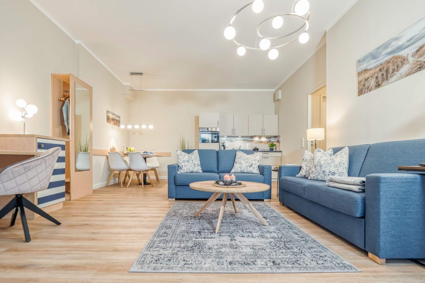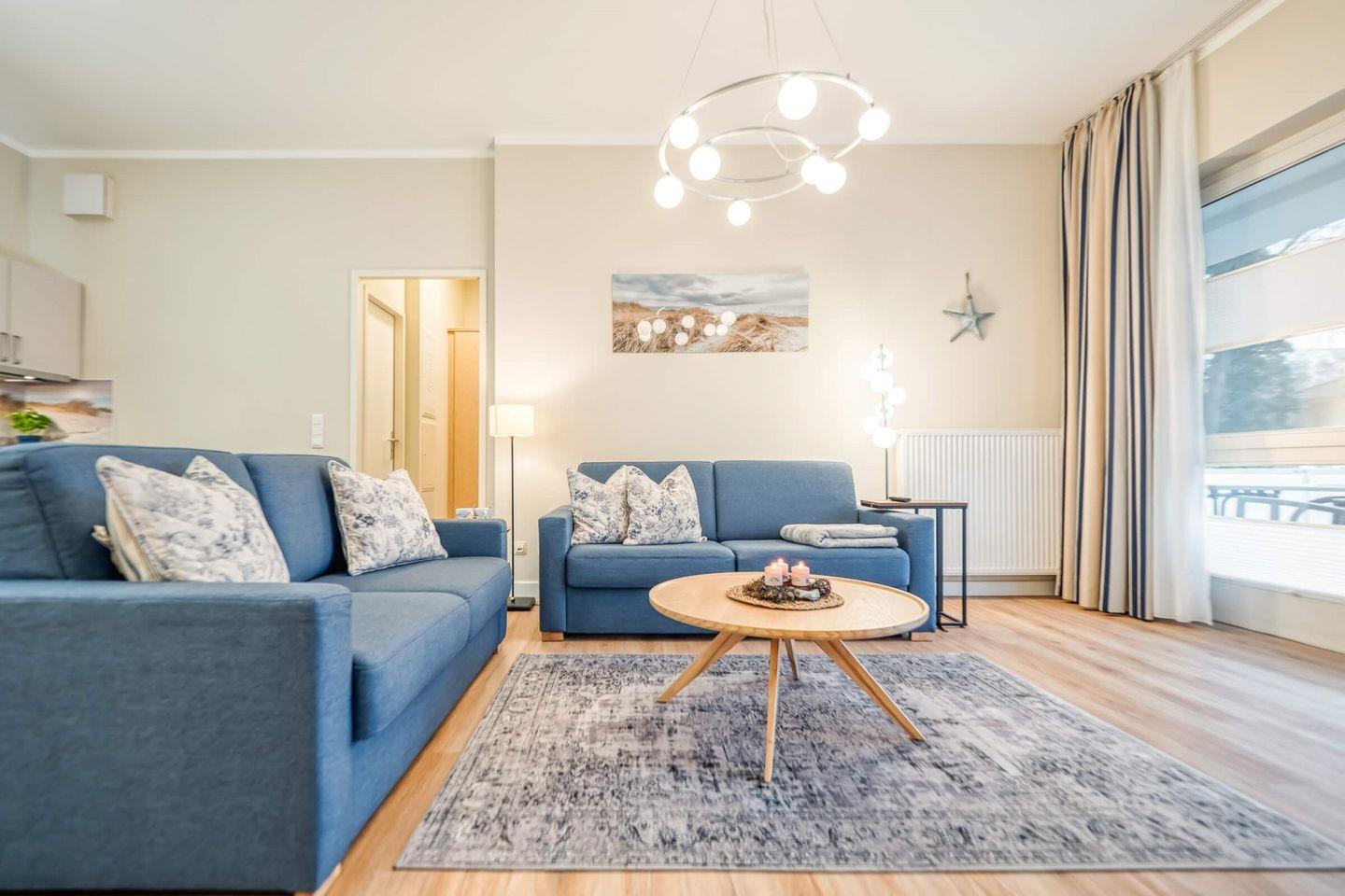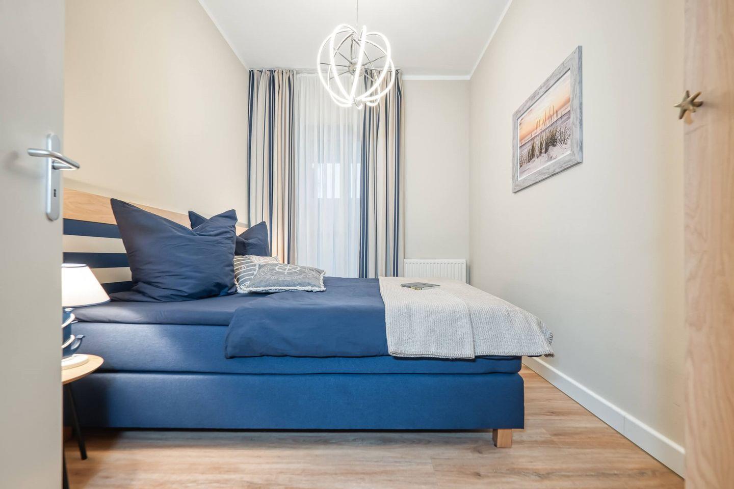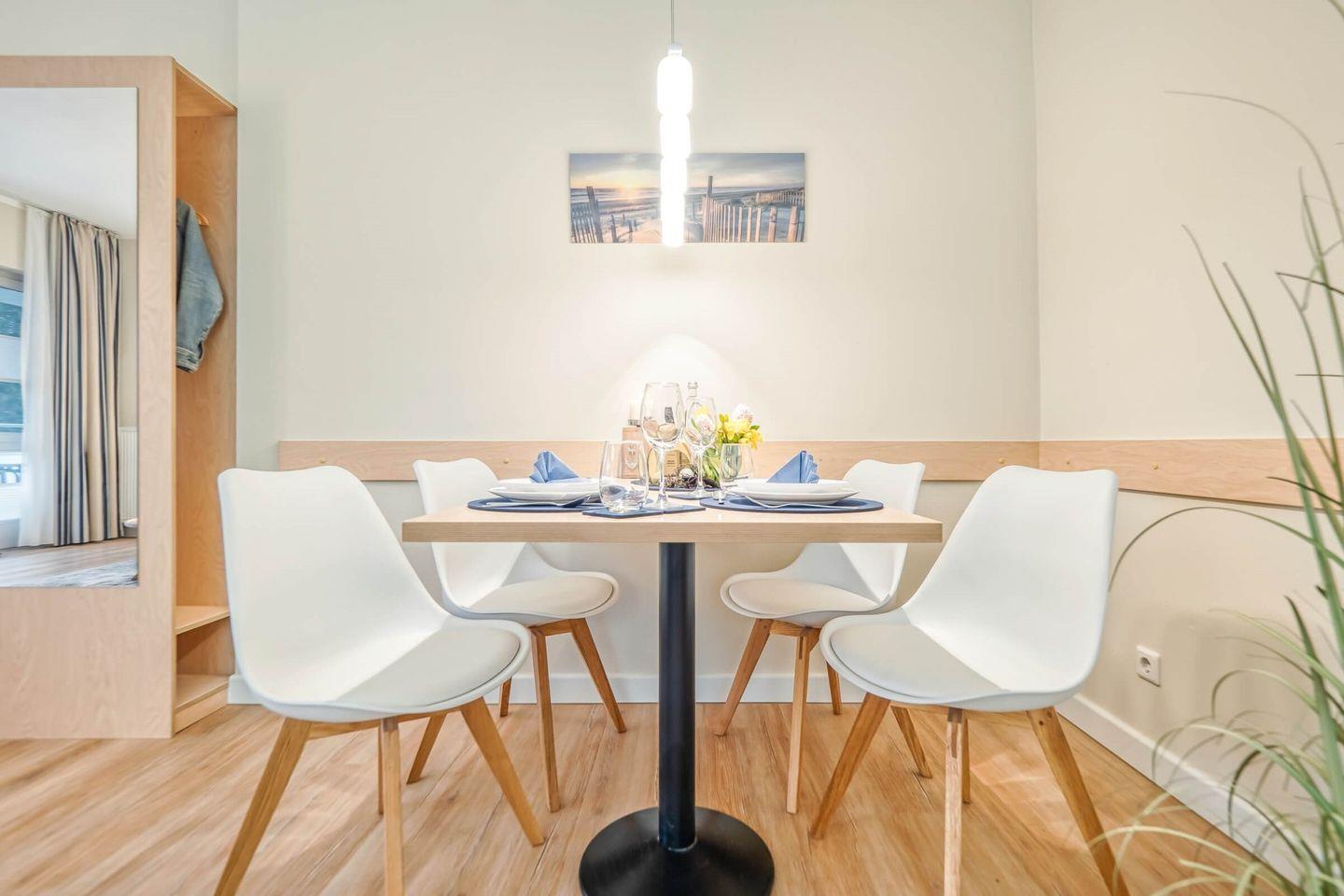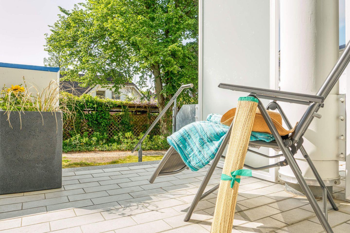 Die 55 qm große Erdgeschosswohnung kann mit bis zu 2 Erwachsenen angemietet werden. Die Ferienimmobilie verfügt über einen großen Wohnraum, in den die Küchenzeile und eine kleine Essecke integriert sind. Die große Süd-Ost-Terrasse erreichen Sie sowohl über das Wohnzimmer als auch über das Schlafzimmer. Das Schlafzimmer ist mit einem Doppelbett (1,60 x 2,00 m durchgehende Matratze) ausgestattet. Das Badezimmer ist mit einer Dusche eingerichtet. Die Ferienwohnung befindet sich in direkter Strandnähe.