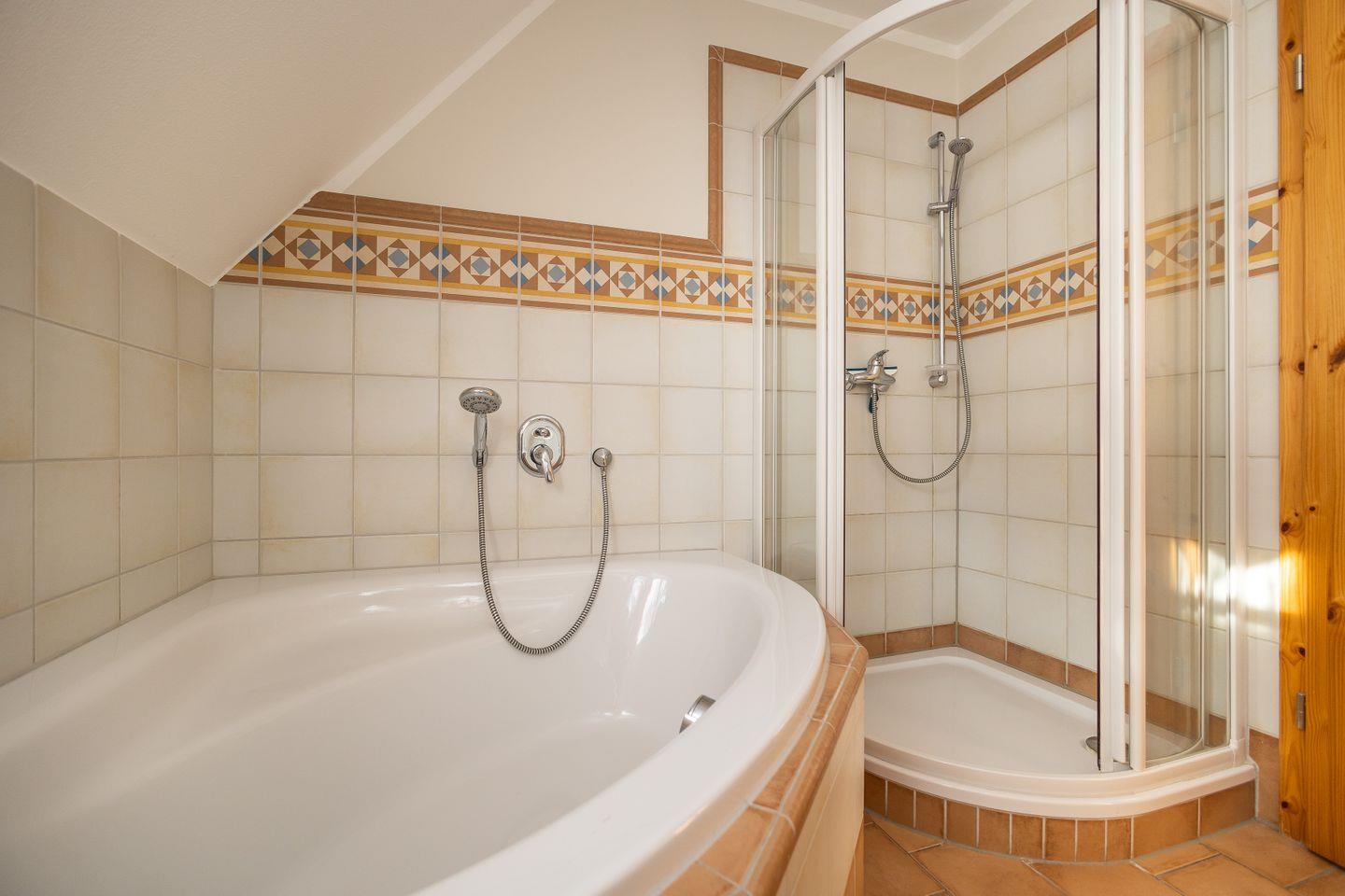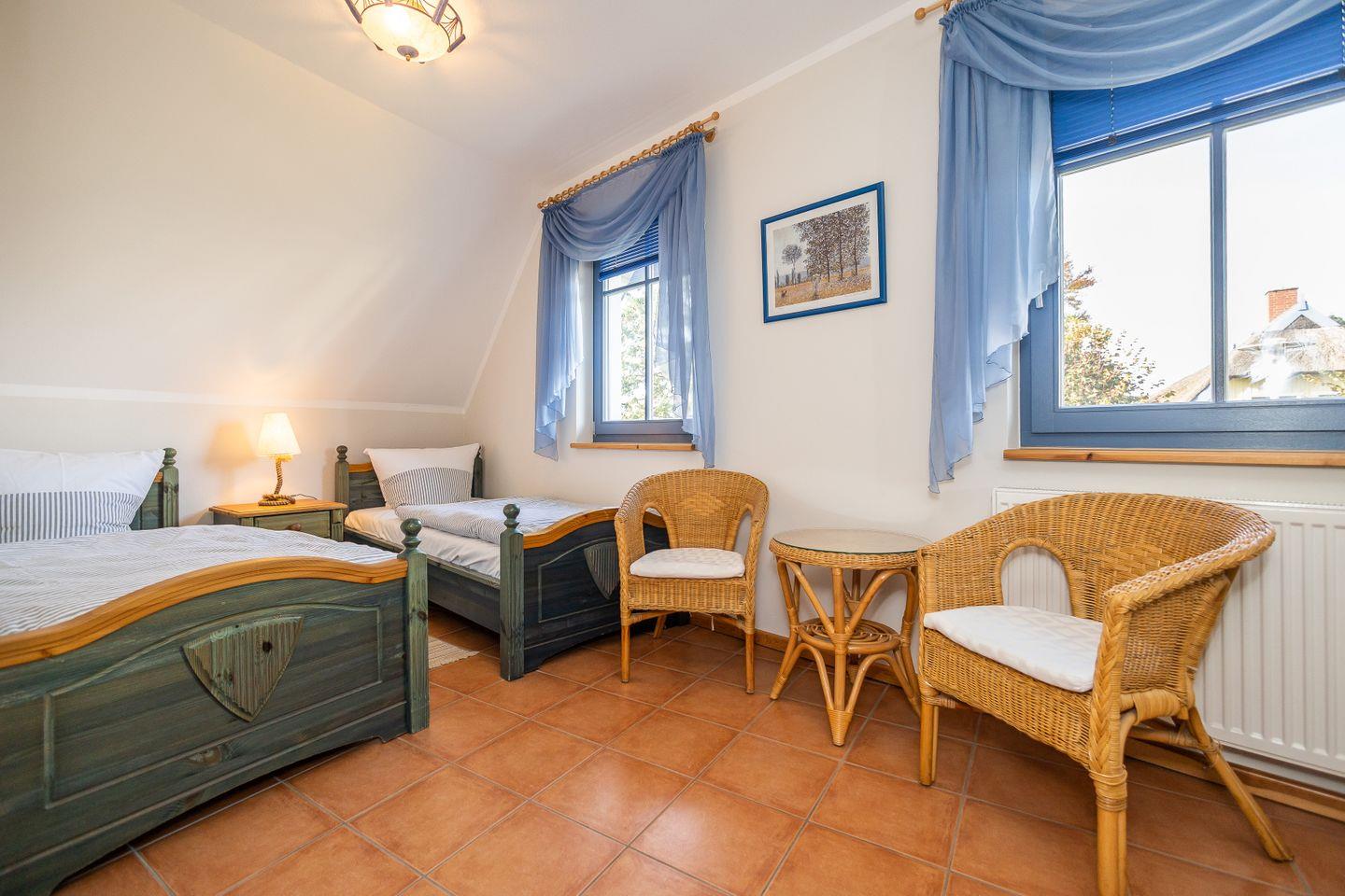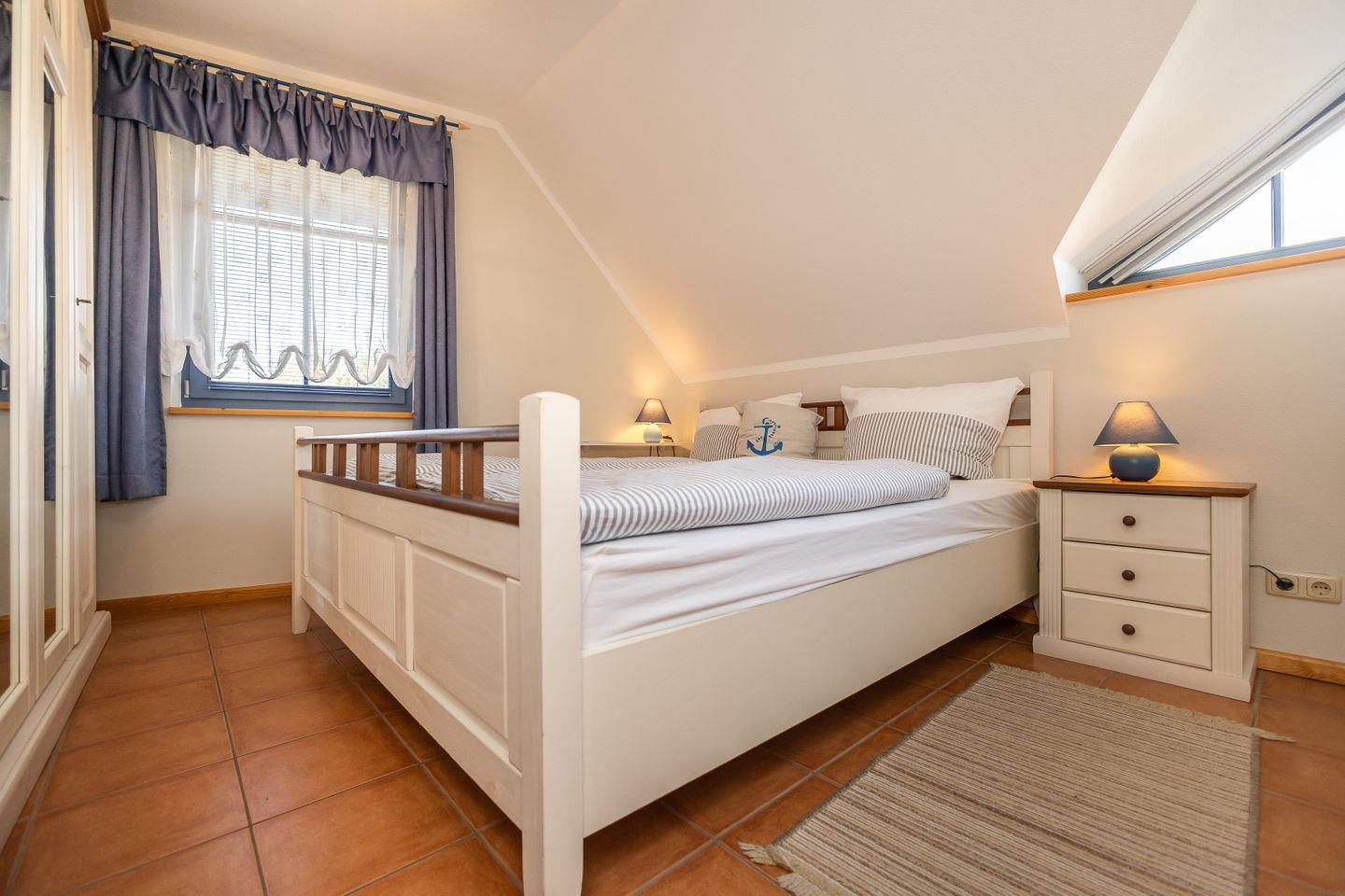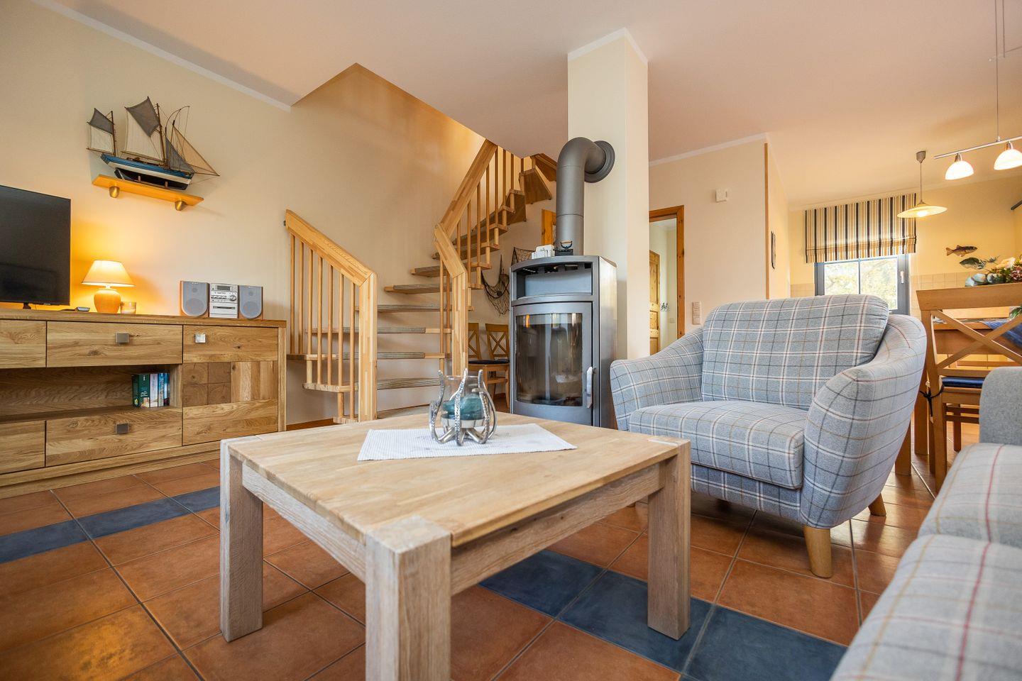 Die 95 qm große Doppelhaushälfte verfügt über drei Etagen und kann mit maximal 4 Erwachsenen + 2 Kindern angemietet werden. Im Erdgeschoss befinden sich das Wohnzimmer mit Kaminofen, eine kleine Essecke sowie die integrierte Küche und das Gäste-WC. Das 1. Obergeschoss ist mit zwei Schlafzimmern, eines mit Doppelbett und eines mit zwei einzelnen Betten ausgestattet. Das große Badezimmer verfügt über eine Dusche und eine Eckbadewanne. Im Dachgeschoss ist das dritte Schlafzimmer zu finden, ebenfalls mit zwei einzelnen Betten eingerichtet.