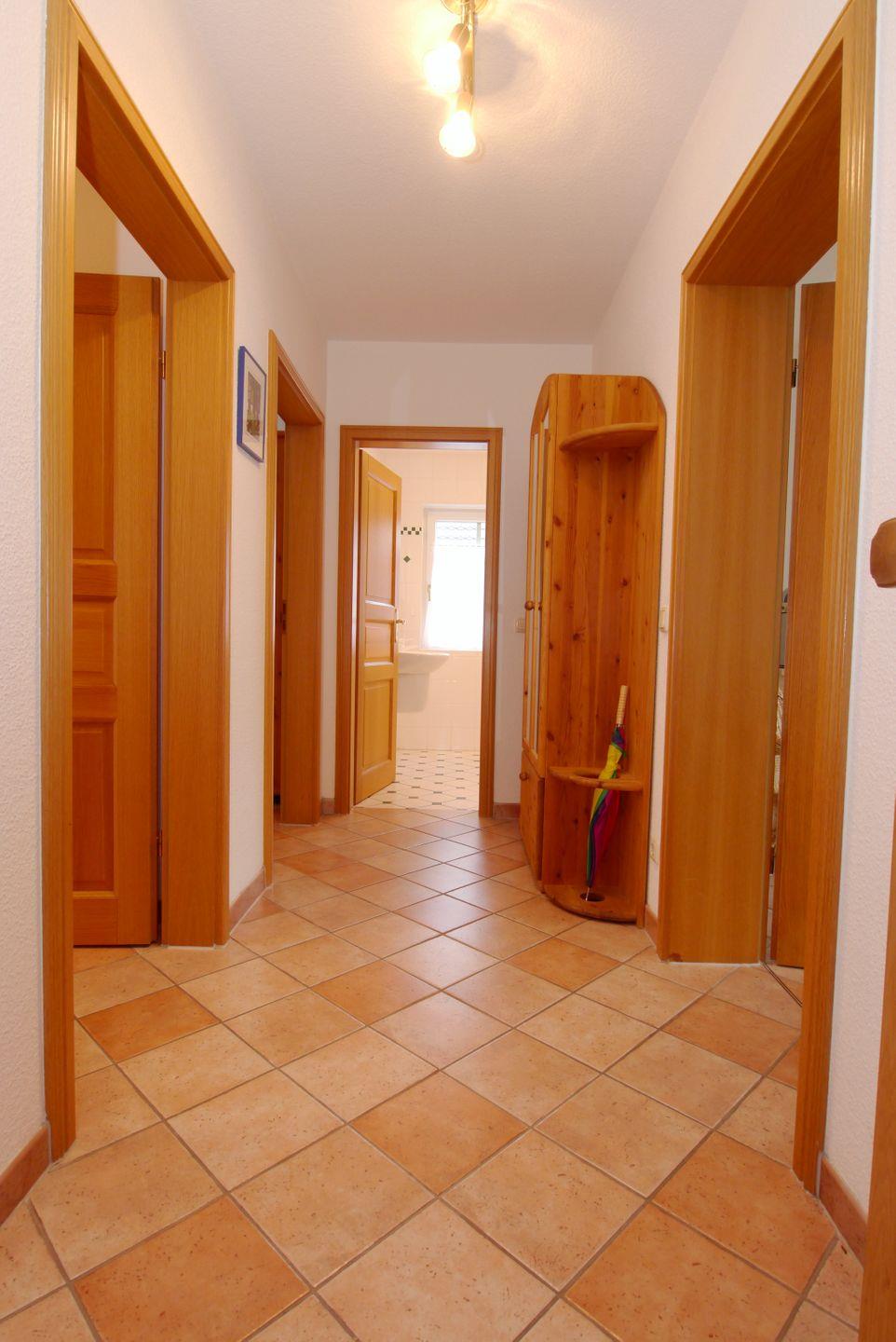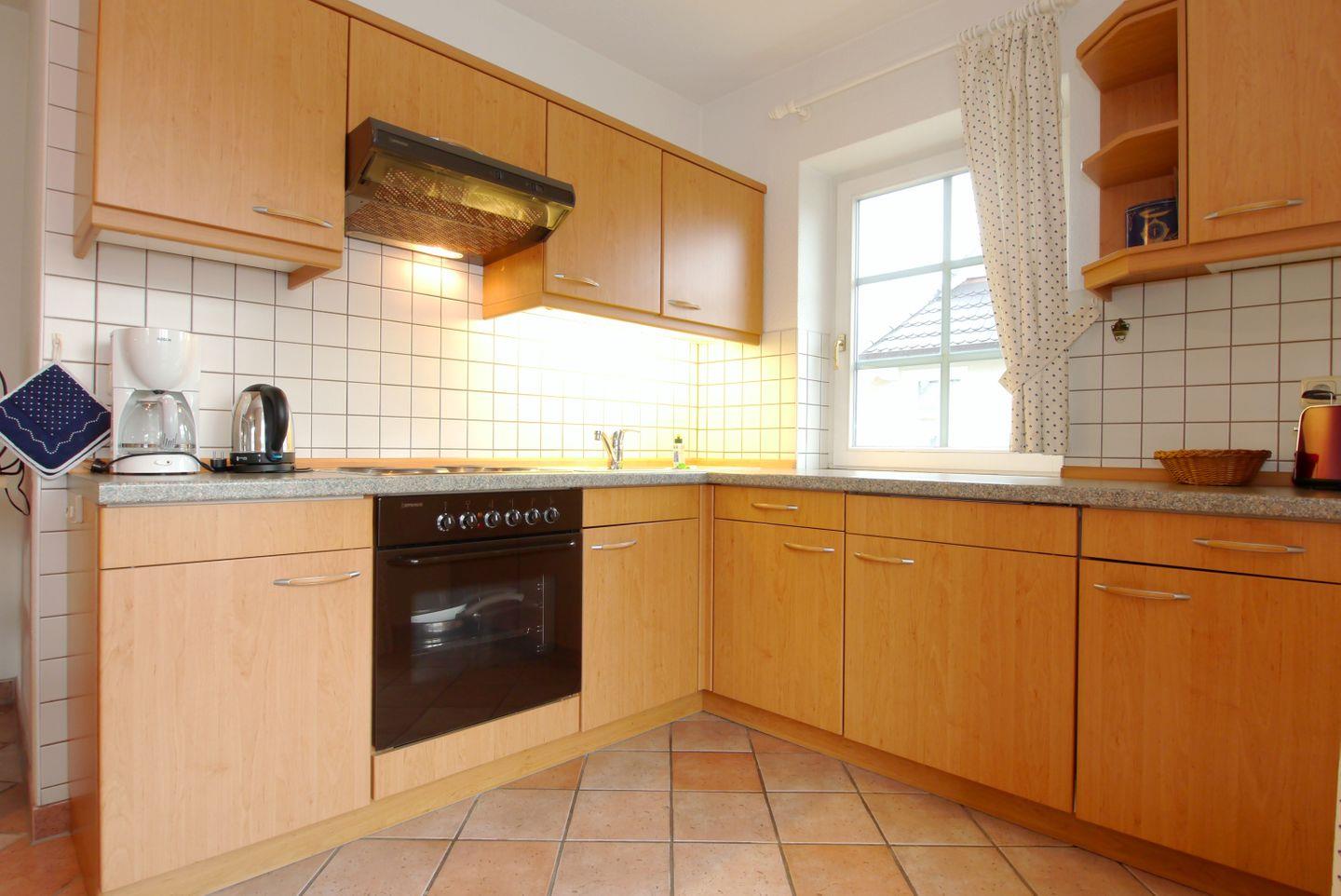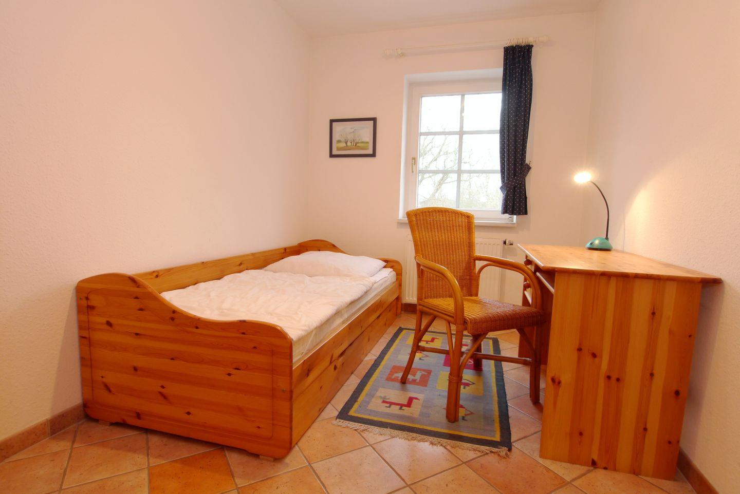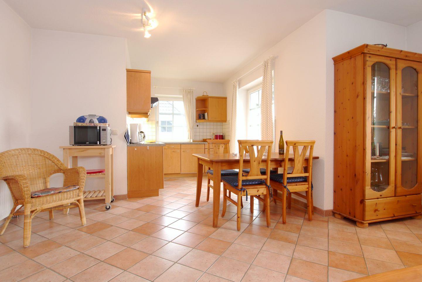Die 65 qm große Obergeschosswohnung liegt in der 1. Etage und wird für bis zu 3 Erwachsene und 1 Kind vermietet. In das Wohnzimmer ist die Küchenzeile integriert, hier finden Sie auch eine kleine Essecke und den Zugang zum Südbalkon. Eines der Schlafzimmer ist mit einem Doppelbett ausgestattet, das andere verfügt über ein Ausziehbett für bis zu zwei weitere Personen. Im Badezimmer steht eine Dusche zur Verfügung und im Schuppen vor dem Haus können Fahrräder eingestellt werden.