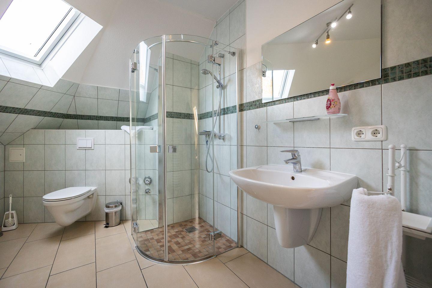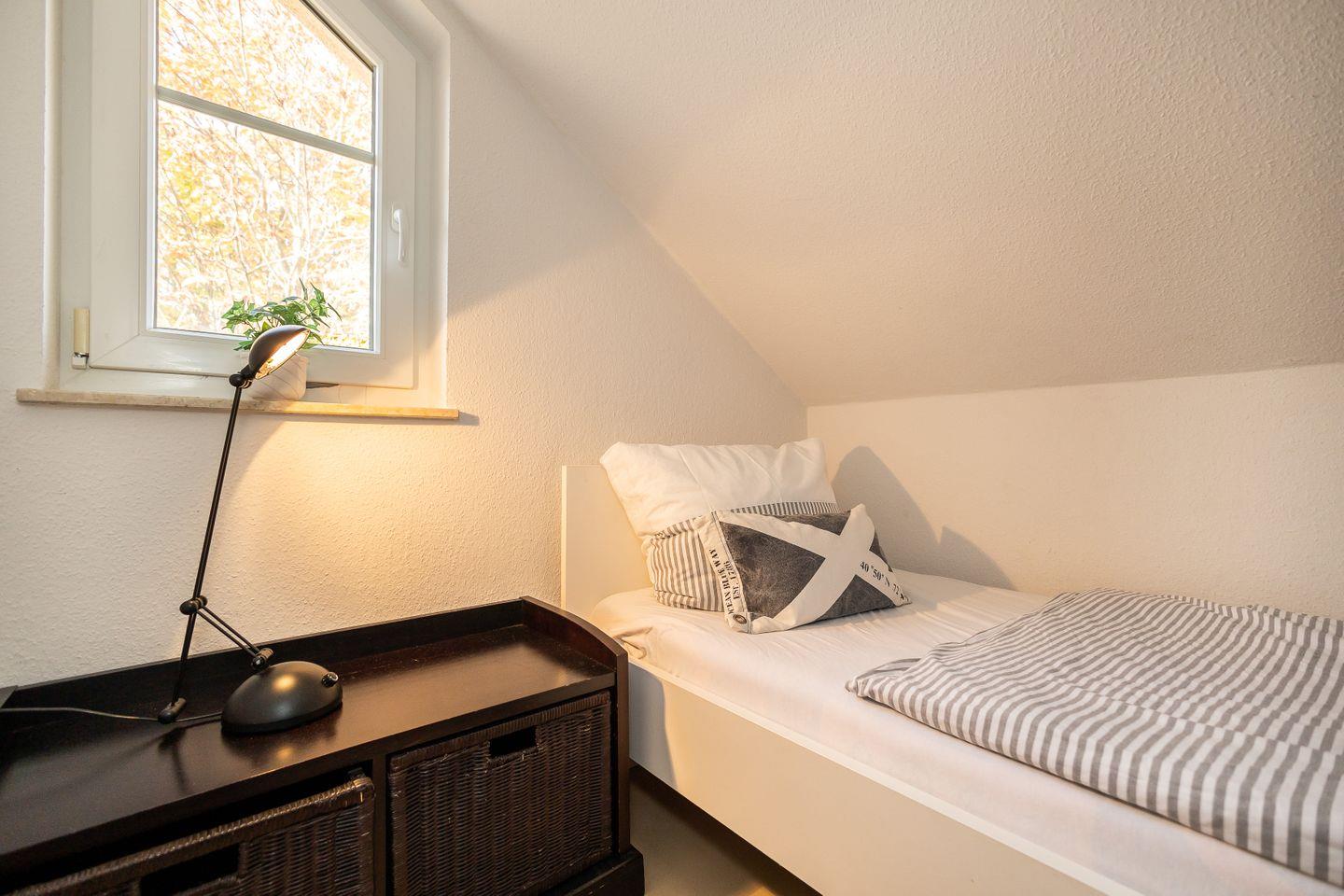 Die 55 m² große Wohnung befindet sich in der 2. Etage und wird für maximal 2 Erwachsene und 1 Kind vermietet. Über den Eingangsbereich in dem die Essecke zu finden ist, gelangt man in das Wohnzimmer mit Kaminofen und der integrierten Küche. Eines der Schlafzimmer ist mit einem Doppelbett und zweitem Fernseher ausgestattet. Durch das Badezimmer mit Glasdusche gelangt man in das zweite Schlafzimmer in dem ein einzelnes Bett zu finden ist. Zur Wohnung gehört ein Fahrradkeller im Haus.