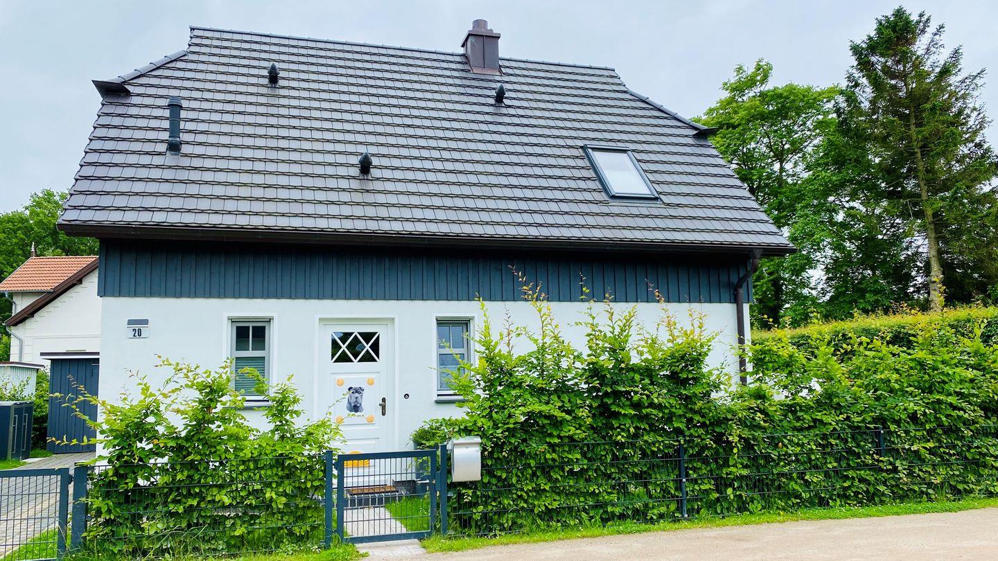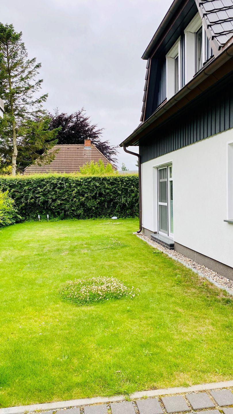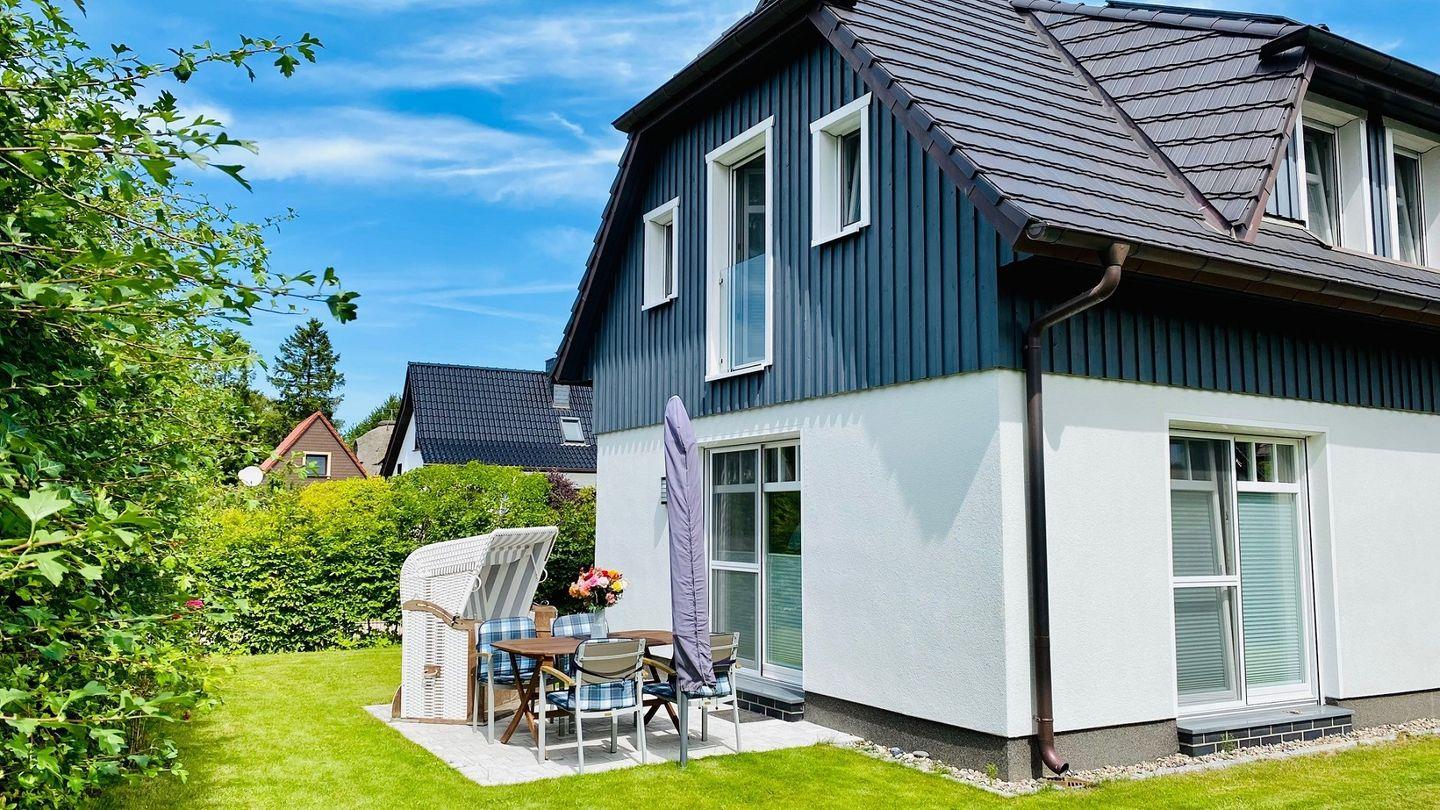 Terrasse mit Gartenmöbel, Sonnenschirm, 2 Sonnenliegen, Holzkohlegrill, Strandkorb (Mai-Oktober)