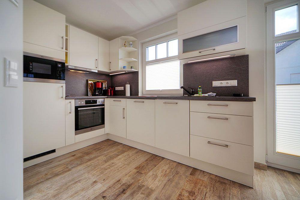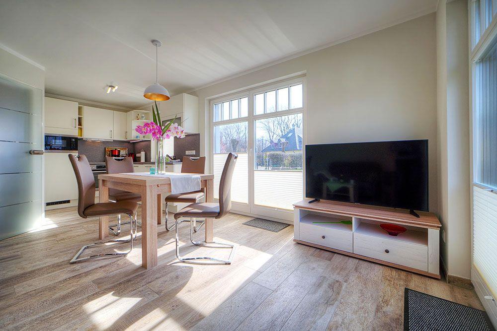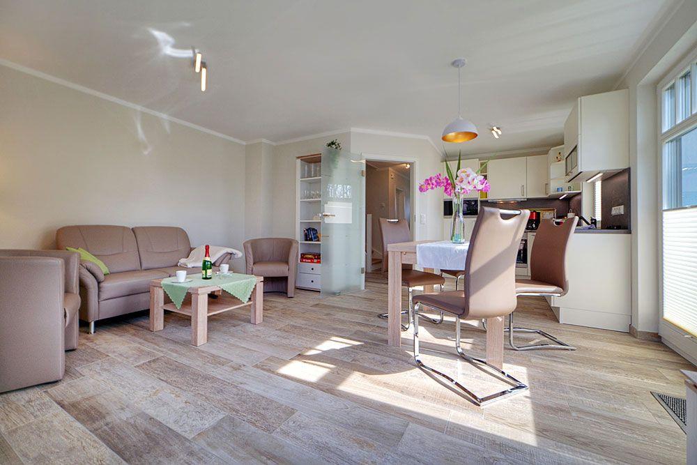 Wohnraum mit Ledercouch, Esstisch für 4 Personen