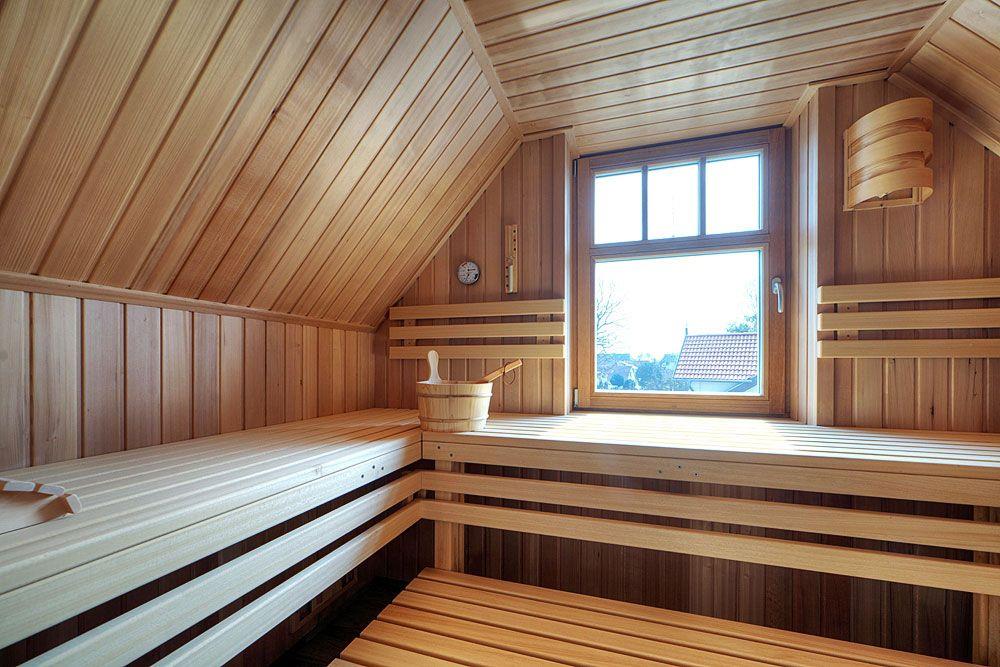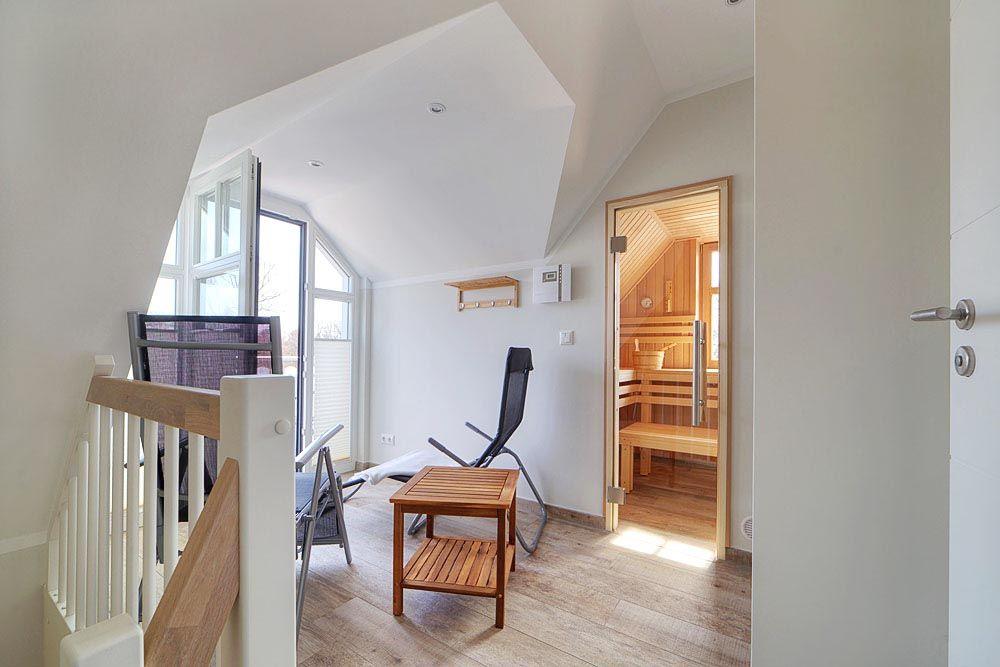 Wellnessbereich mit Sauna (ohne Gebühren) und Ruhebereich mit Saunaliege
