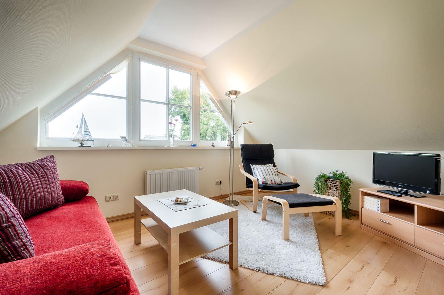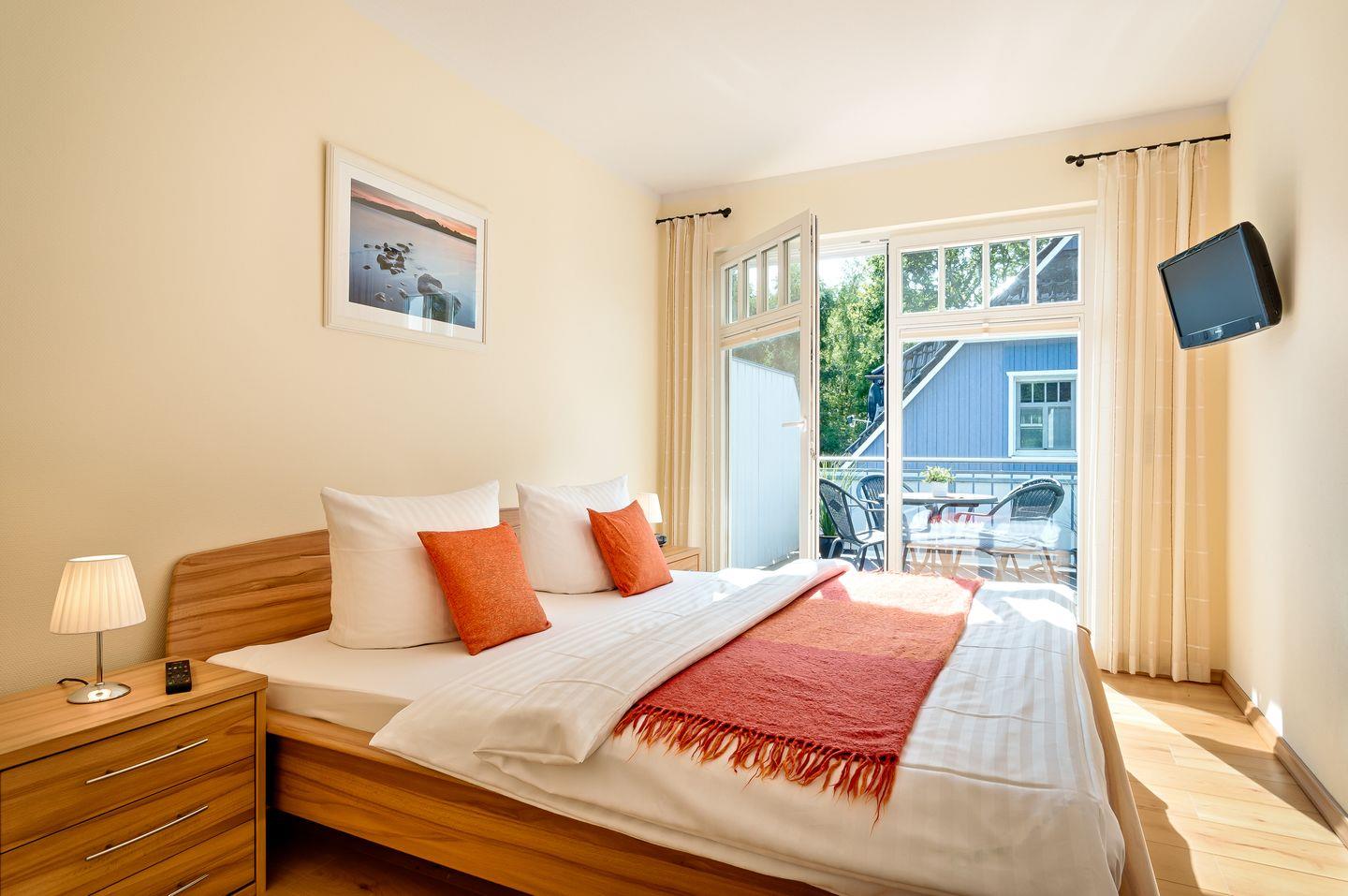 1 Schlafzimmer mit Doppelbett (1,80x2,00m) mit verstellbaren Lattenrosten, TV, Zugang zur Dachterrasse