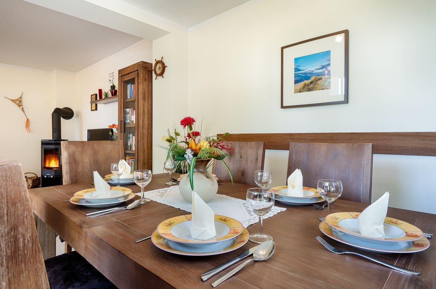 Wohnraum mit Eckcouch und Esstisch für 6 Personen