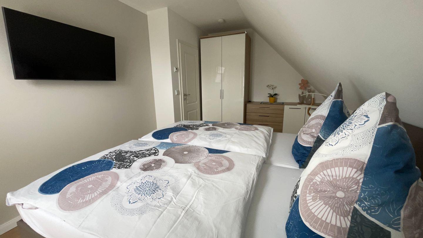 mit 2 getrennten Betten, Fernseher, Schreibtisch und Wandschrank,
