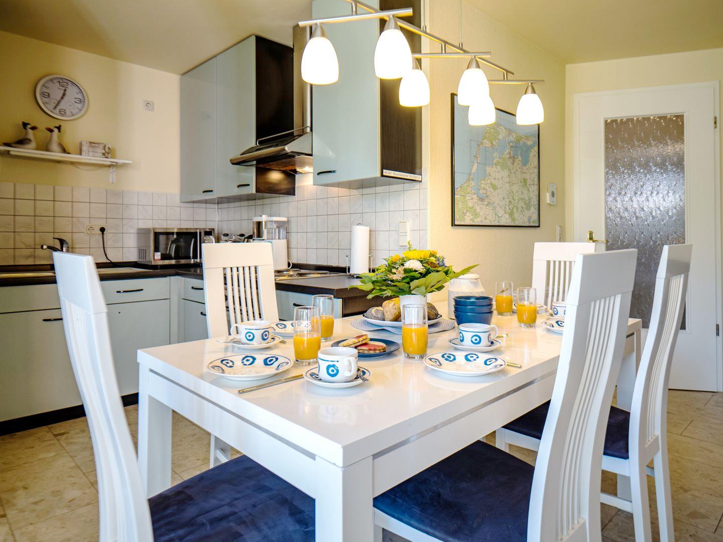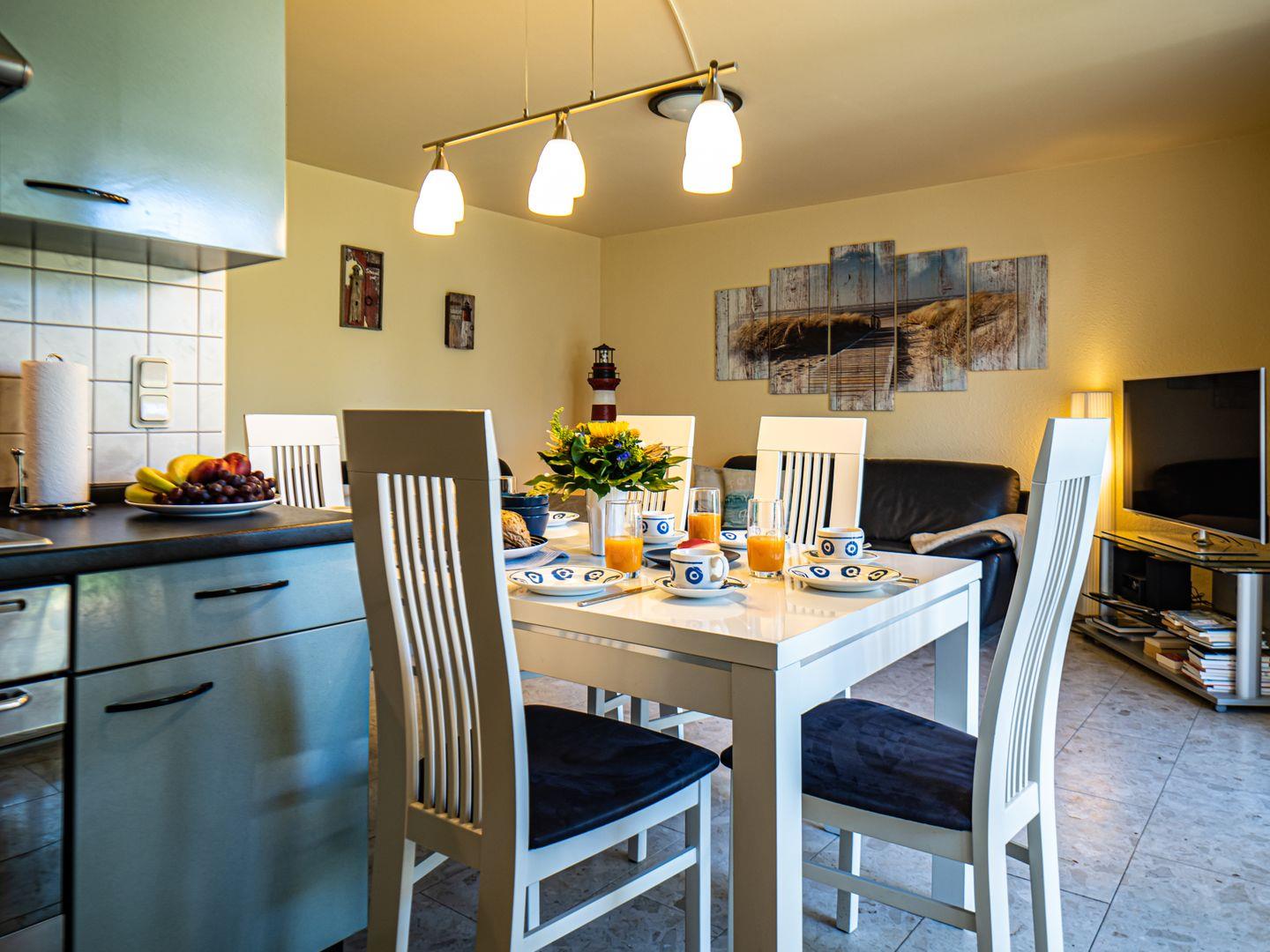 Die Wohnung ist großzügig geschnitten und eignet sich daher wunderbar für einen geselligen Familienalltag. Vom Wohnzimmer aus gelangen Sie zur Terrasse, welcher ein kleiner Vorgarten angelehnt ist. Gerade am Vormittag können Sie hier genüsslich bei Sonnenschein das Frühstück genießen. Gartentisch, Gartenstühle sowie Sonnenschirm sind vor Ort vorhanden. Am Wohnzimmer angeschlossen befindet sich die offene Küche, welche über alle notwendigen Gerätschaften verfügt.