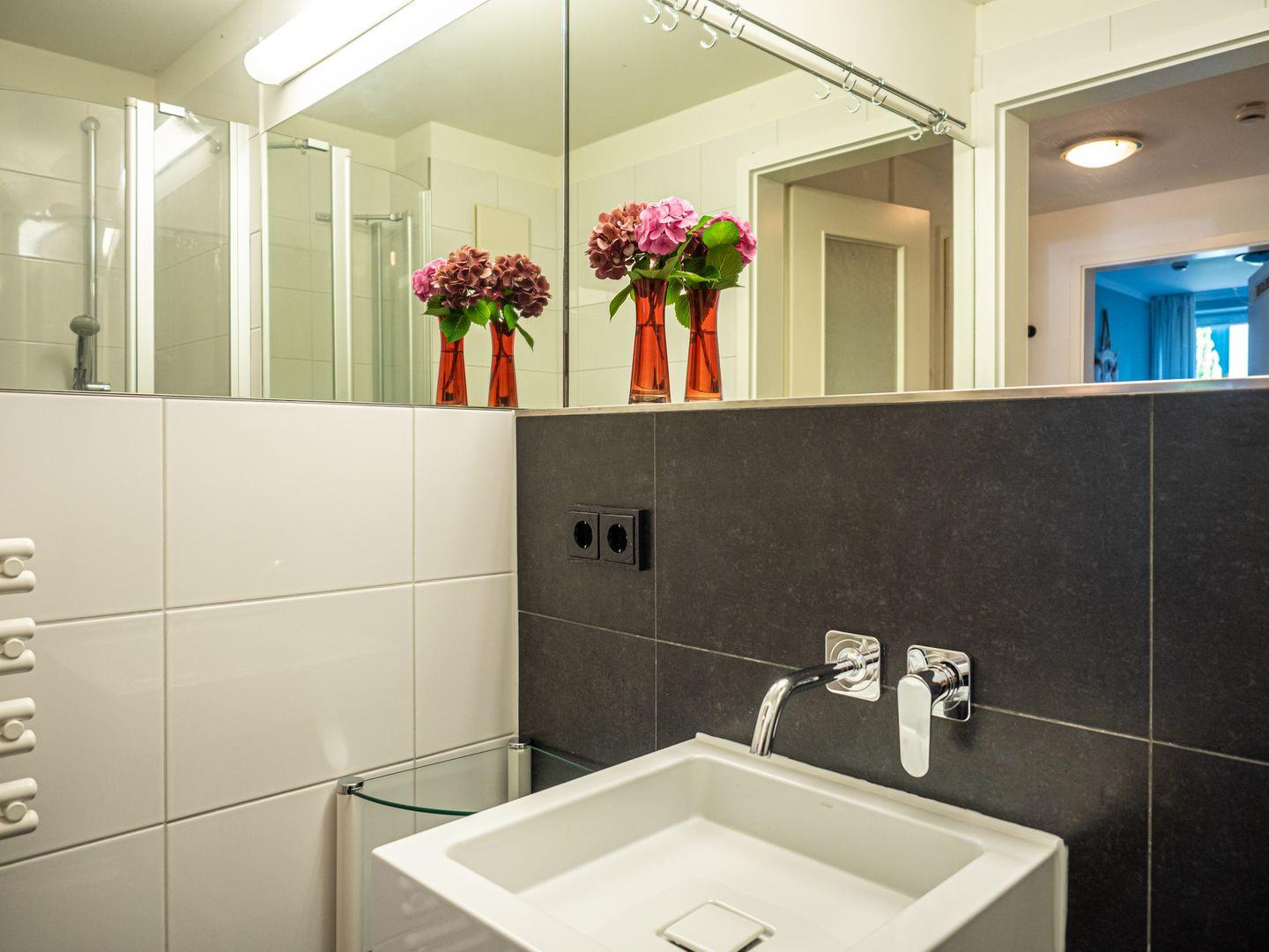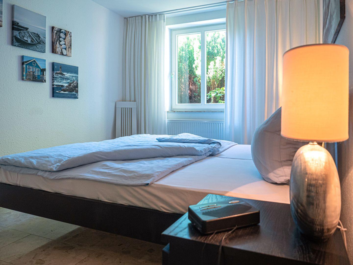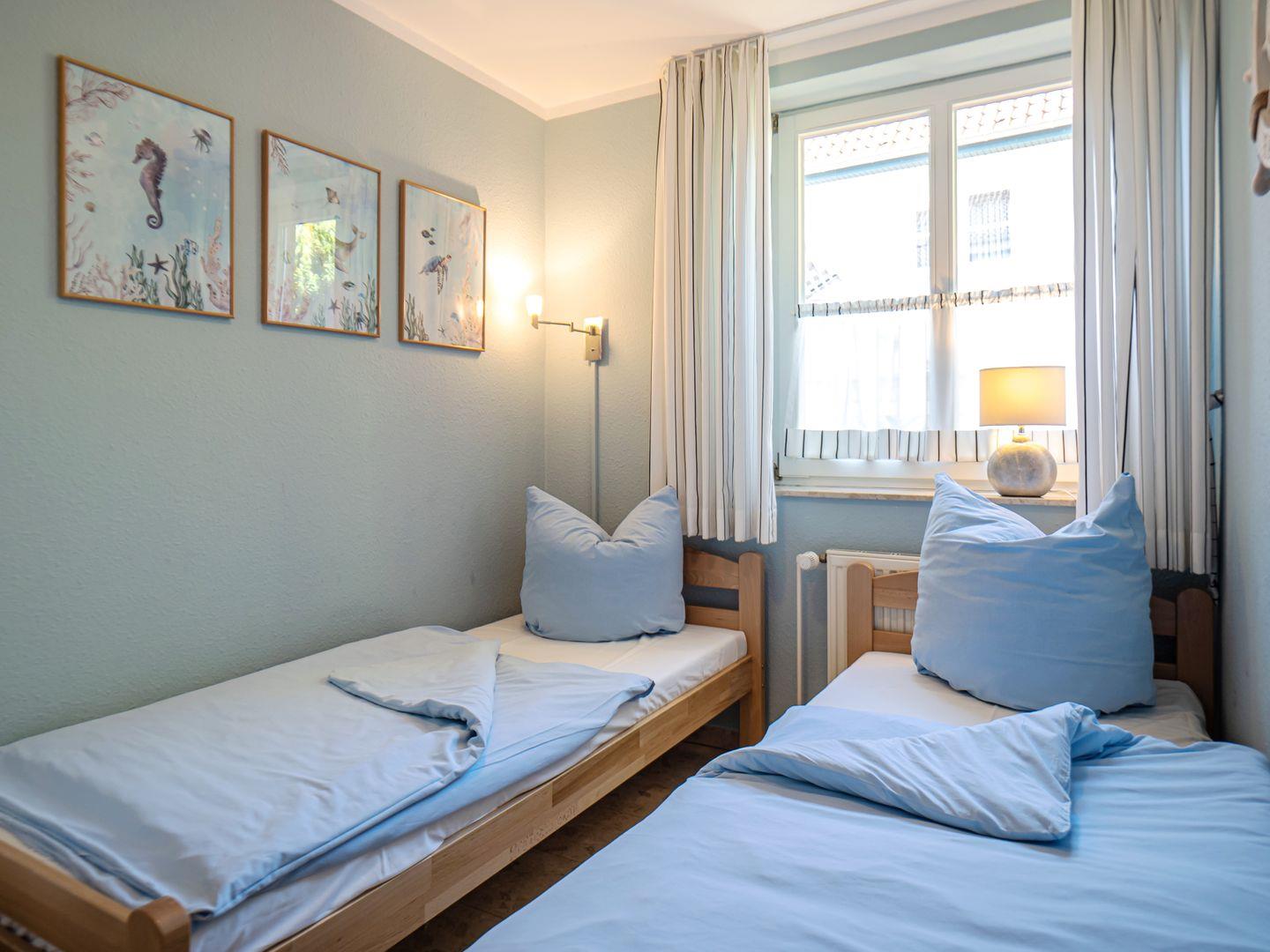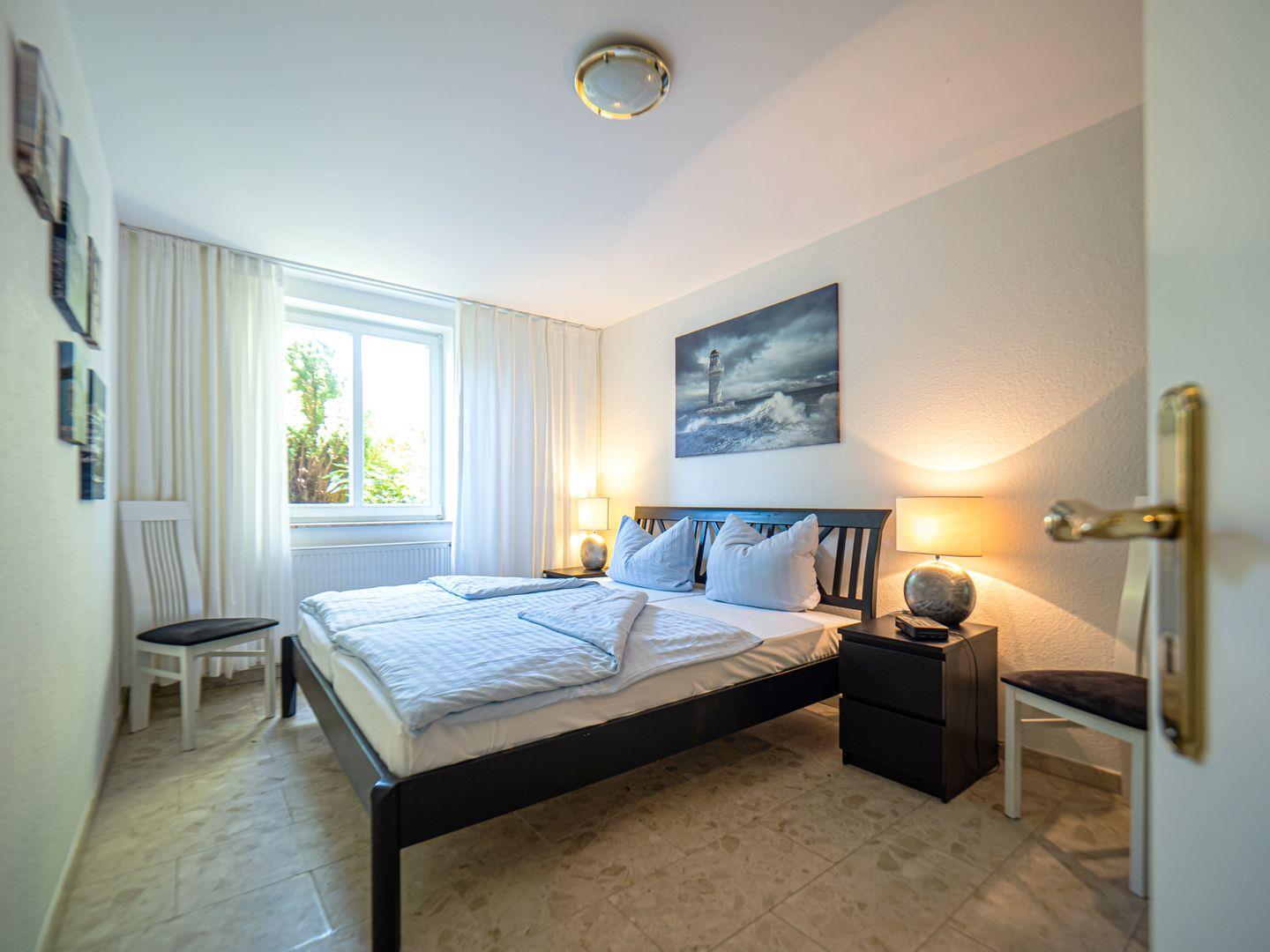 Es ist ein Schlafzimmer mit einem Doppelbett (zwei Einzelmatratzen je 90x200) und einem großen Kleiderschrank vorhanden. Angeschlossen daran befindet sich ein Kinderzimmer, mit zwei Einzelbetten (80x200). Das Badezimmer verfügt über eine Dusche. Ebenso ist eine Waschmaschine vor Ort vorhanden, welche gerne genutzt werden kann.