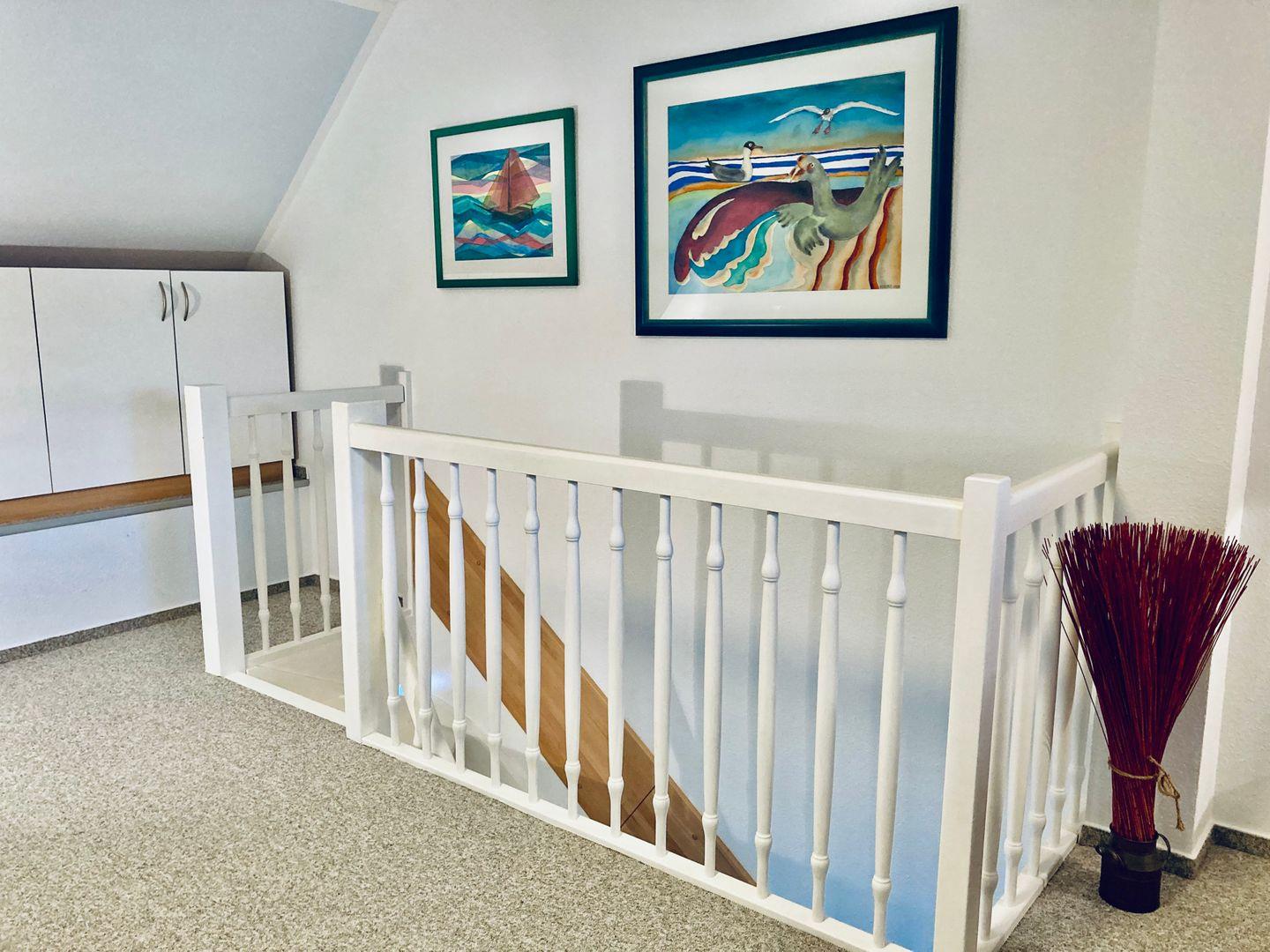 Vom Wohnzimmer gelangen Sie auf den Balkon mit Blick auf die grüne Umgebung der Ferienwohnanlage Achtern Diek – ein idealer Ort, um den Abend entspannt ausklingen zu lassen. Über eine Holztreppe erreichen Sie die obere Etage mit einem großzügigen Schlafzimmer, ausgestattet mit einem komfortablen Doppelbett und ausreichend Stauraum für Ihre persönlichen Sachen.