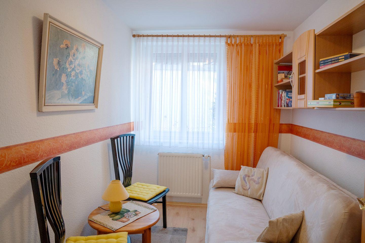 Die 60 qm große Erdgeschosswohnung wird für maximal 3 Personen vermietet. Über den kleinen Flur mit der Garderobe gelangt man in den Wohnbereich mit integrierter Küche und Zugang zur offenen Terrasse. Das große Schlafzimmer ist mit einem Doppelbett ausgestattet und im kleineren Schlafzimmer steht eine gemütliche Schlafcouch zur Verfügung. Die Wohnung liegt in unmittelbarer Nähe zum wunderschönen Ostseestrand von Zingst.