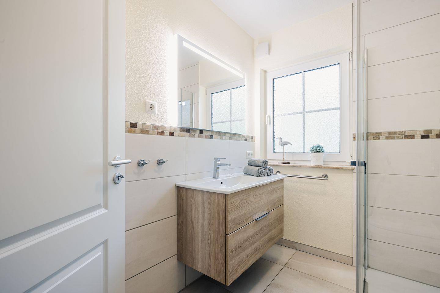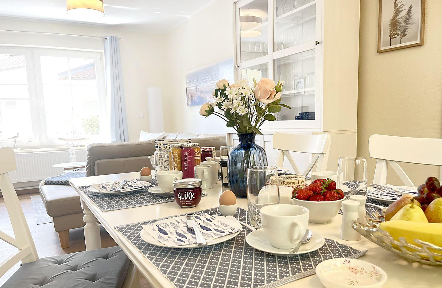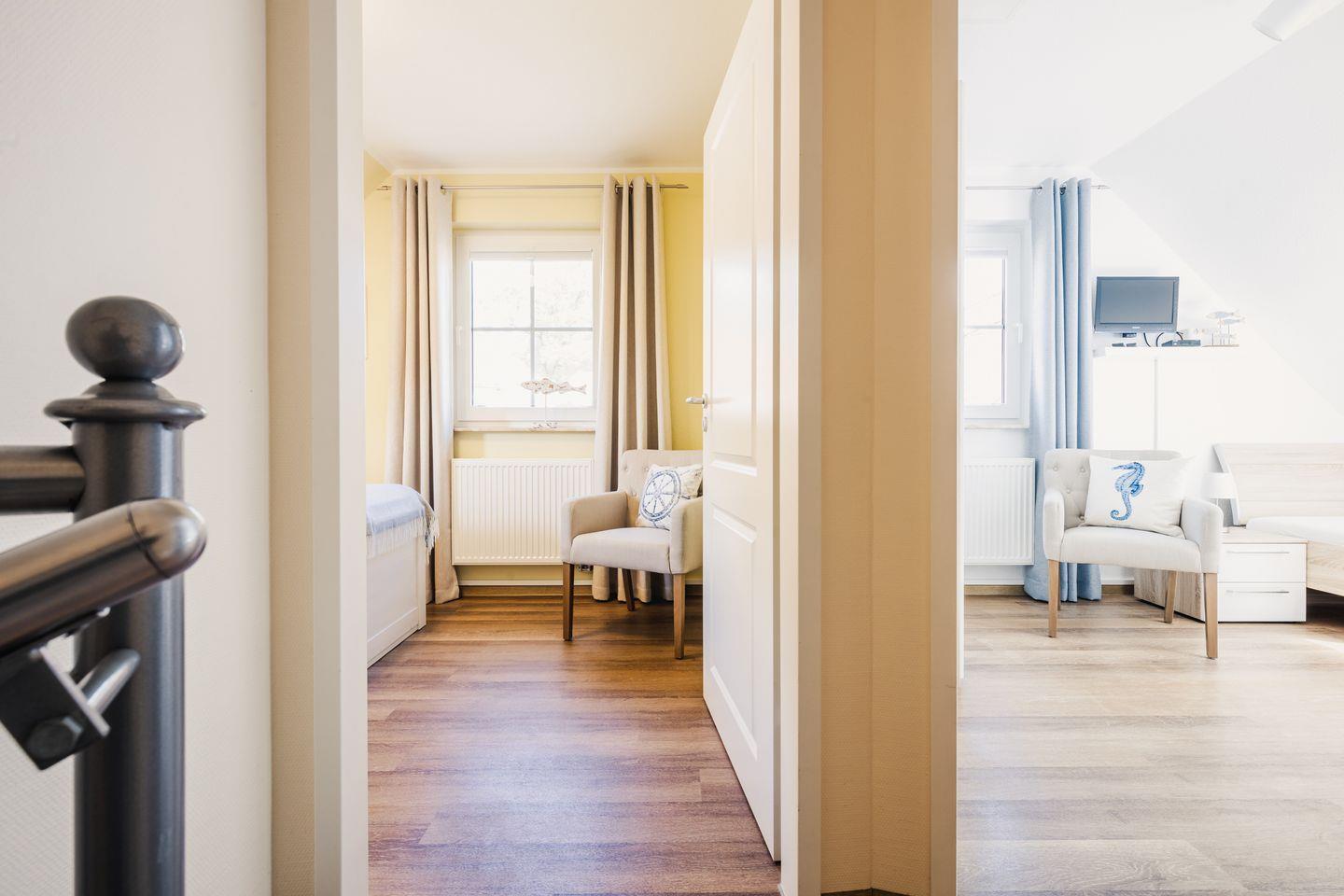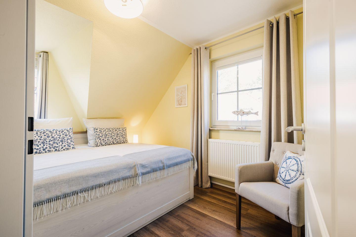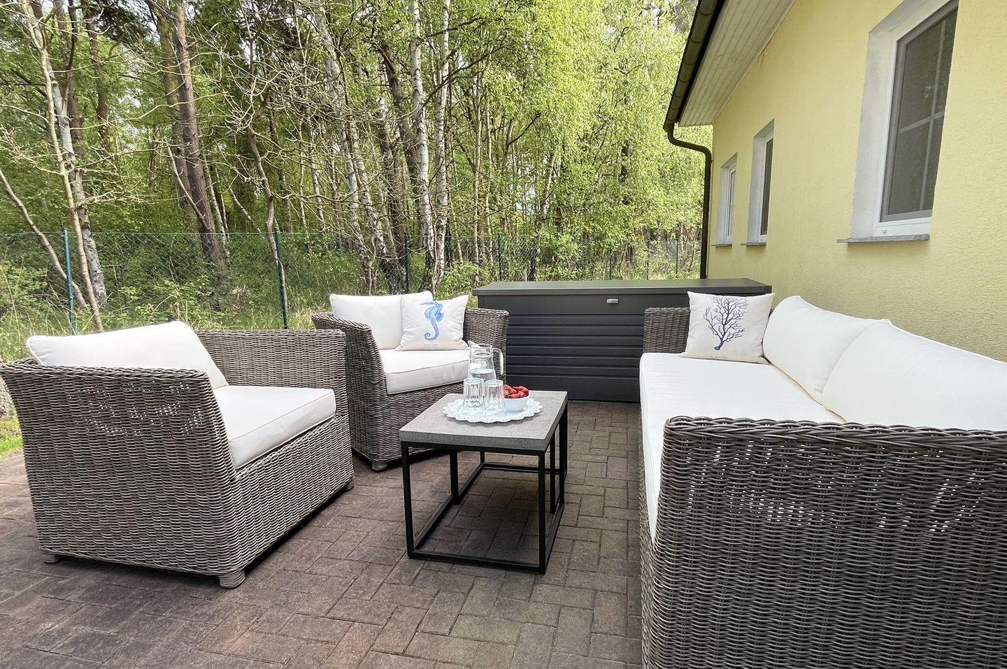 Die liebevolle eingerichtete Doppelhaushälfte liegt in bester Lage zum wunderschönen Strand in Zingst. Das Haus wurde 2023 komplett renoviert und größtenteils neu möbliert. Im Erdgeschoss befindet sich der gemütliche Wohnbereich mit Flat TV, Sofaecke und einer offenen Küche mit großzügigem Essbereich. Weiterhin befindet sich im Erdgeschoss ein komplett renoviertes, modernes Duschbad mit Fußbodenheizung. Die beiden Schlafzimmer befinden sich im Obergeschoss, welche über eine Wendeltreppe zu erreichen ist. Eines der Schlafzimmer verfügt über ein großes, bequemes Doppelbett. Das andere Schlafzimmer ist mit zwei komfortablen Einzelbetten sowie einem Flat TV ausgestattet. Zudem befindet sich im Obergeschoss ein weiteres Gäste-Bad. Am Haus befinden sich zwei Terrassen (Ost- und Westausrichtung), auf denen Sie an sonnigen Tagen sowohl die Sonne genießen können, aber ein auch ein schattiges Plätzchen am Rande eines kleinen Wäldchens. Ein abschließbarer Abstellraum und ein Fahrradständer sich ebenfalls vorhanden.