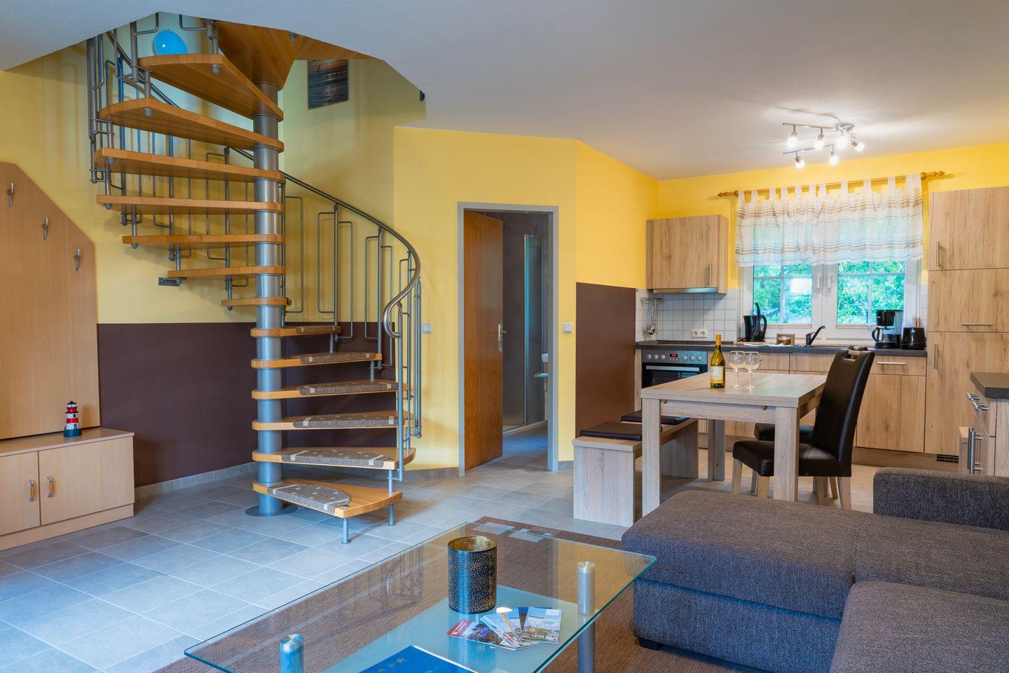 Das zweigeschossige Ferienhaus ist für bis zu vier Personen konzipiert und eignet sich sowohl für Familien als auch für Paare und Erholungssuchende. Im Erdgeschoss befindet sich das offene und helle Wohnzimmer, das durch komfortable Sitzgelegenheiten, einen Kaminofen für wohlige Wärme an kühleren Tagen sowie einen Flachbild-TV zum Verweilen einlädt.