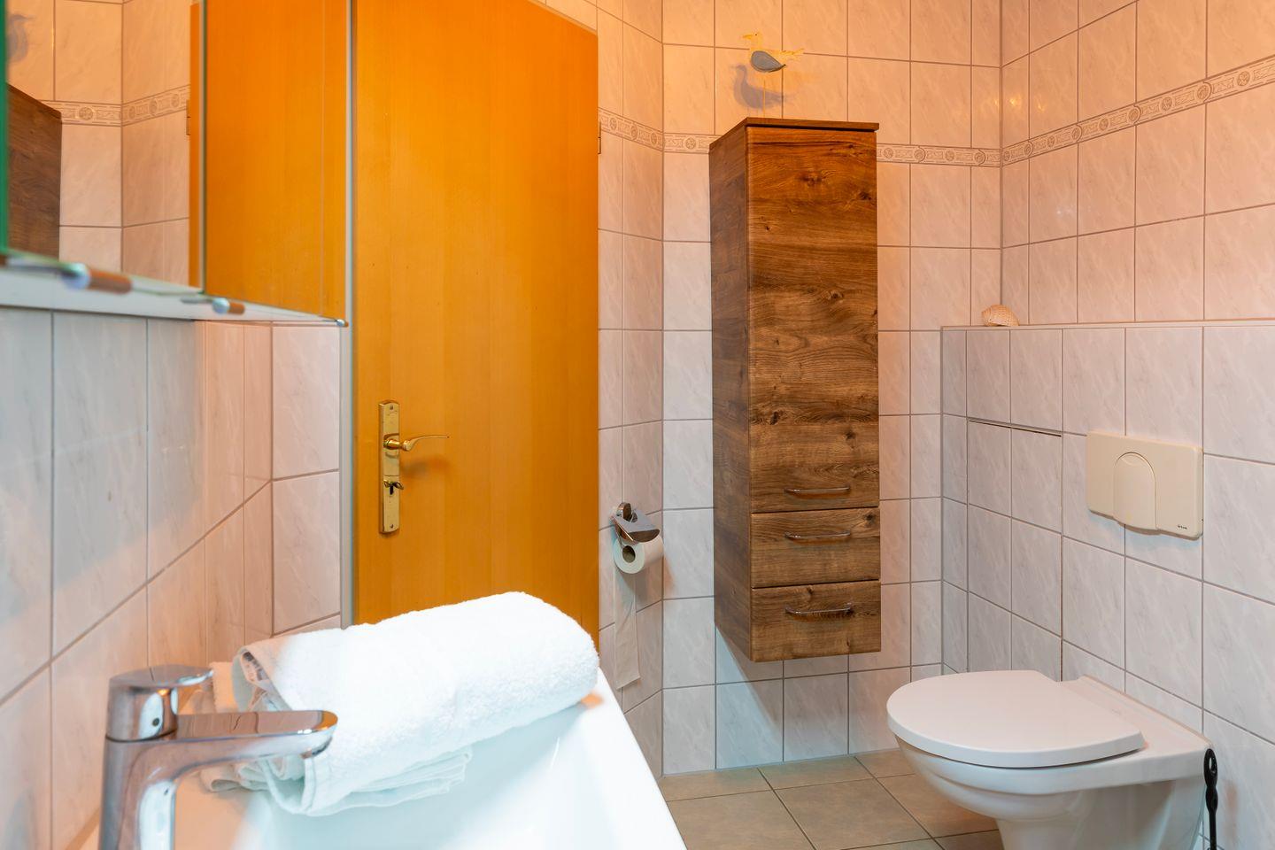 Das Badezimmer verfügt über eine Dusche, Haartrockner und Kosmetikspiegel, zusätzlich ist ein separates Gäste-WC vorhanden. Allergikerfreundliche Gestaltung sowie Fliegengitter an den Fenstern sorgen für bestmöglichen Schutz und Wohlbefinden. WLAN ist selbstverständlich verfügbar.