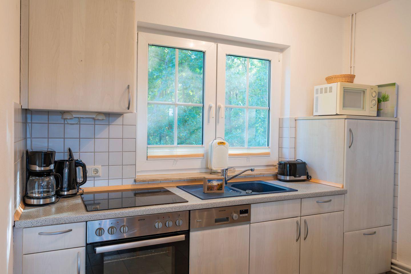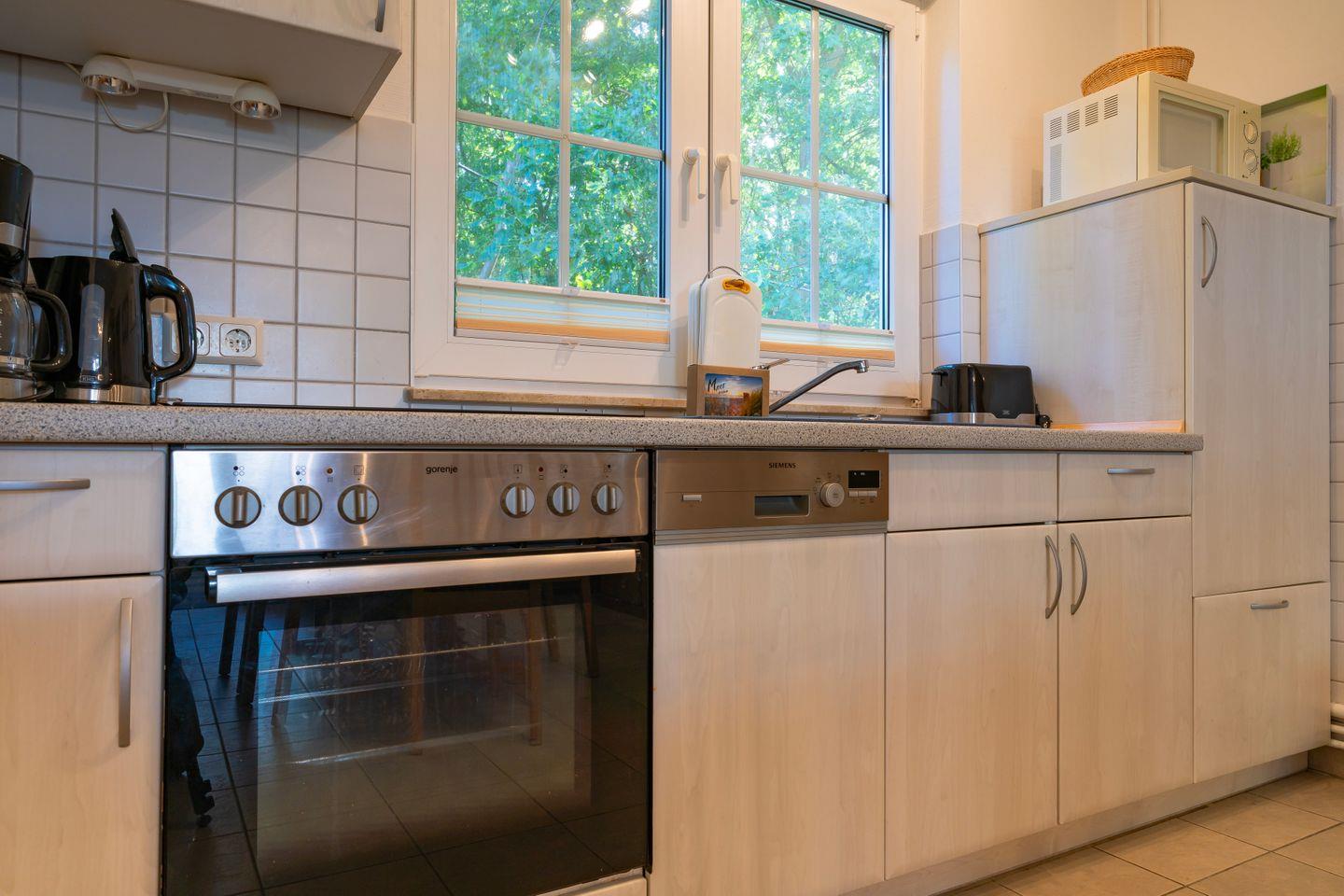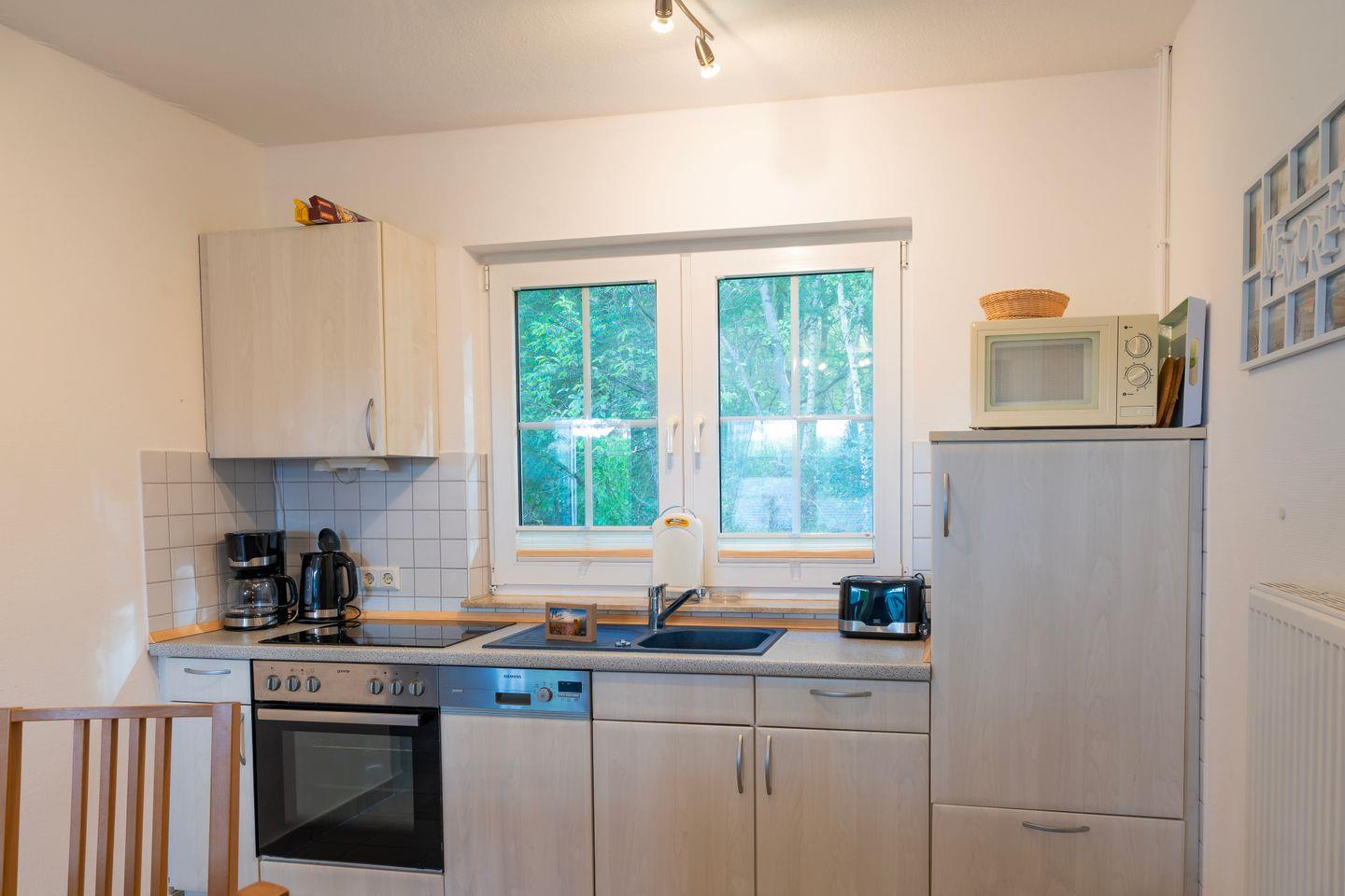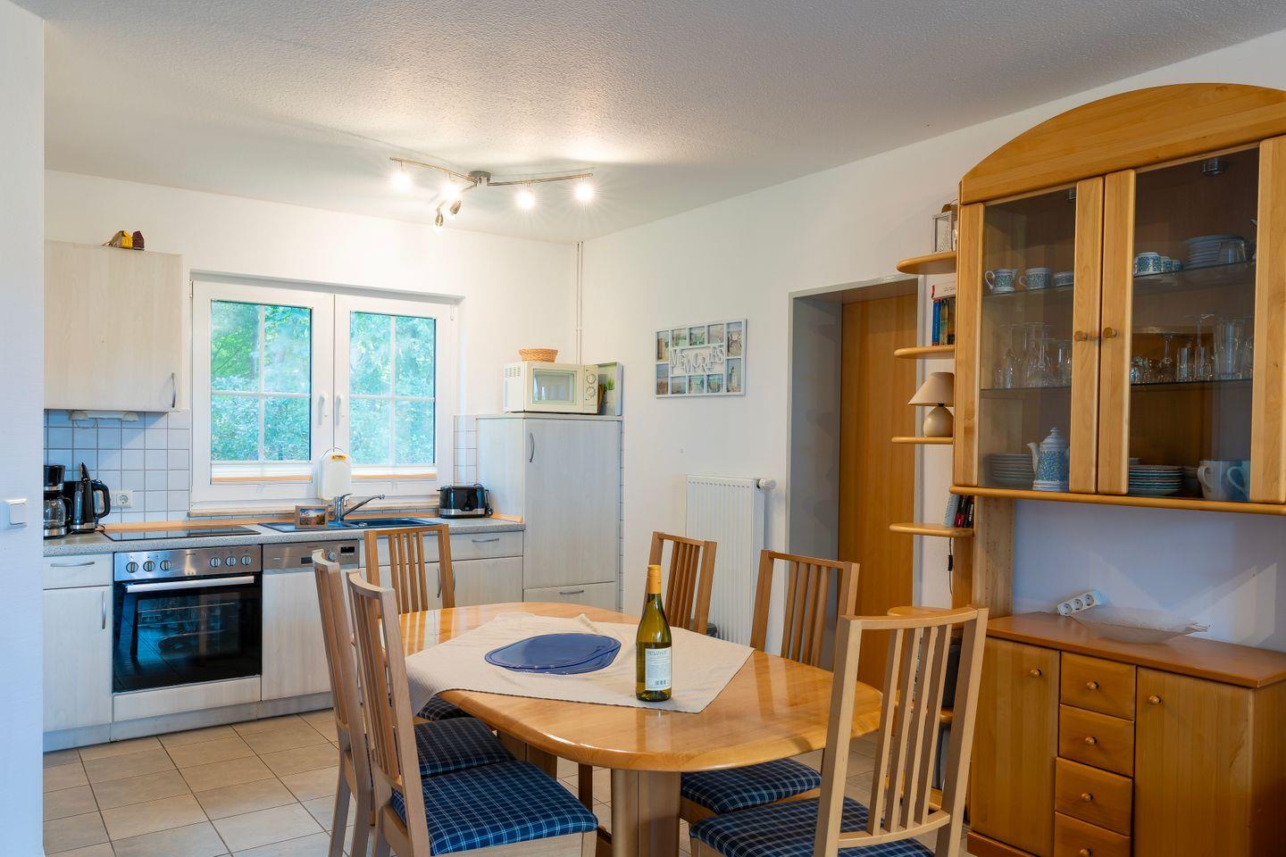 Die offene Küche bietet Ihnen alle Annehmlichkeiten, die Sie von einem komfortablen Ferienhaus erwarten: eine Spülmaschine, Kühlschrank mit Gefrierfach, Ceranherd, Backofen, Kaffeemaschine, Wasserkocher, Toaster sowie umfangreiches Geschirr und Küchenutensilien stehen zur Verfügung. Ein separater Essbereich mit großem Tisch lädt zu gemeinsamen Mahlzeiten ein.
