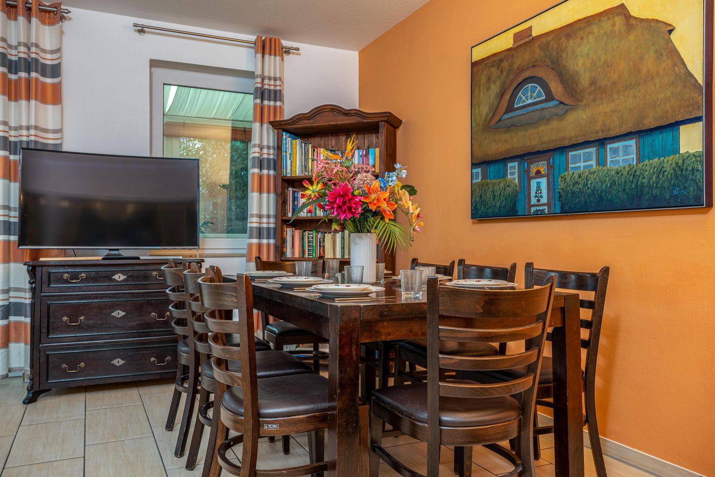 Das Feriendomizil Wiesenhaus lädt zum Urlaub in Zingst ein. Die Unterkunft bietet Platz für 8 Personen. In der unteren Etage befindet sich das gemütliche Wohnzimmer mit großem Esstisch und Blick in den Gartenbereich. Zwei Schlafzimmer sind mit Doppelbetten ausgestattet und zwei Zimmer mit jeweils 2 Einzelbetten. Die große Terrasse und der schöne Gartenbereich lädt zum Entspannen ein. Den wunderschönen Strand von Zingst ist nur 1300 Meter entfernt und bequem per Fuß zu erreichen.