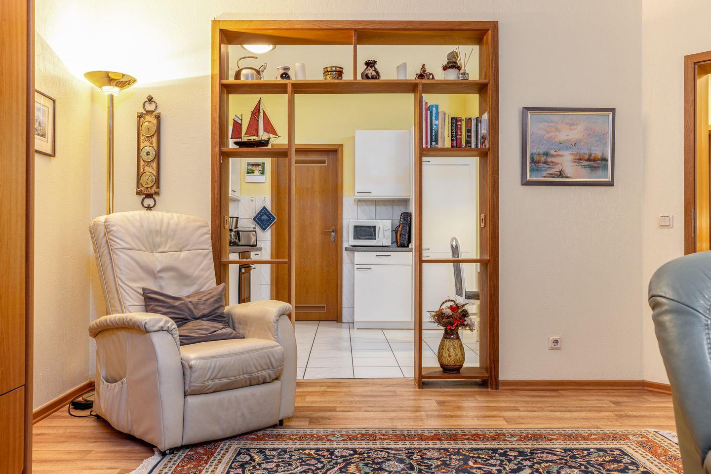 Diese 85 qm große Erdgeschosswohnung wird für 2 Personen angeboten. Über den Eingangsflur mit Garderobe gelangen Sie in das Wohnzimmer und von dort direkt auf die 26 qm große Terrasse. Diese ist zum Teil überdacht und lädt zum Entspannen ein. Alle Fenster haben Außenjalousien (teils elektrisch). Das Schlafzimmer mit einem separaten Fernseher ausgestattet. Die Wohnung ist zentral gelegen und Sie sind in einer Minute am wunderschönen Strand von Zingst.