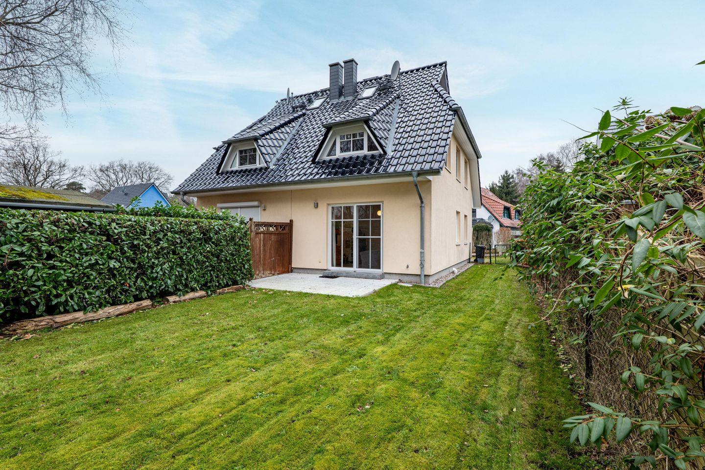 Der vollständig abgeschlossene Garten lädt zum Ausspannen ein. Gartenmöbel stehen im Gartenhaus bereit, das sich zudem ideal zum Unterstellen von Fahrrädern eignet.